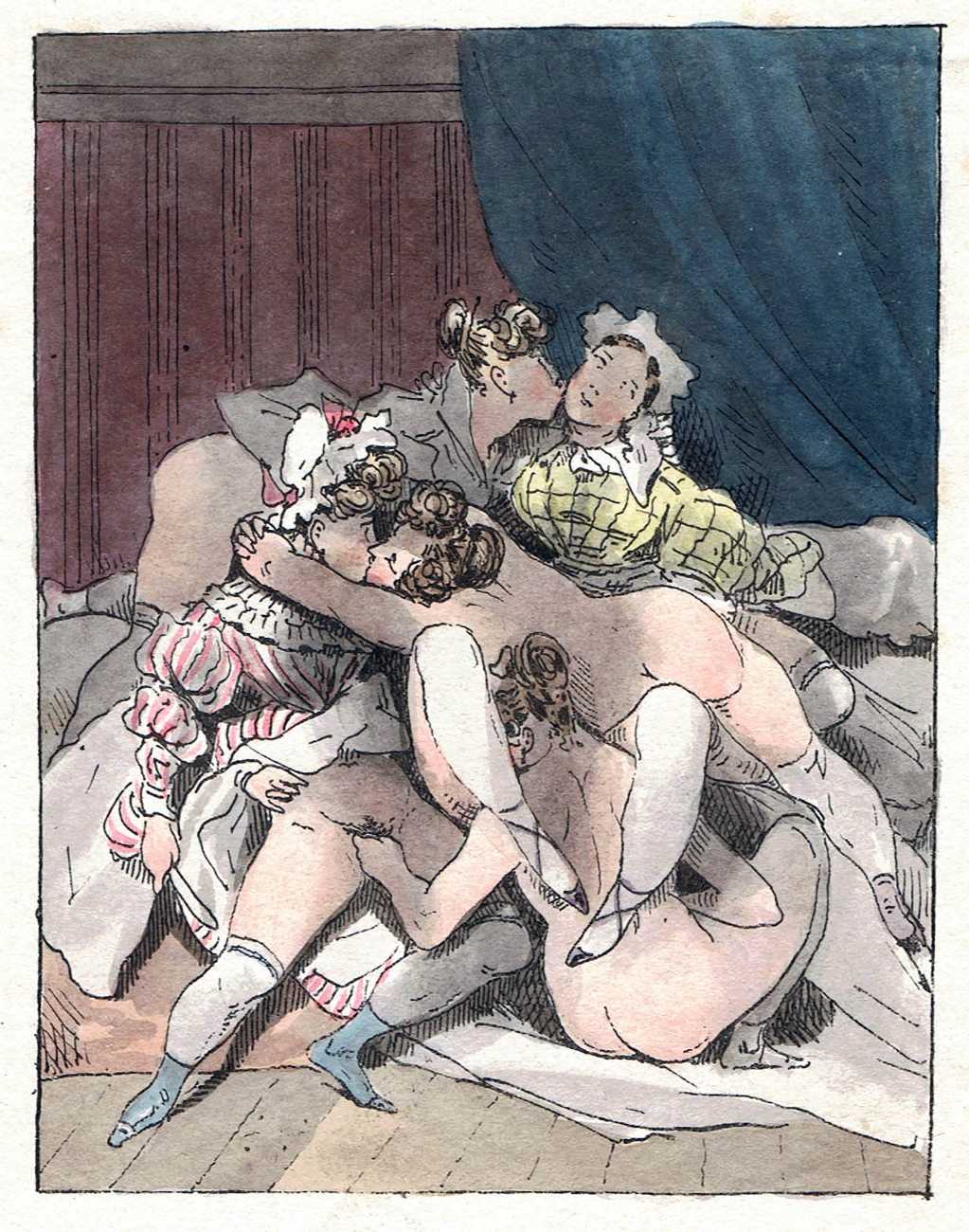 What is particularly noticeable about Monnier’s erotic images is that they are entirely believable scenes of sexual exploration – the bodies are well-observed and drawn, the faces display genuine feeling, and they are mostly clearly enjoying themselves. We tend to think of the eighteenth century as a time of modesty and convention, but though these images are nearly two centuries old they remind us of the joyful nature of innocent intimate encounter, and of the natural curiosity of the participants.