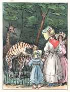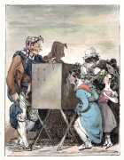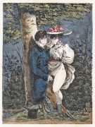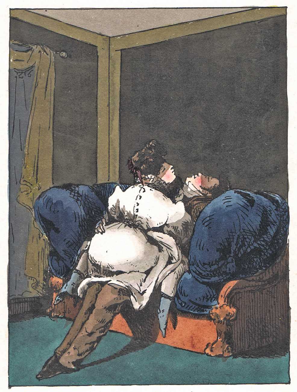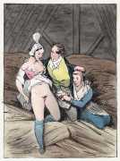 As Hans-Jürgen writes in the introduction to La bonheur (which can be ordered from his website), ‘Curiosity is the theme of the small watercolour which shows the viewer standing behind a screen. What does he see? Just crossed legs. But we can tell from his shadow just how much what we see arouses him. The showman with the peepbox also benefits from the voyeurism of his curious female visitors: they look excitedly into exotic possibilities. Sexual curiosity is the source of all enlightenment, even for the little girl who looks carefully at the two zebras in the zoo. What does the mother reply to her innocently-asked question? A stocky Aphrodite raises her veil in front of the student who is amazed at her curves, awakening his desire. Is it the mother of the bride who, half hidden by the curtain, follows the loveplay of the young couple with greedy eyes? What is her left hand doing? And the scene which shows the gentleman in a yellow vest with two naive playmates in the hayloft is also about observing: they look in amazement at the strange self-erecting structure that escapes his trousers, but he delights in the vision.’