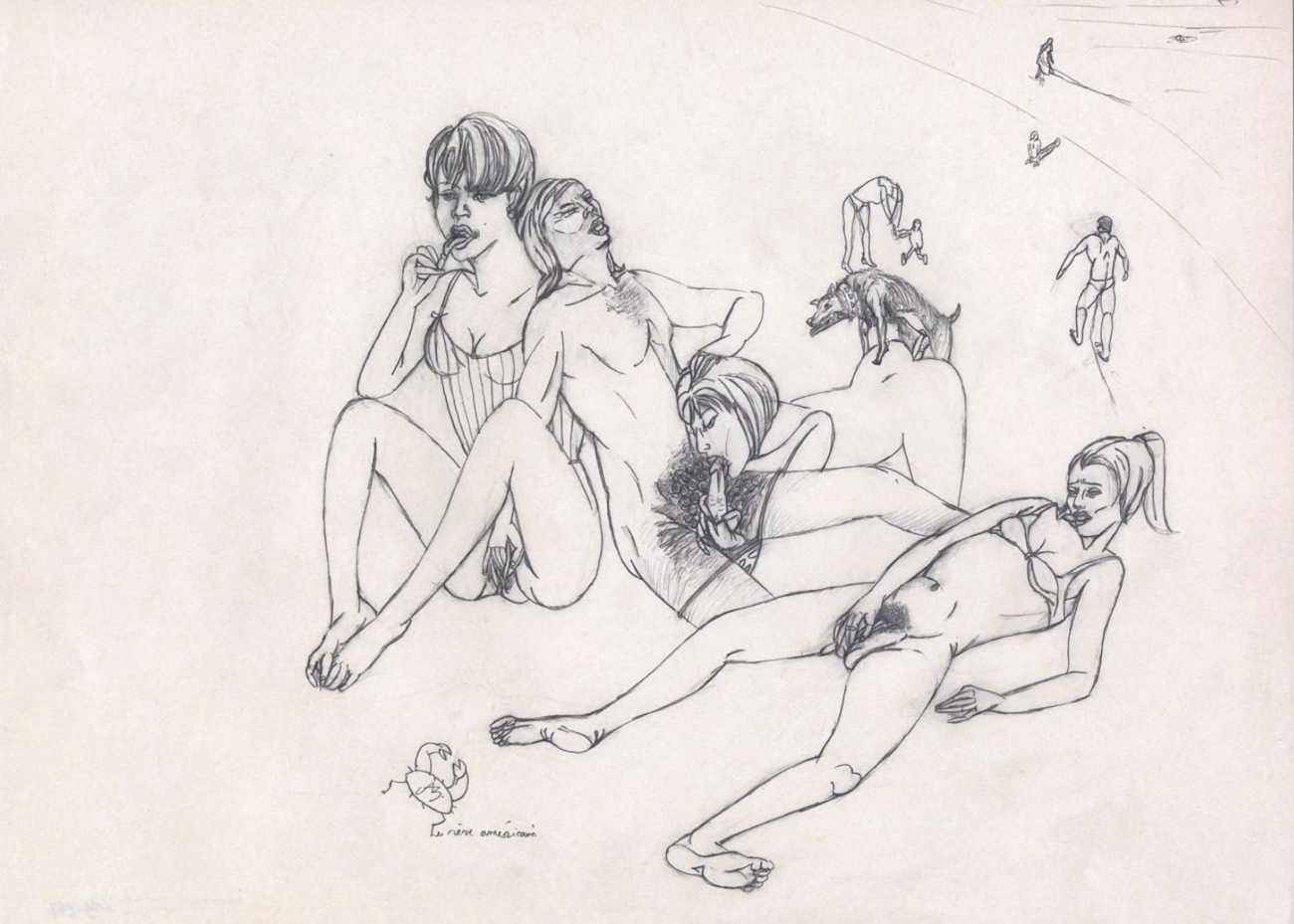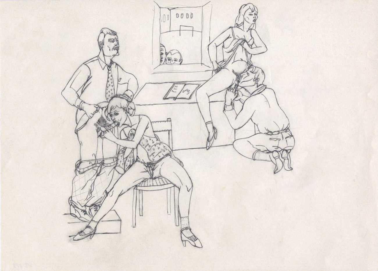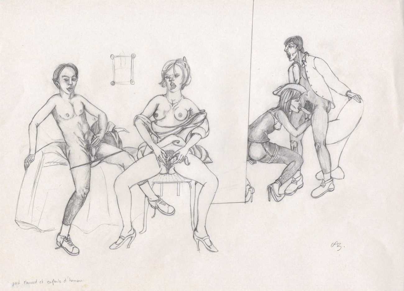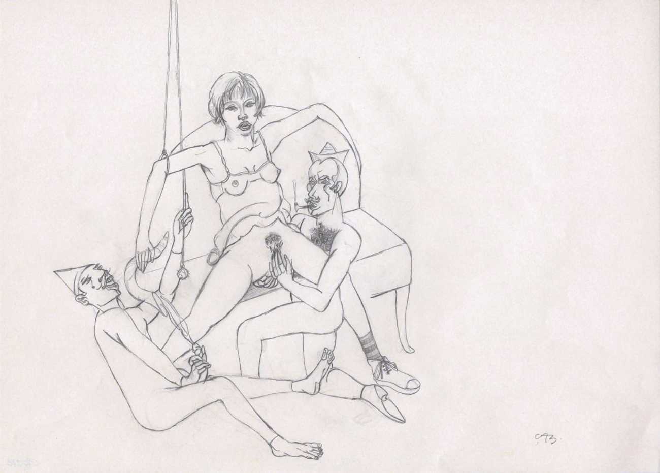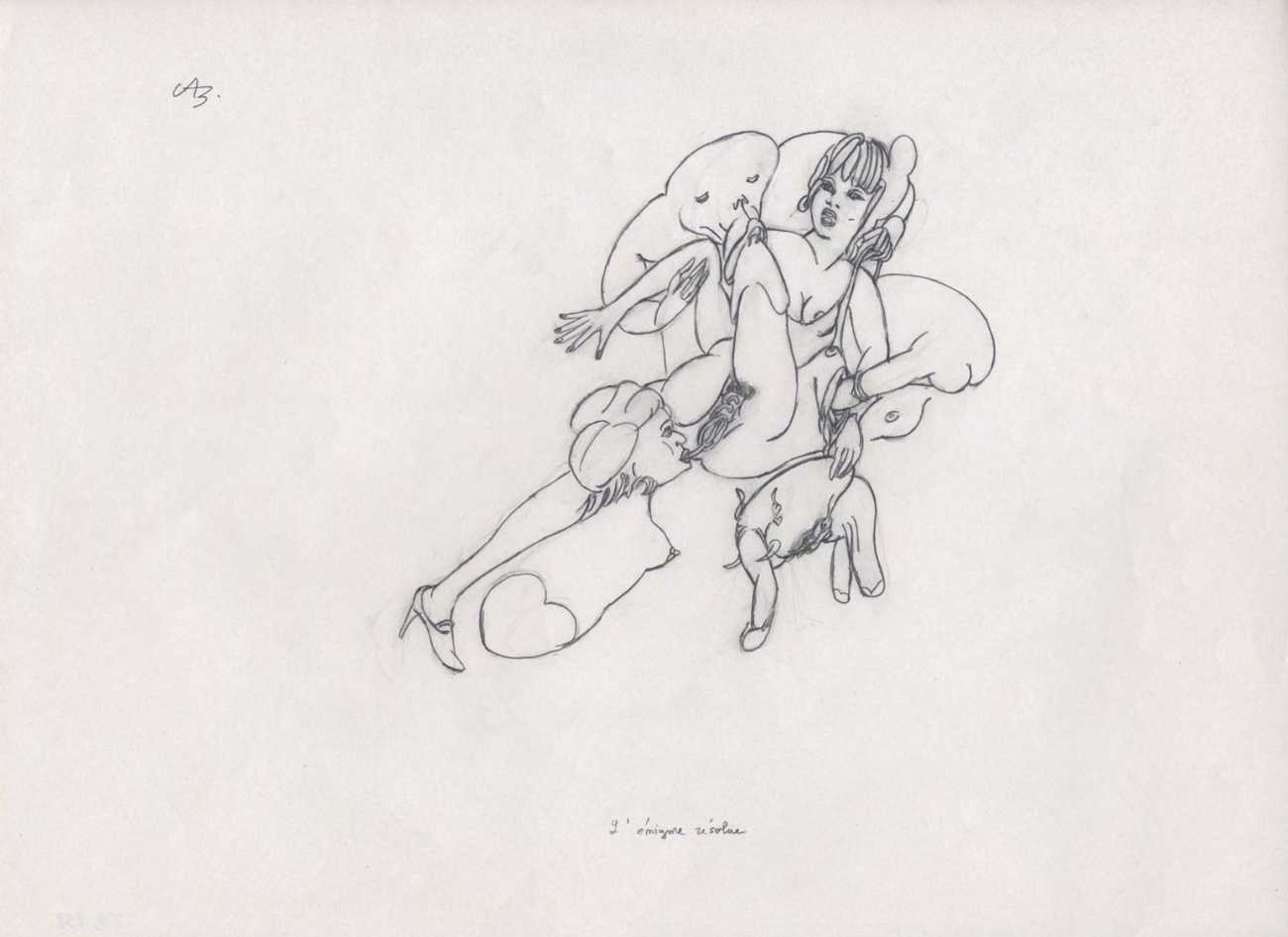 ‘Turpitude’, in both French and English, means something depraved, base and vile; its synonyms include abjection, corruption, debasement, debauchery, decadence, degeneracy, degradation, dissipation and perversion. When this portfolio of twenty-two drawings appeared in a French auction of ‘curiosa’ in January 2021 it appeared in three lots, each bearing the title of one of the drawings’ captions with the addition ‘et autres turpitudes’.