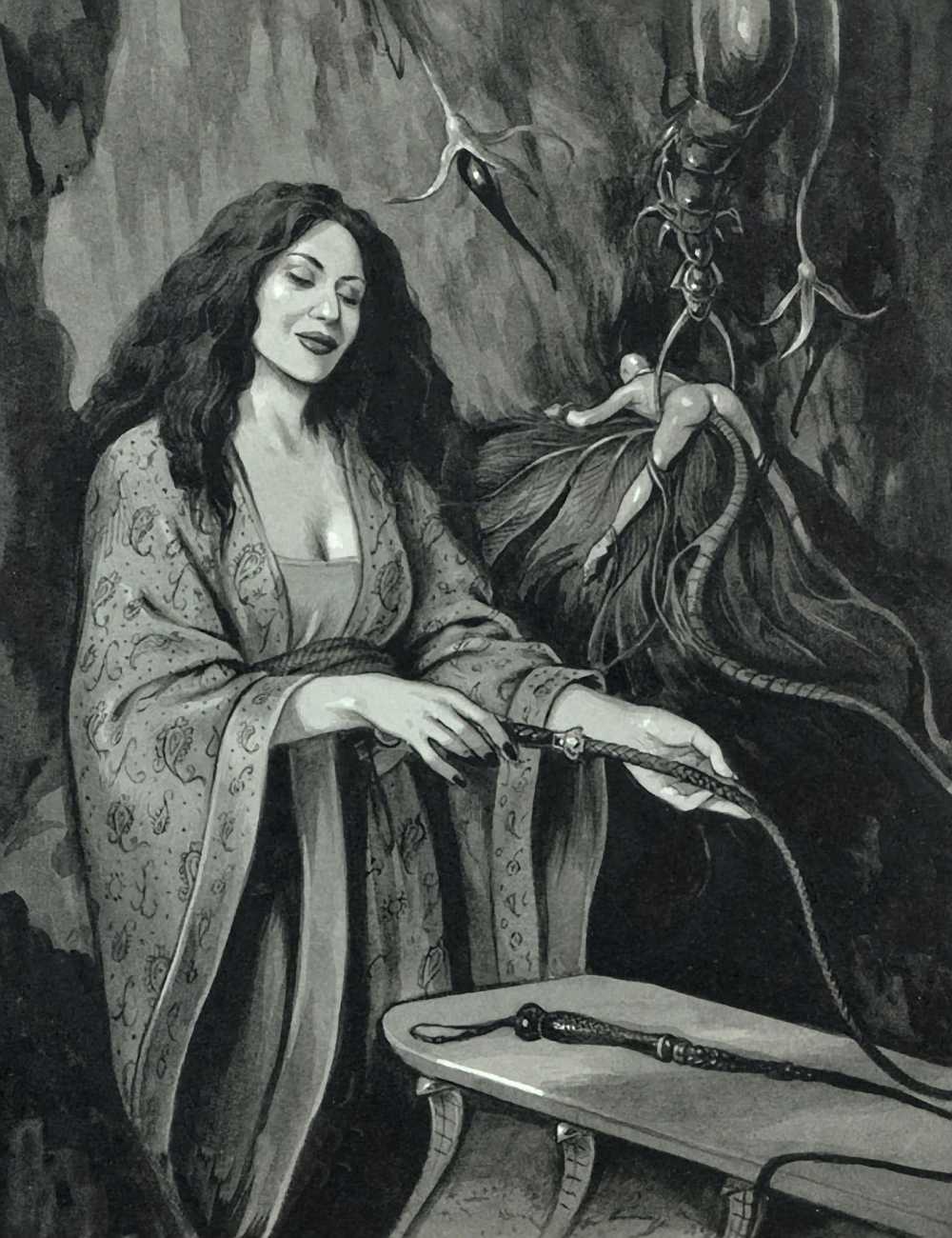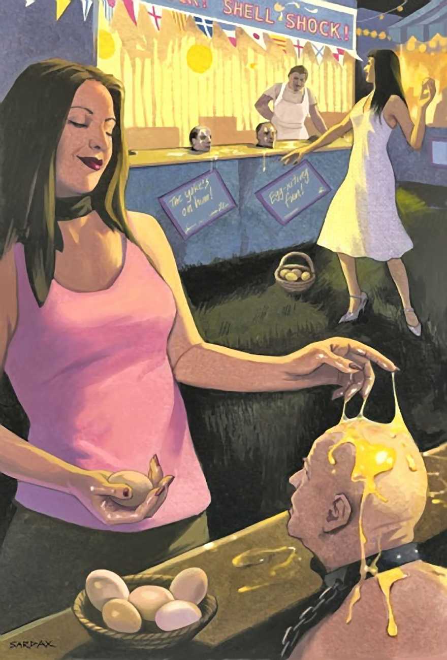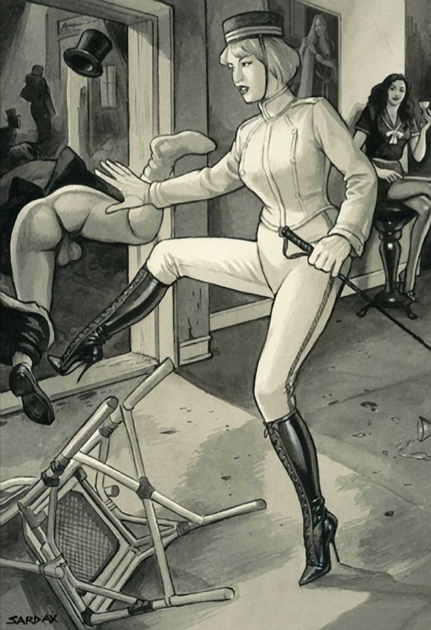 Commissions sometimes turn into a series of illustrations on a theme, giving an insight into how Sardax’s imagination can be tickled by the possibilities offered by a particular social or historic setting. Thus we include here a couple of illustrations from his ‘Funfair’ series featuring Joanna Lark, Mistress Elizabeth, Mistress Evilyne and Mistress Elita, and examples from the ‘Weimar’ series, featuring Domina Liza, Lady Lola, Mrs Weltsova and Princess Aurora. Both of these series were the result of commissions from Japanese magazines.
