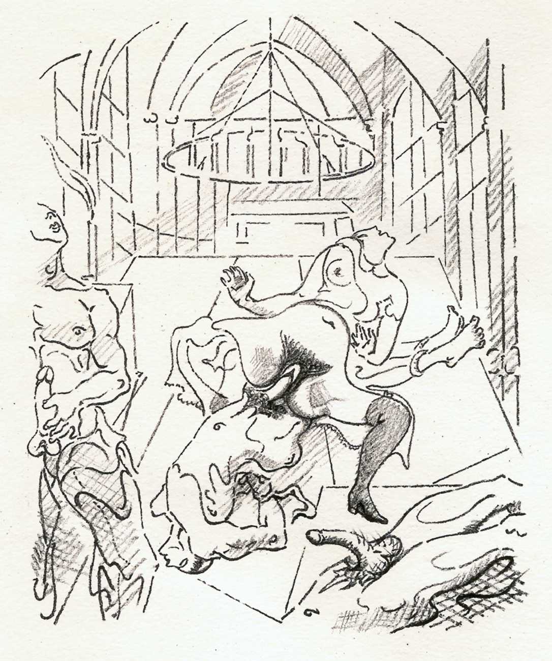 Like the text, the eight lithographs accompanying the first edition of Histoire de l’oeil were anonymous, though Masson was less concerned than Bataille about being identified. The collaboration cemented the relationship between author and artist; for reasons linked to their respective life experiences, the two men shared the same questioning, tinged with fascination, about human cruelty. Masson’s images for Histoire de l’oeil are nervous and tormented, complementing Bataille’s study of eroticism and perversion.