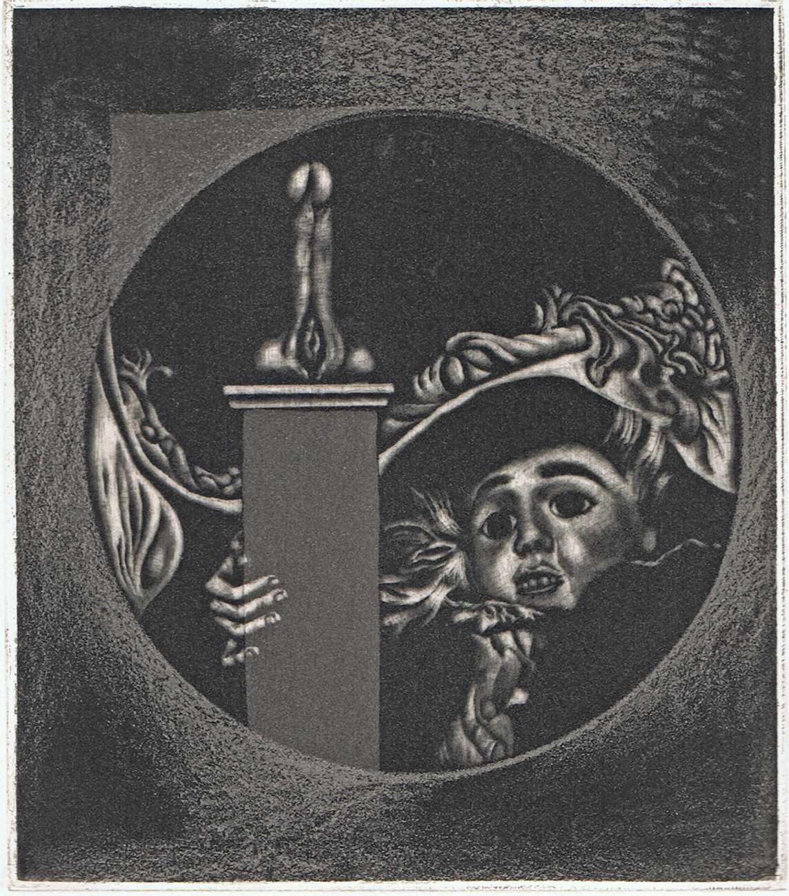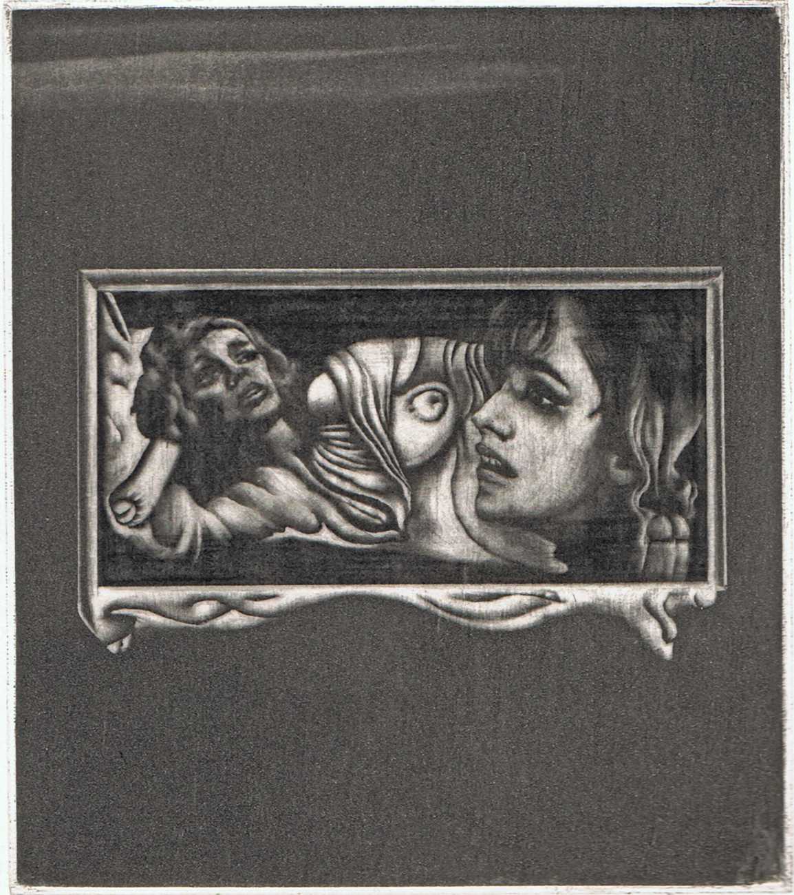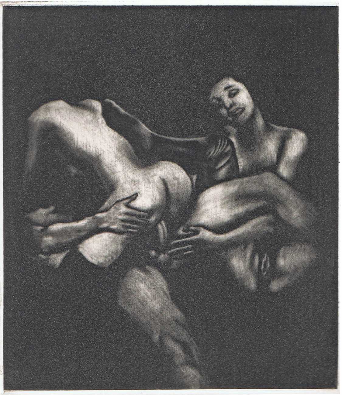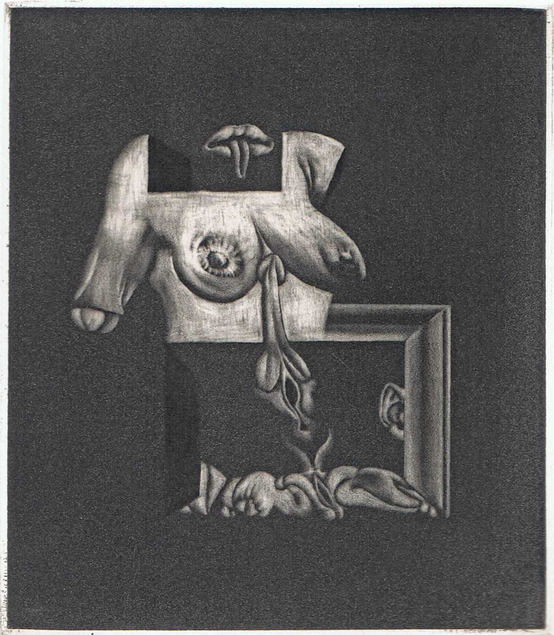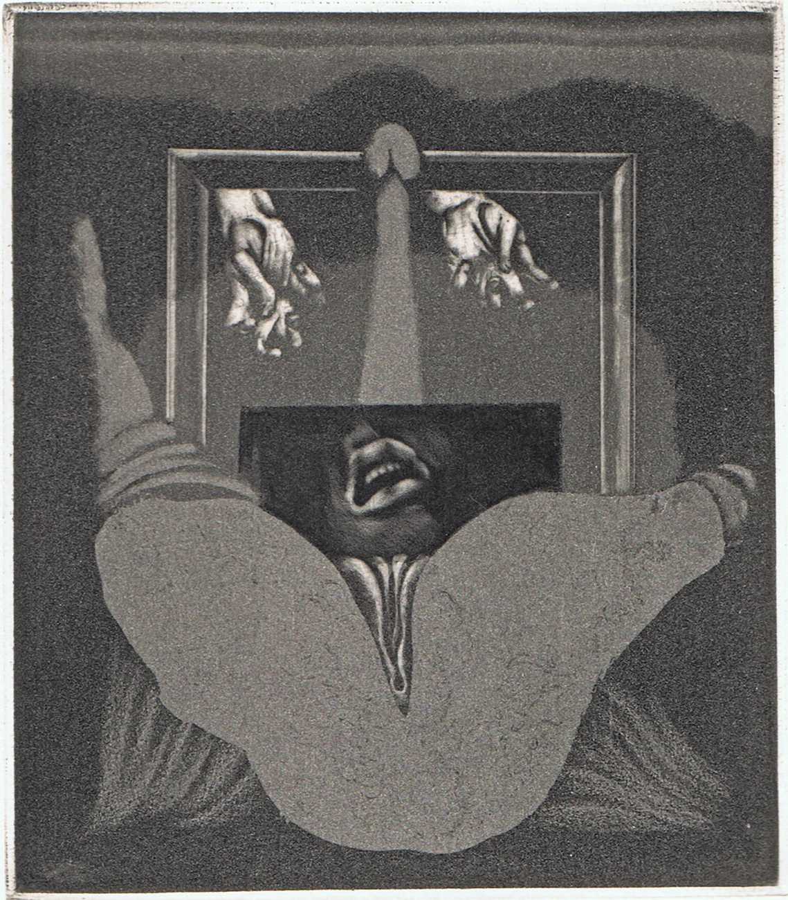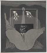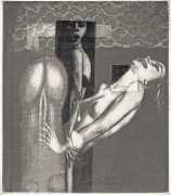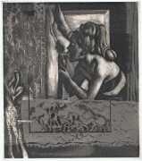 Eberhard Schlotter’s dark interpretation of Sade’s dark tale explores a monochromatic multi-layered style of engraving which he was exploring during the late 1960s, so Philosophie im Boudoir was the perfect inspirational text. The characters, often shown only by their sexual elements, appear as shadowy ghosts in an angular architecture; little is stated explicitly but much is suggested.