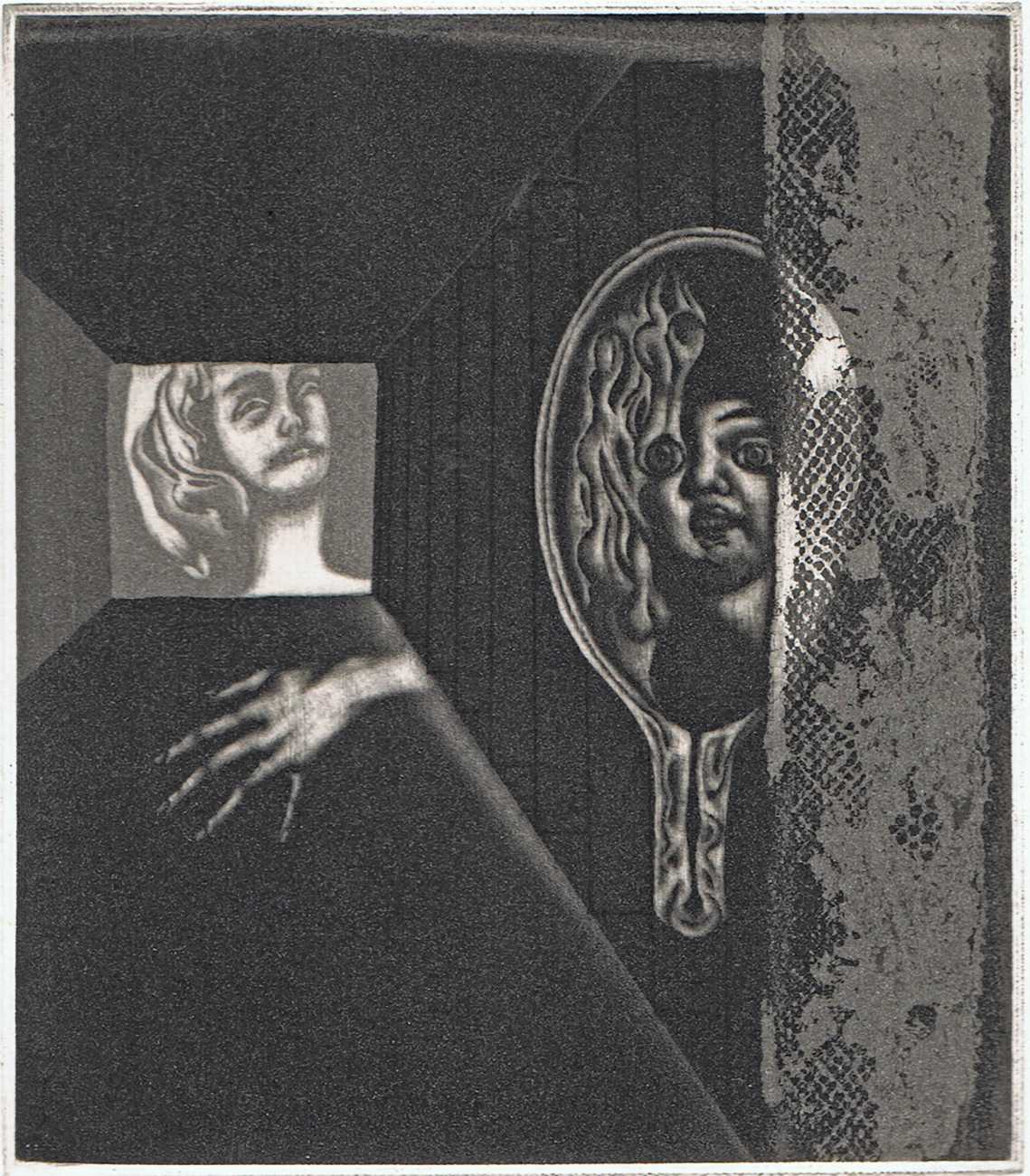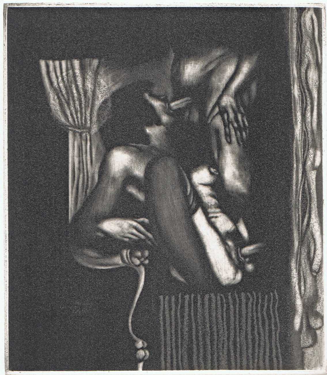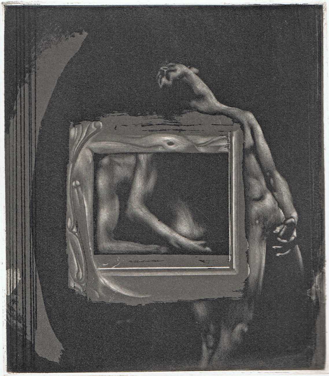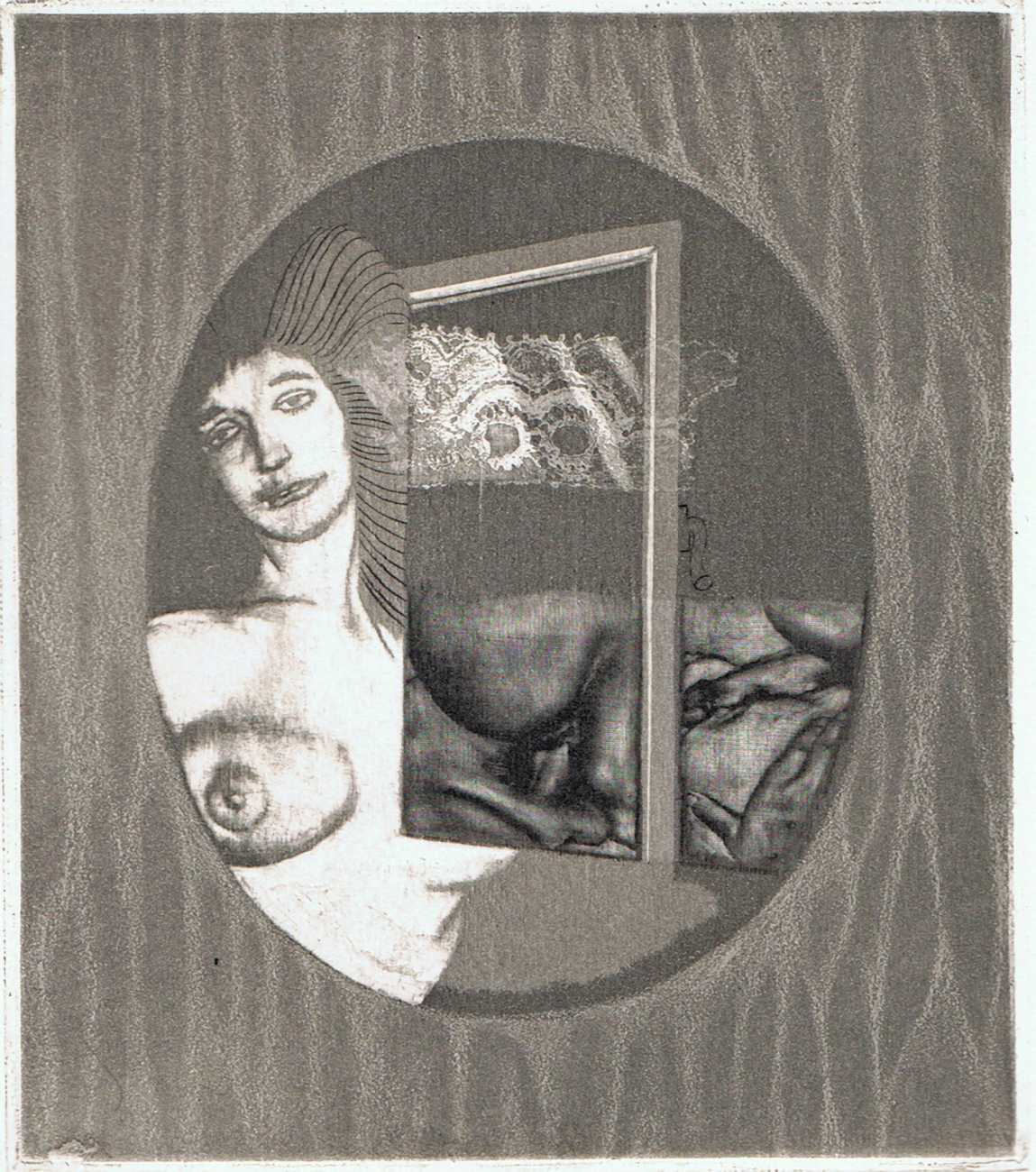 Eberhard Schlotter’s dark interpretation of Sade’s dark tale explores a monochromatic multi-layered style of engraving which he was exploring during the late 1960s, so Philosophie im Boudoir was the perfect inspirational text. The characters, often shown only by their sexual elements, appear as shadowy ghosts in an angular architecture; little is stated explicitly but much is suggested.