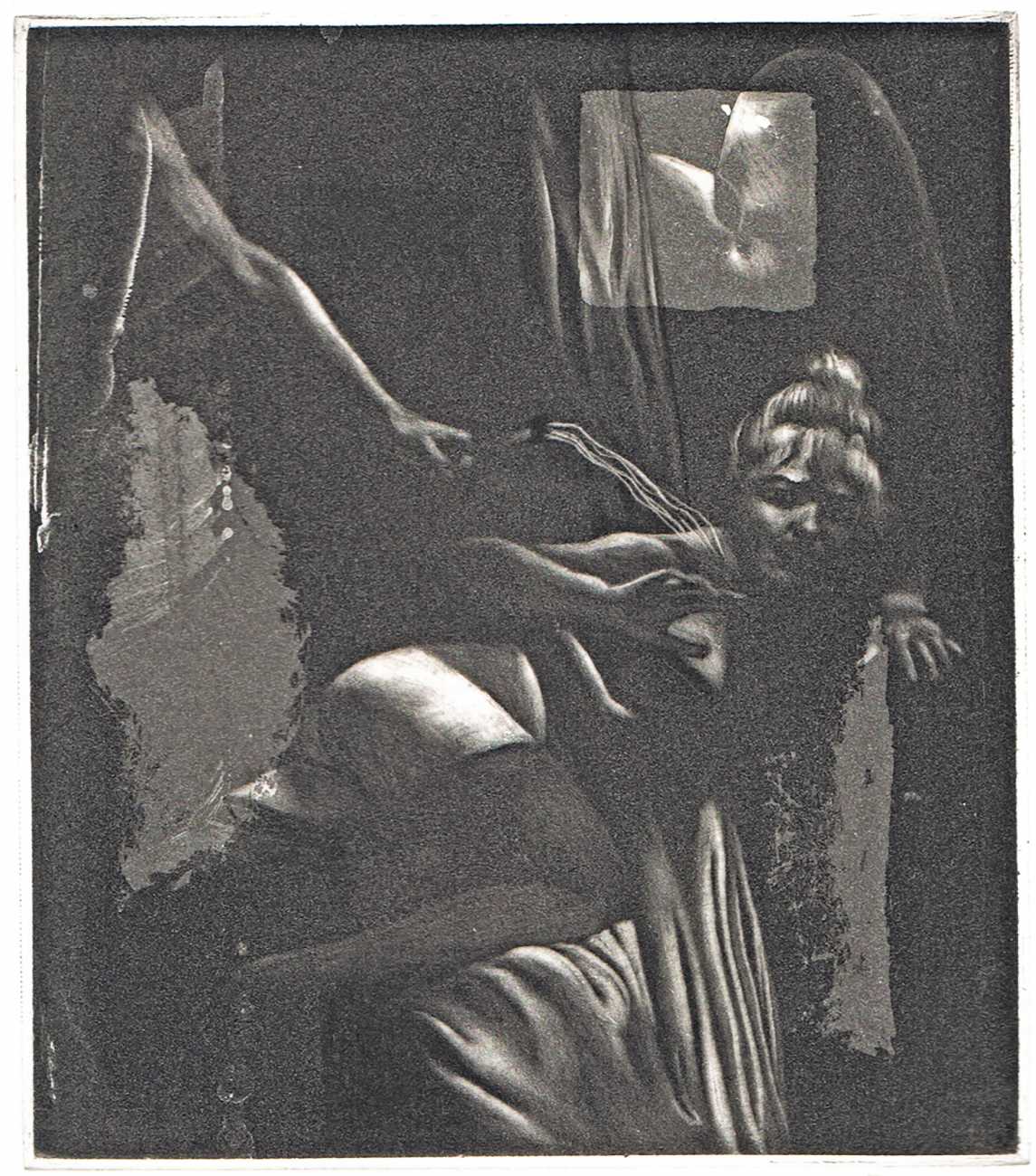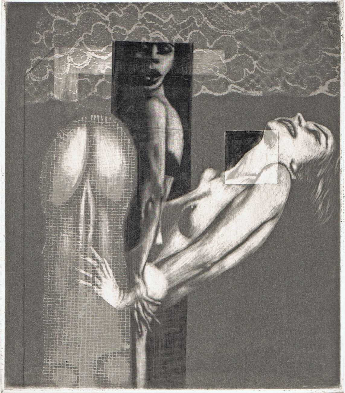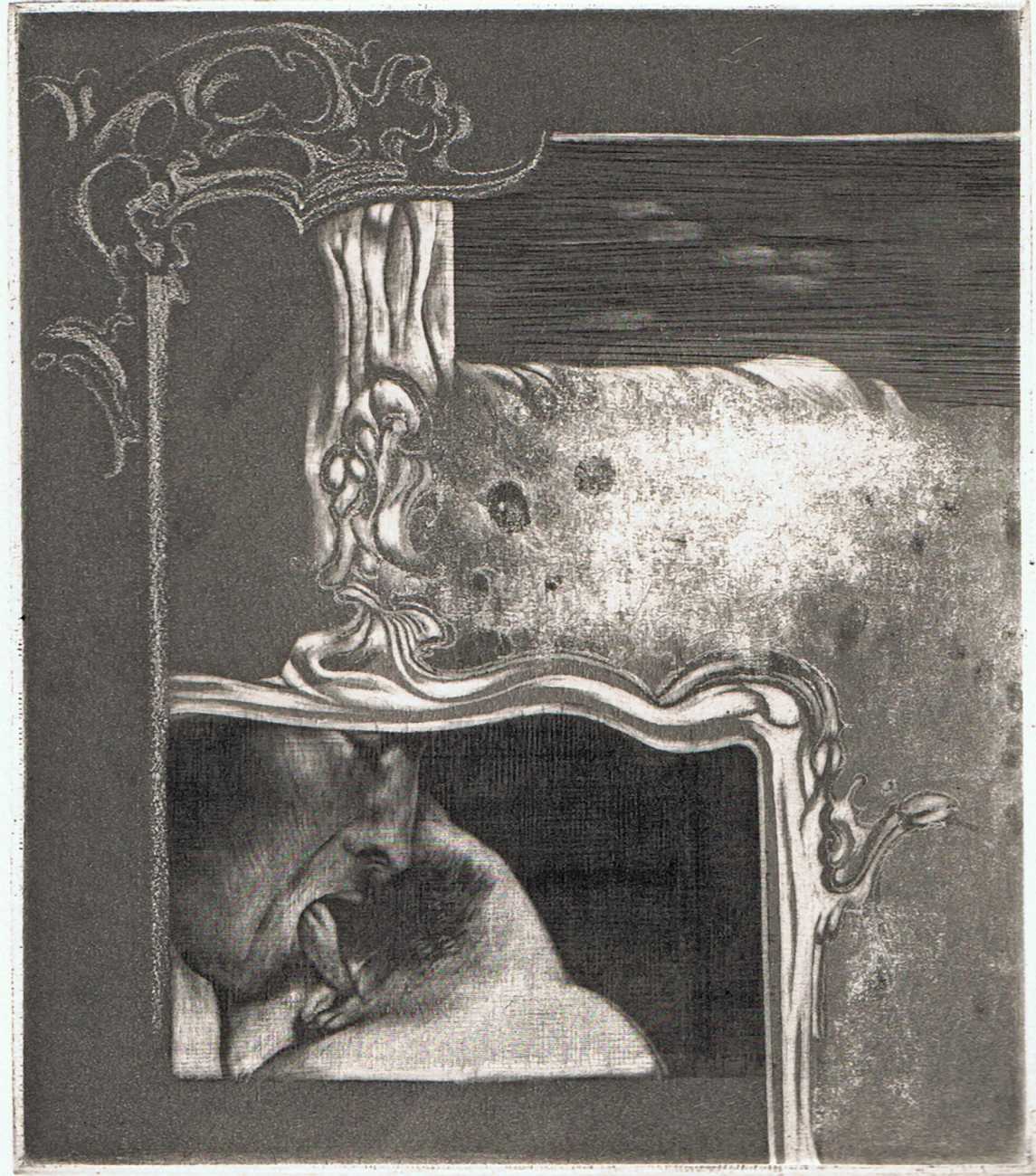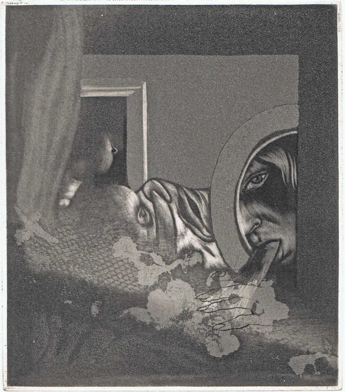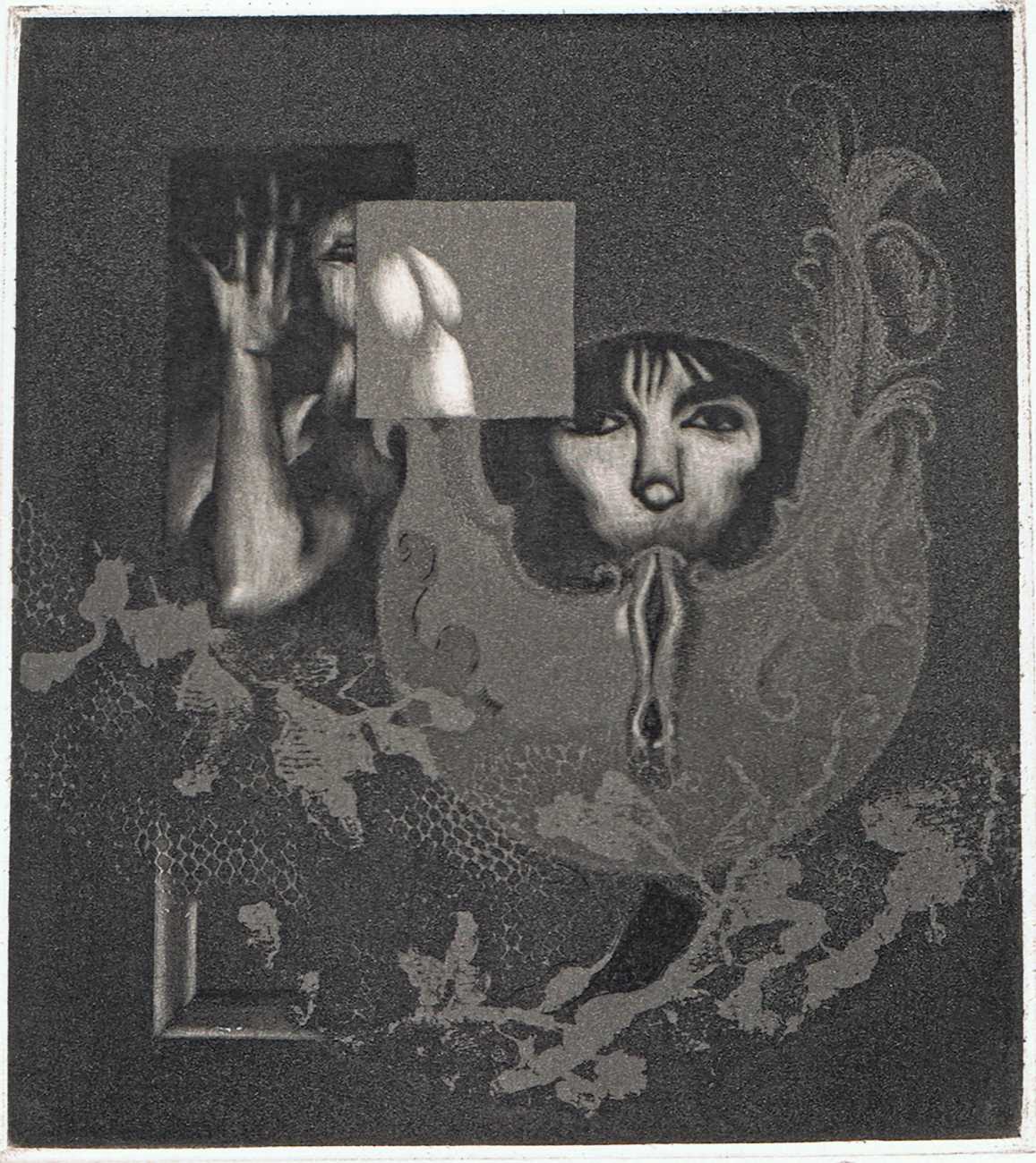 Eberhard Schlotter’s dark interpretation of Sade’s dark tale explores a monochromatic multi-layered style of engraving which he was exploring during the late 1960s, so Philosophie im Boudoir was the perfect inspirational text. The characters, often shown only by their sexual elements, appear as shadowy ghosts in an angular architecture; little is stated explicitly but much is suggested.
