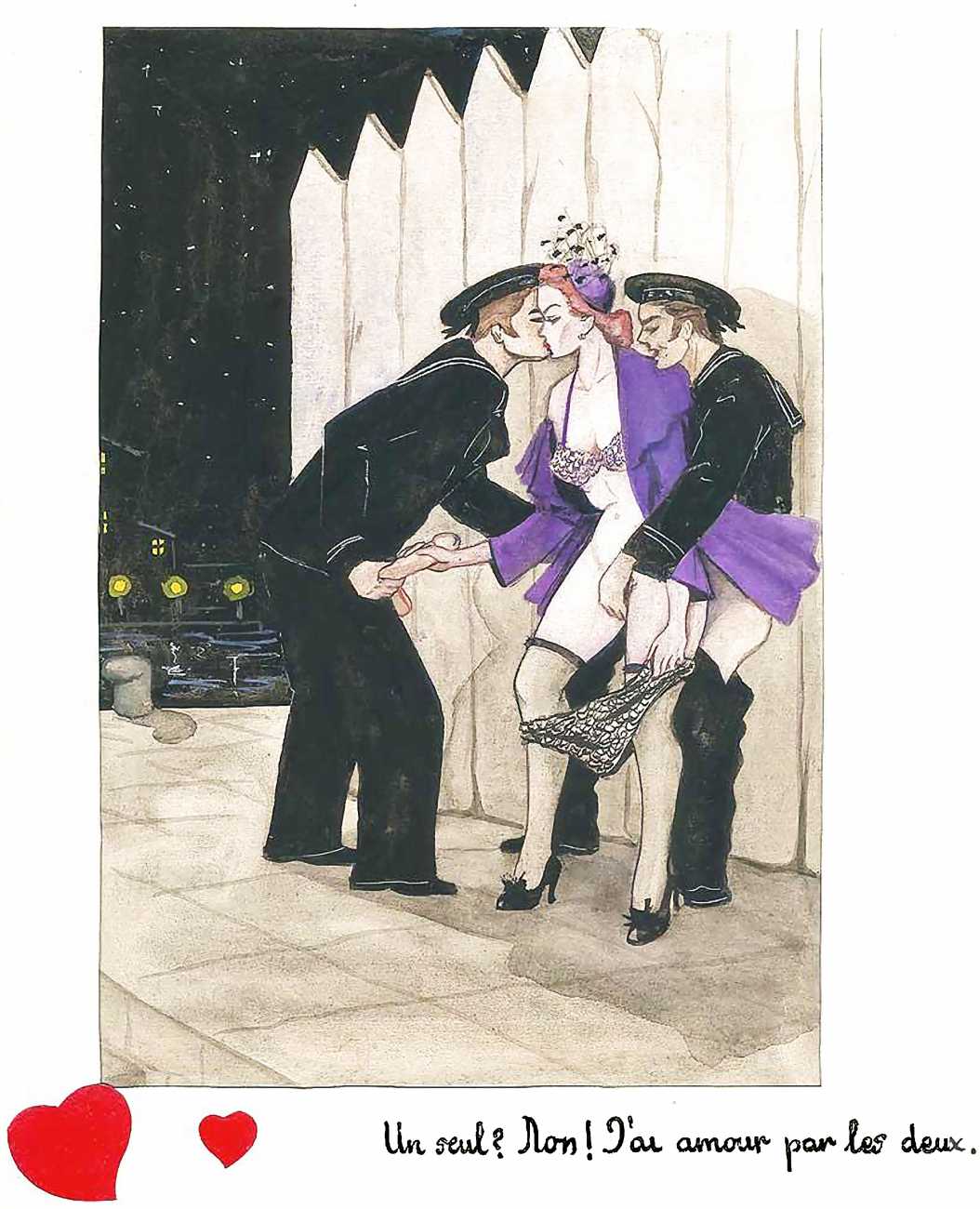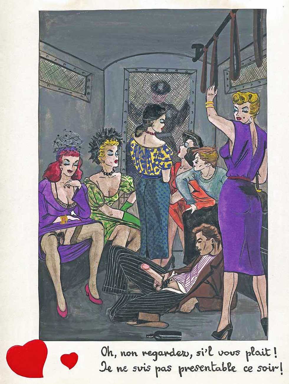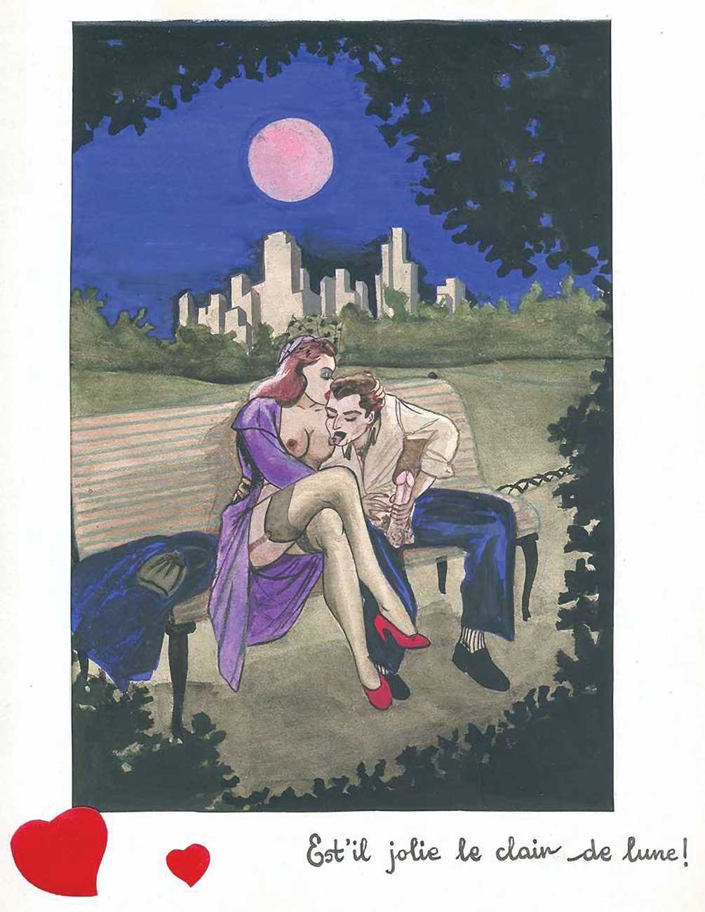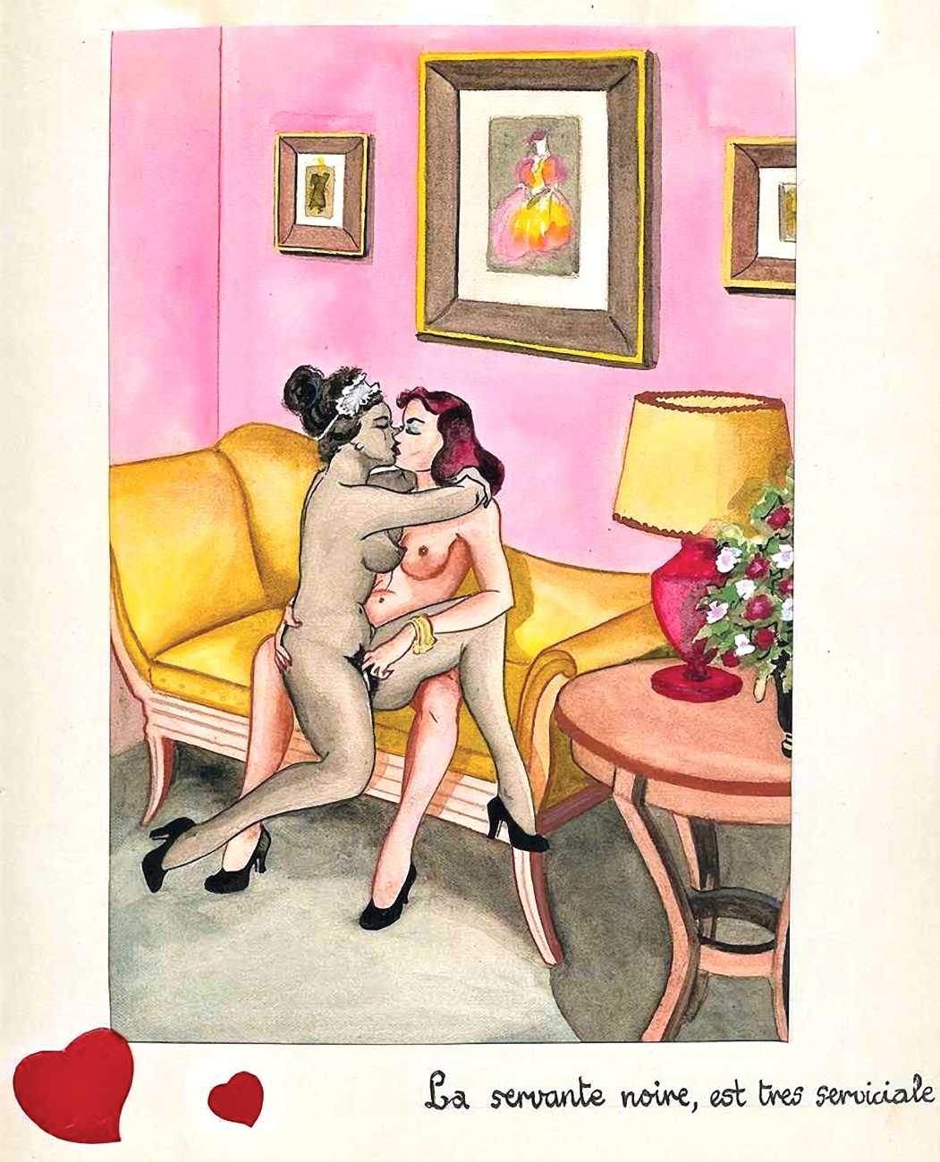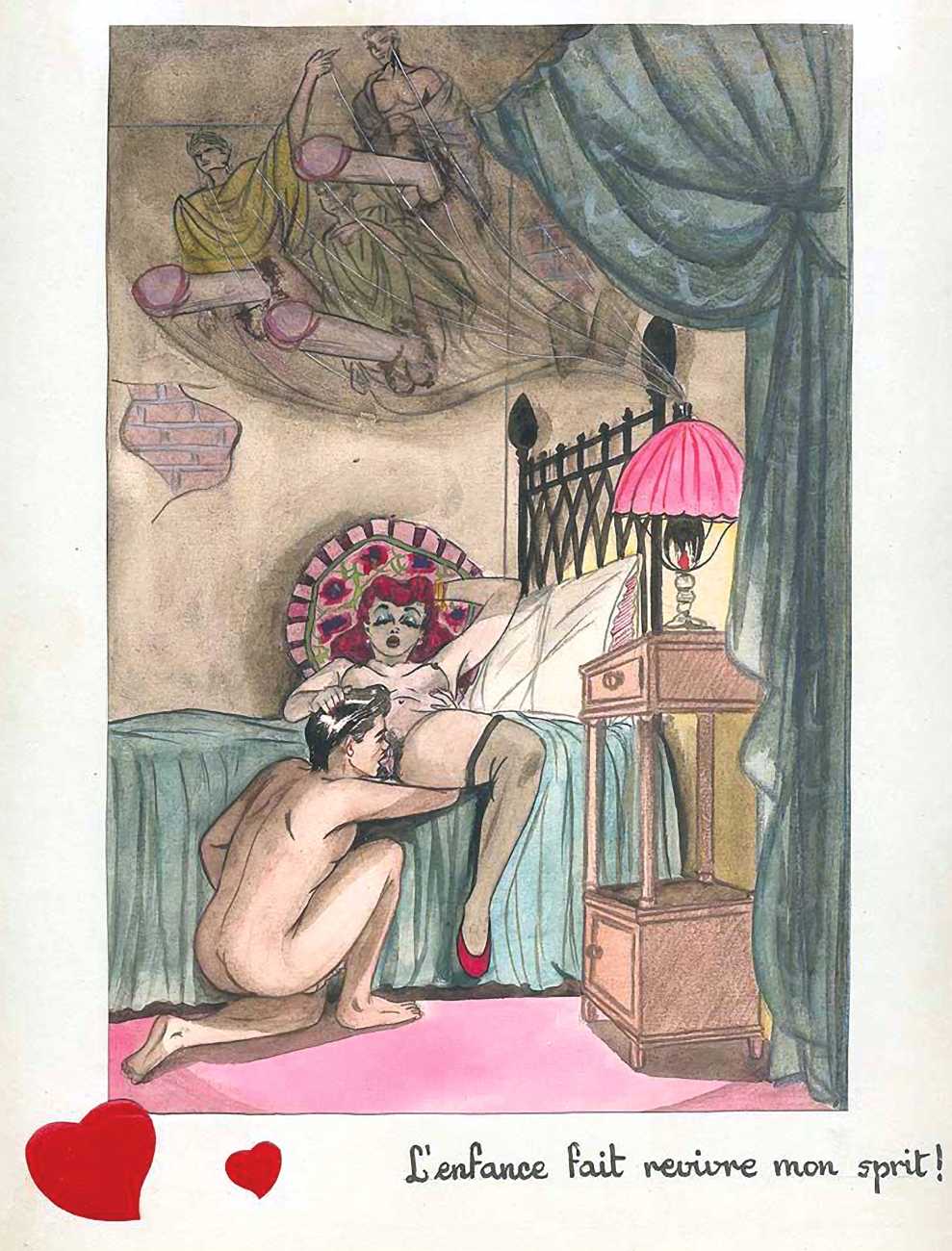 The hairstyles, record player and Vogue covers place the portfolio firmly in the latter 1950s, and the quality is very good for a (presumably) talented amateur artist. As well as the sexual experimentation there is also a touch of humour, as Michel explores the contents of his lover’s purse as she declares undying love.