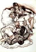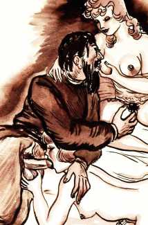 Játék Rasputinnal: Öt Erotikus Jelenet (Playing with Rasputin: Five Erotic Scenes) continues Székely’s theme throughout the 1940s of imagining famous characters in sexual settings, here Grigori Yefimovich Rasputin, the Russian mystic and self-proclaimed holy man who befriended the family of Nicholas II, the last emperor of Russia, and gained considerable influence in late Imperial Russia.