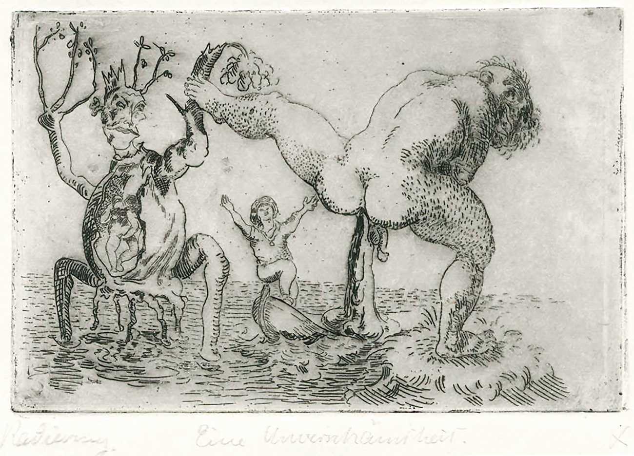 Not long after Im Garten der Liebe, Grosspietsch produced a second portfolio of erotic etchings, Scherzo, again ‘nur für einige meine Freunde’ (just for a few of my friends). Several of the etchings – Worship, Herr Doktor and Insolence for example – maybe say something about Grosspietsch’s relationship with the growing authoritarianism of late 1920s Germany.