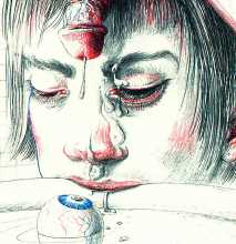 As well as drawing on the text, Gil also pays homage to Hans Bellmer’s 1947 illustrations for Histoire de l’oeil, which you can see here. There is a similar juxtaposition of the key elements in Bataille’s narrative, and the limited colour palette of black and red, contrasting with the blue of the eye, matches Bellmer’s stark style. Gil’s powerful interpretation, however, is entirely his own.