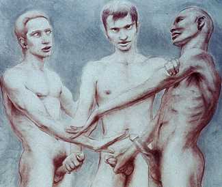 When Gil read Les 120 journées de Sodome, it was the homoerotic aspect of the text that clearly inspired this (for him) small series of images, utilising a limited colour palette to produce strong portrayals of group gay encounters which emphasise the violent aspect of Sade’s narrative.
