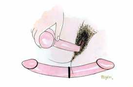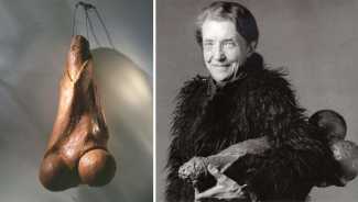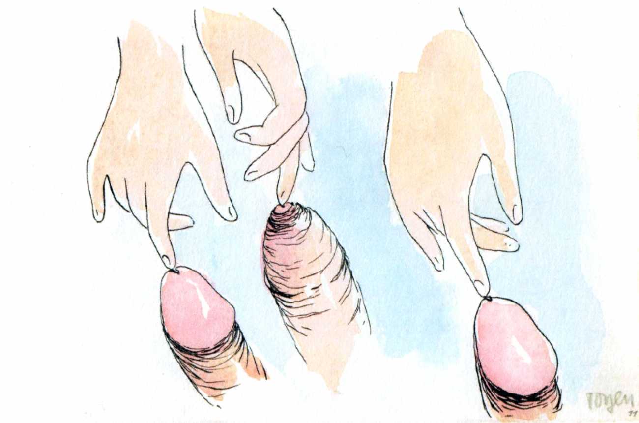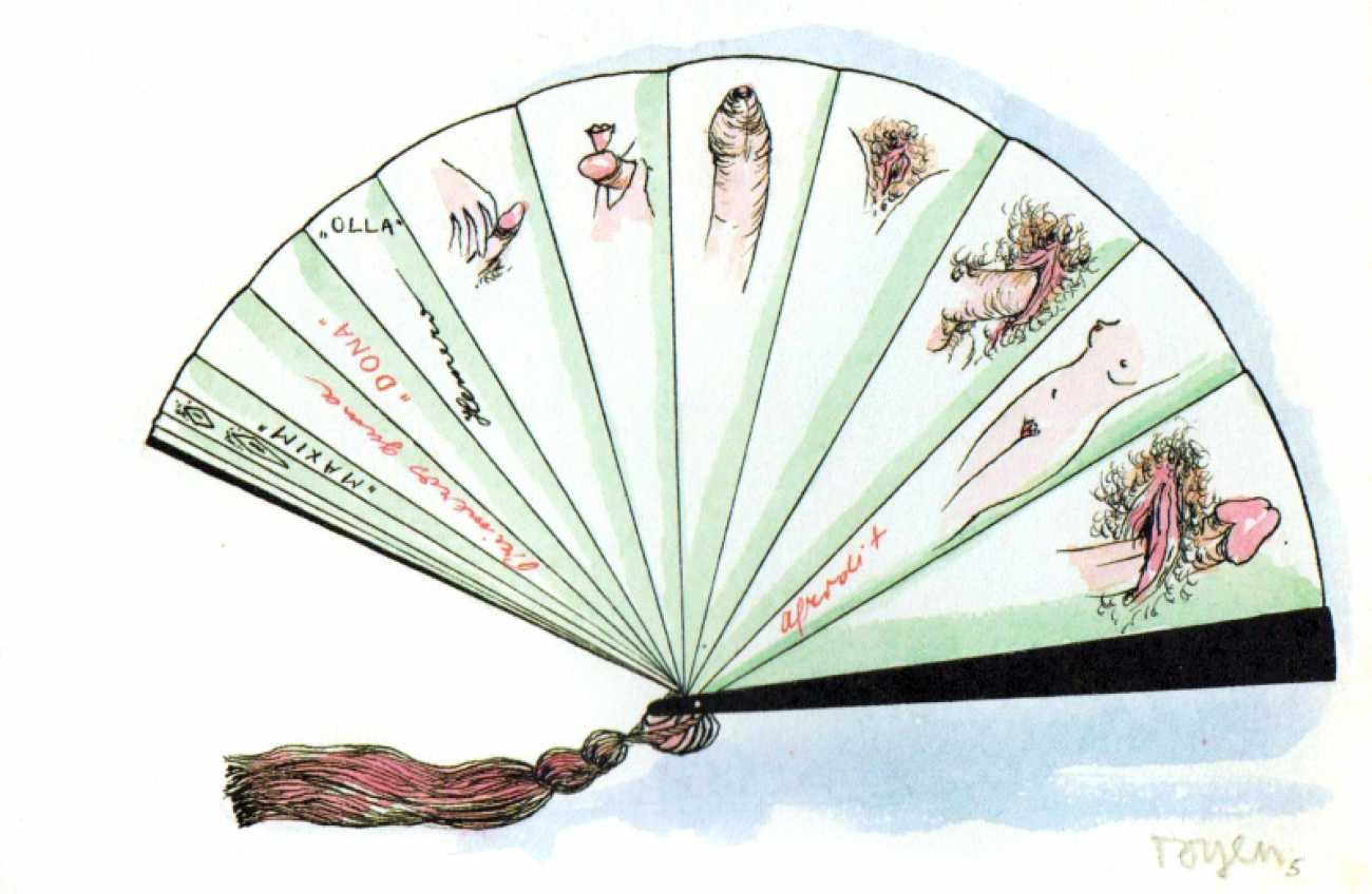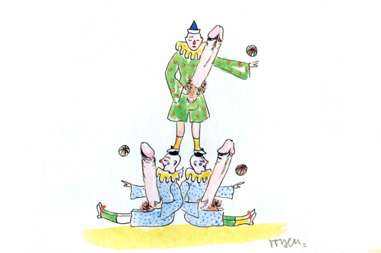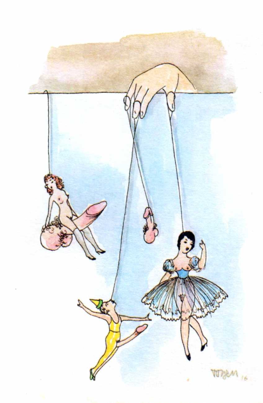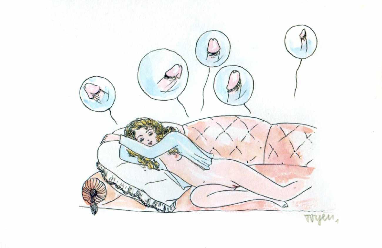 Though it cannot be said with certainty whether the drawings of Jednadvacet were predominantly intended for a man’s or a woman’s eyes, the protagonist of each drawing is almost always a woman; man is represented mostly by his genitalia, which become a fetish here. In these drawings the male genitalia can be kept in a cage, held on a glove, and watched as they ejaculate; one can dance with them or lie with them. Woman has power over the male sex organ; she appropriates it by looking at it or touching it; it becomes a piece on a chessboard, a living puppet, kept as a plaything and a trophy. Judging by the numerous depictions of male genitalia and the subject matter of the dreaming girl who appears twice in Jednadvacet (once in the introductory drawing, dedicated to daydreams, and once, in No. 20, where a girl with closed eyes appears to be dreaming she is asleep on a phallus), it seems that Toyen was acquainting her audience mainly with a woman’s experiences, for example in her drawings alluding to lesbian relationships (Nos. 4 and 21); relationships between men (with the exception of drawing No. 2 of the clowns) didn’t attract her at all. She conceived of male genitalia as a form that had become independent, separated from the rest of the body; they became an idea for her, engulfing and surpassing the female mind, turning into something a woman cannot live without. Whereas in drawing No. 1 it was only a dreamt-of object, in drawing No. 3 the male sex organ has changed into a fetish, something that gives pleasure. As is evident from other drawings in Jednadvacet (Nos. 3, 13 and 20), most depict the projection of a girl’s hidden desire for the phallus as the result of castration – the ‘penis envy’ thesis promoted by Freud and developed by Bohuslav Brouk, concerning the desire to regain an original part of one’s own body, which somebody has stolen. That is clearly illustrated in No. 13, in which a girl with closed eyes is masturbating while touching a disembodied phallus with her other hand, as if it were her booty. With their openness these drawings seem to have anticipated the extraordinary sculpture by Louise Bourgeois, which, despite its being called La Fillette (Young Girl, 1968), comprises a large penis and testicles, which seem to have been torn violently from the rest of the body and hung like a piece of meat in space, to be played with like a toy or carried under the artist’s arm (cf. Robert Mapplethorpe’s portrait of Louise Bourgeois, 1982).