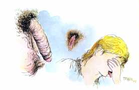 The drawing of the masturbating woman in front of the birdcage here is perhaps the prototype for the whole set of Jednadvacet. It is related to the well-known iconographic motif of the caged bird, which has for centuries been used in painting to indicate loss of virginity. The birdcage is the only clear link between the drawings of Jednadvacet and surrealism. It appears not only in Jindřich Styrský’s well-known photograph of the shattered aquarium in the series Muž s klapkami na očích (Man with Blinkers, 1934) and drawings by Toyen in her war series Střelnice (Shooting Gallery, 1939), where the cage is empty, and Schovej se válko (Hide, War!, 1944), in which the bony remains of hands hang on the bars of the cage, but is employed also in many pictures and drawings by European surrealists, in particular Magritte’s Le Thérapeute (1937), Kurt Seligmann’s drawing of a pointing hand in a cage, published in the Dictionnaire abrégé du surréalisme (1938), could to some extent also be linked with Toyen’s work where she has drawn the male genitalia in a cage instead of a bird. Though perhaps an obvious pun, this is still visually effective.