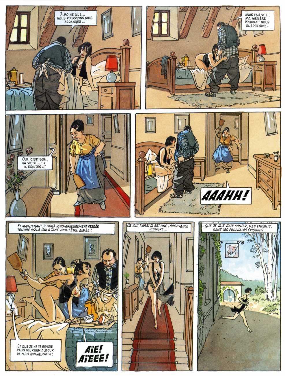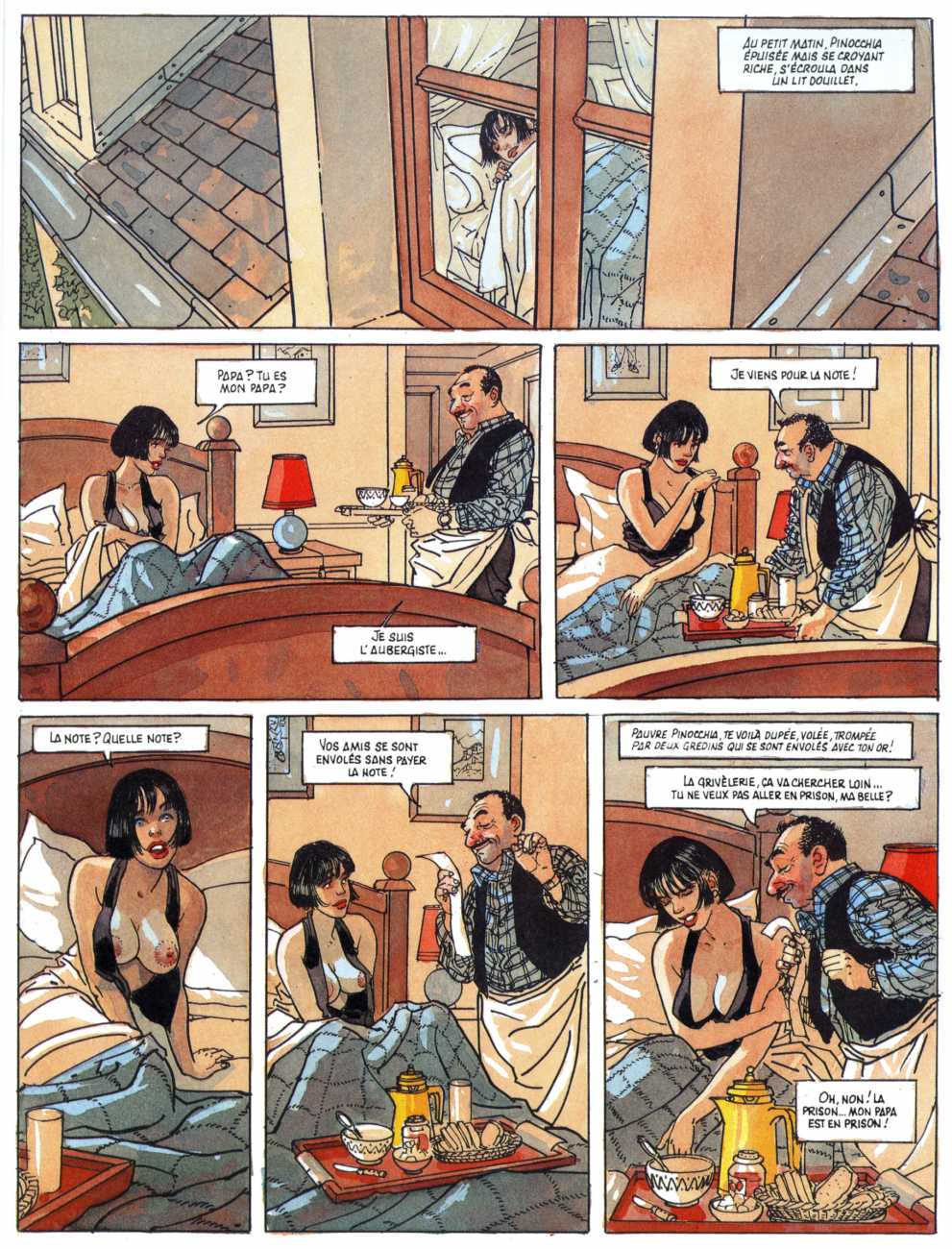 Erotic versions of well-known stories is a favourite theme for comic artists, and following the tradition of Szekely and Manara’s retellings of Gulliver, in 1995 Jean-Pierre Gibrat turned to Carlo Collodi’s 1883 story of a puppet who comes to life. In this finely-drawn interpretation, the Pinocchia character carved from a magic tree is a beautiful and perfectly-proportioned young woman, who proceeds to disrupt the lives of all she meets, especially as she is prone to calling the men she interacts with ‘daddy’. And of course she tends to wear as little as possible most of the time.