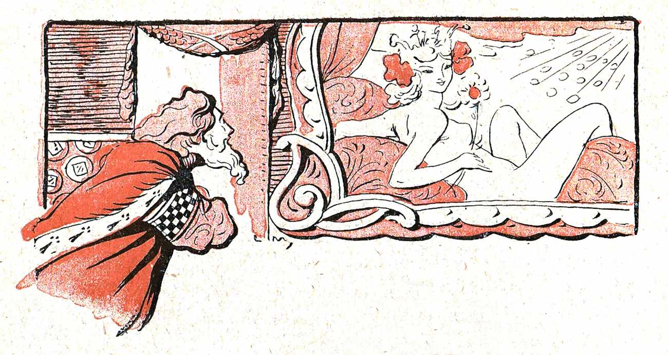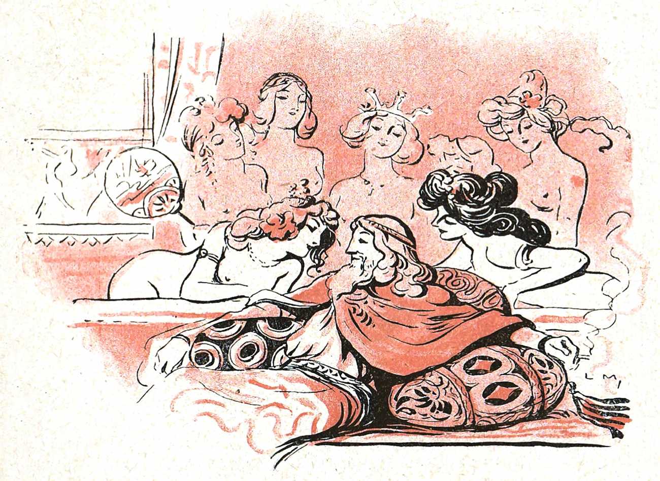 It was virtually inevitable that Métivet would be commissioned to produce a set of illustrations for Pierre Louÿs’ ever-popular Les aventures du Roi Pausole, set in the libertine realm of Tryphême where King Pausole rules with the support of his 366 wives and his wayward daughter, the fair Aline.