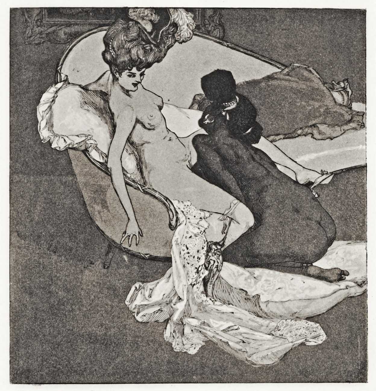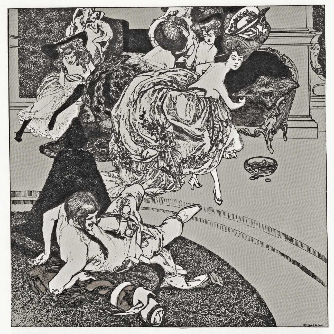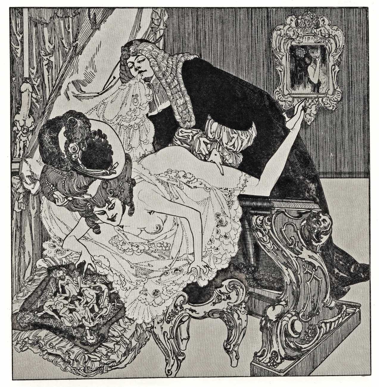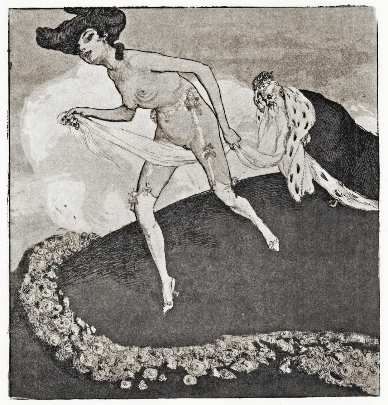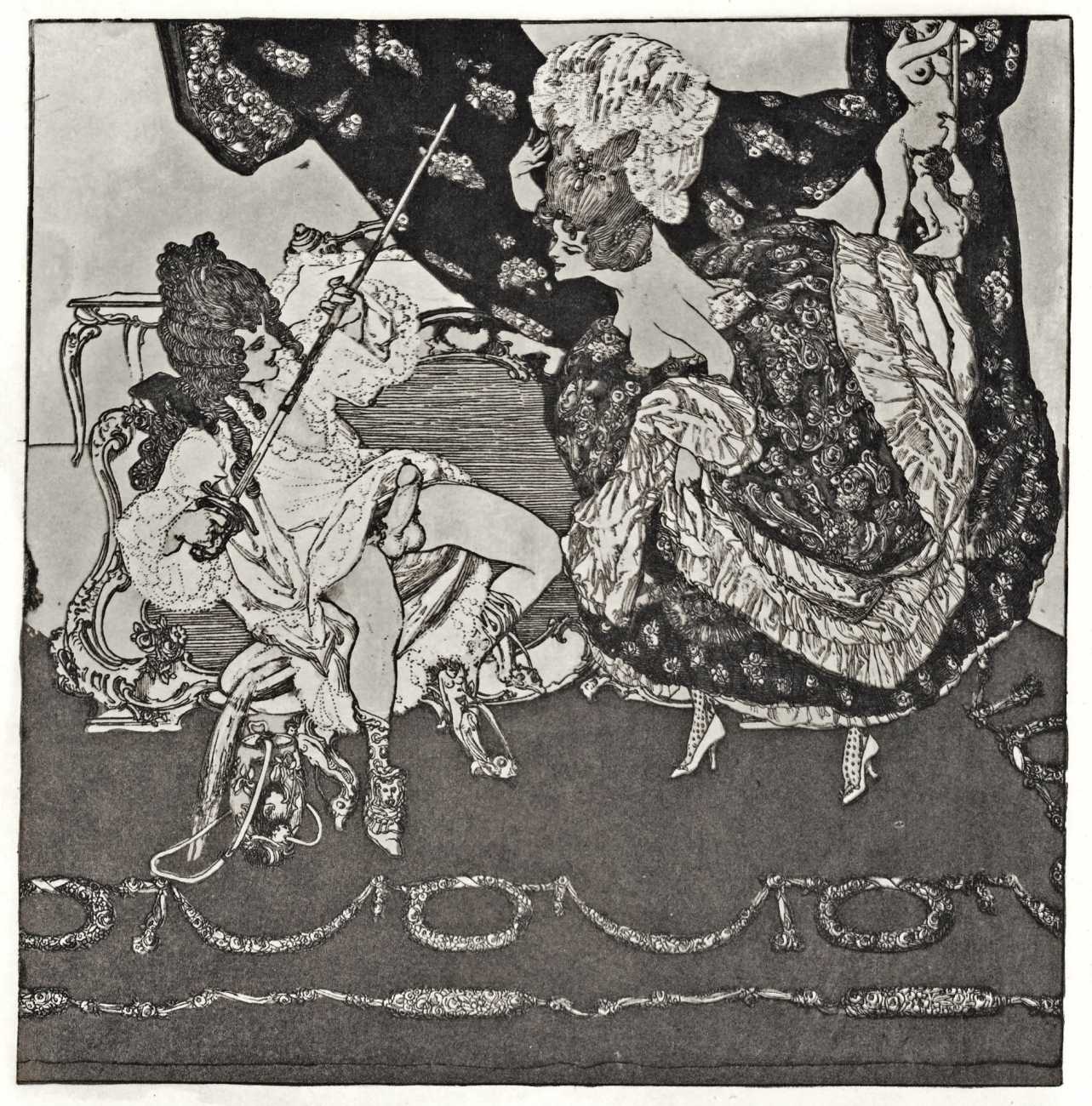 Die Bonbonnière (The Candy Box) was a collaboration between von Bayros, the poet and playwright Franz Biel (1871–1942), and the Vienna publisher Carl Stern. Published in two portfolios of six prints each, the Bayros etchings were accompanied by short poems and texts by Biel, here under the pseudonym Amadée de la Houlette – a man of many noms de plume, Biel also went by the soubriquets of Medardus, Dr Peregrinus Steinhövel, Franciscus Amadeus, Gussie Mc-Bill, Prokop Templin, Heliogabal, Nikodemus Schuster, and Hans Adolar.
