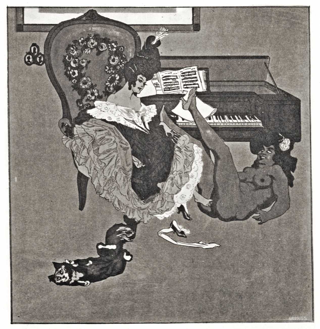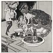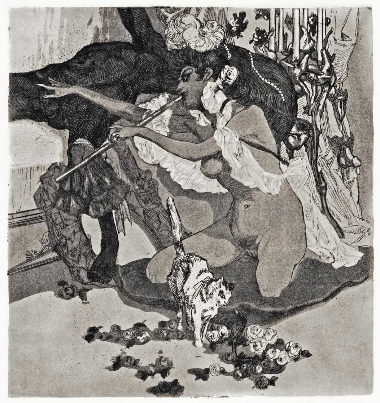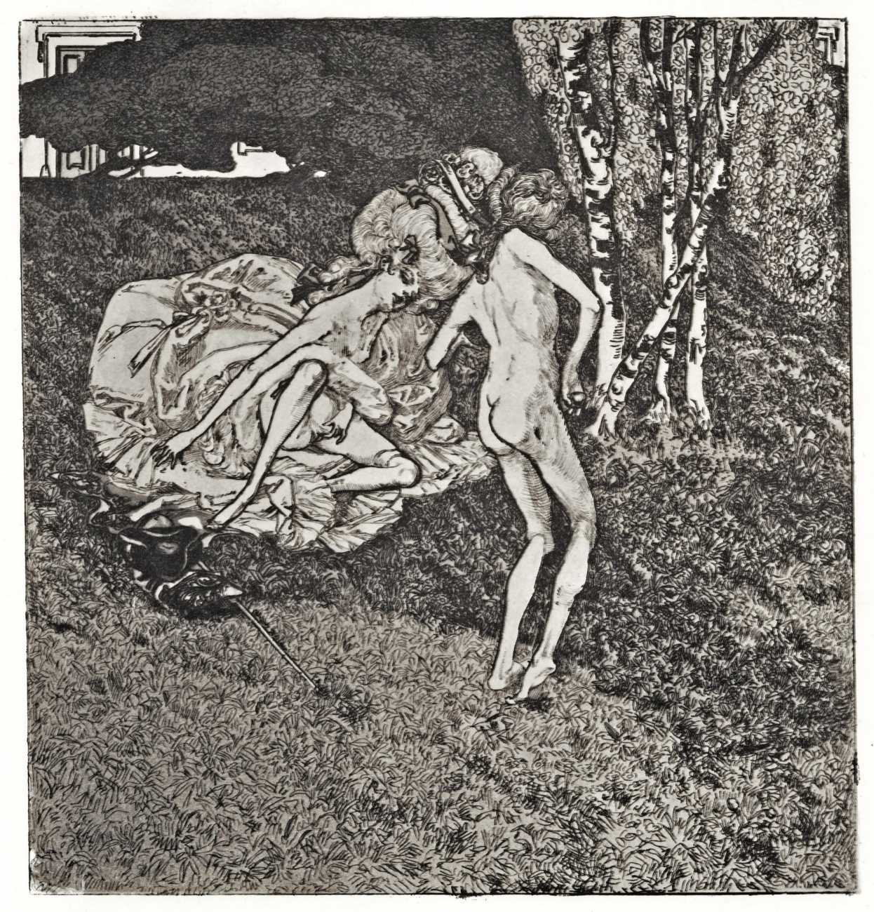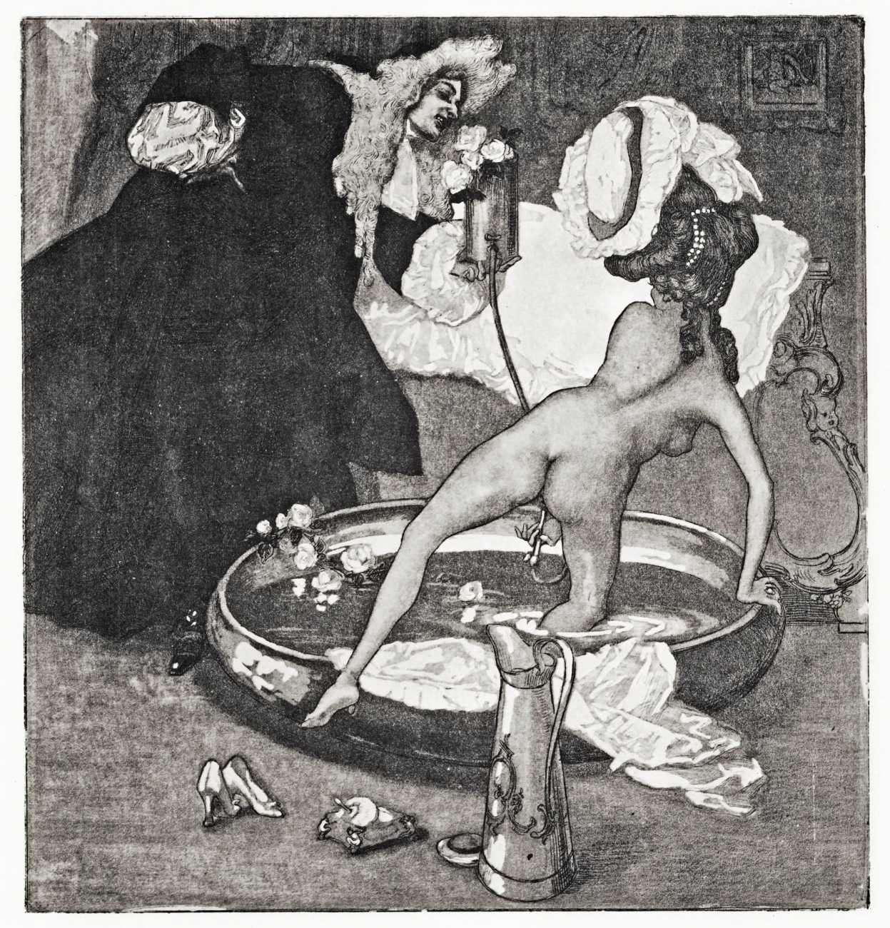 Die Bonbonnière (The Candy Box) was a collaboration between von Bayros, the poet and playwright Franz Biel (1871–1942), and the Vienna publisher Carl Stern. Published in two portfolios of six prints each, the Bayros etchings were accompanied by short poems and texts by Biel, here under the pseudonym Amadée de la Houlette – a man of many noms de plume, Biel also went by the soubriquets of Medardus, Dr Peregrinus Steinhövel, Franciscus Amadeus, Gussie Mc-Bill, Prokop Templin, Heliogabal, Nikodemus Schuster, and Hans Adolar.