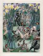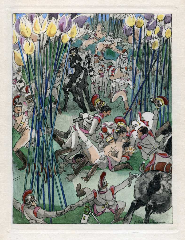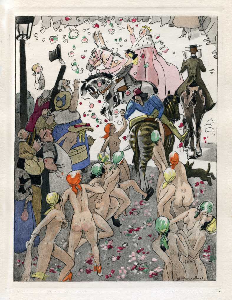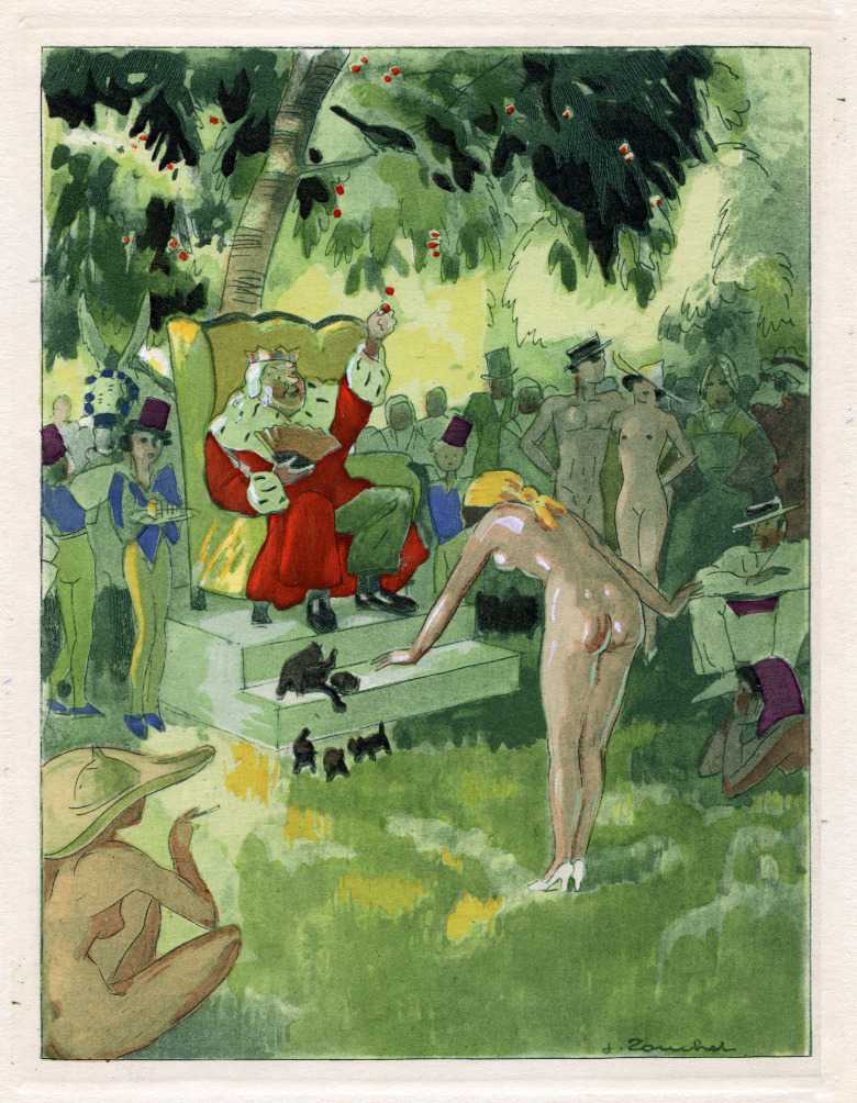 Jacques Touchet illustrated Pierre Louÿs’ erotic romp Les aventures du Roi Pausole twice, first for Piazza in 1930 with a mediocre and rather mundane set of monochrome illustrations, then seven years later for Rombaldi, with just five full-page colour images, which have a spirit and liveliness that truly complement Louÿs’ narrative. His hammock-swinging harem and processional Tryphêmian naturists are as good as any of the work’s many illustrators, making this edition a worthy addition to any Pausole collection.