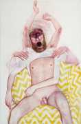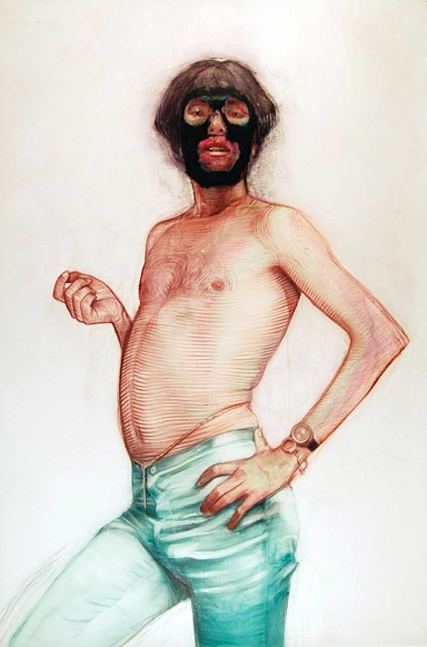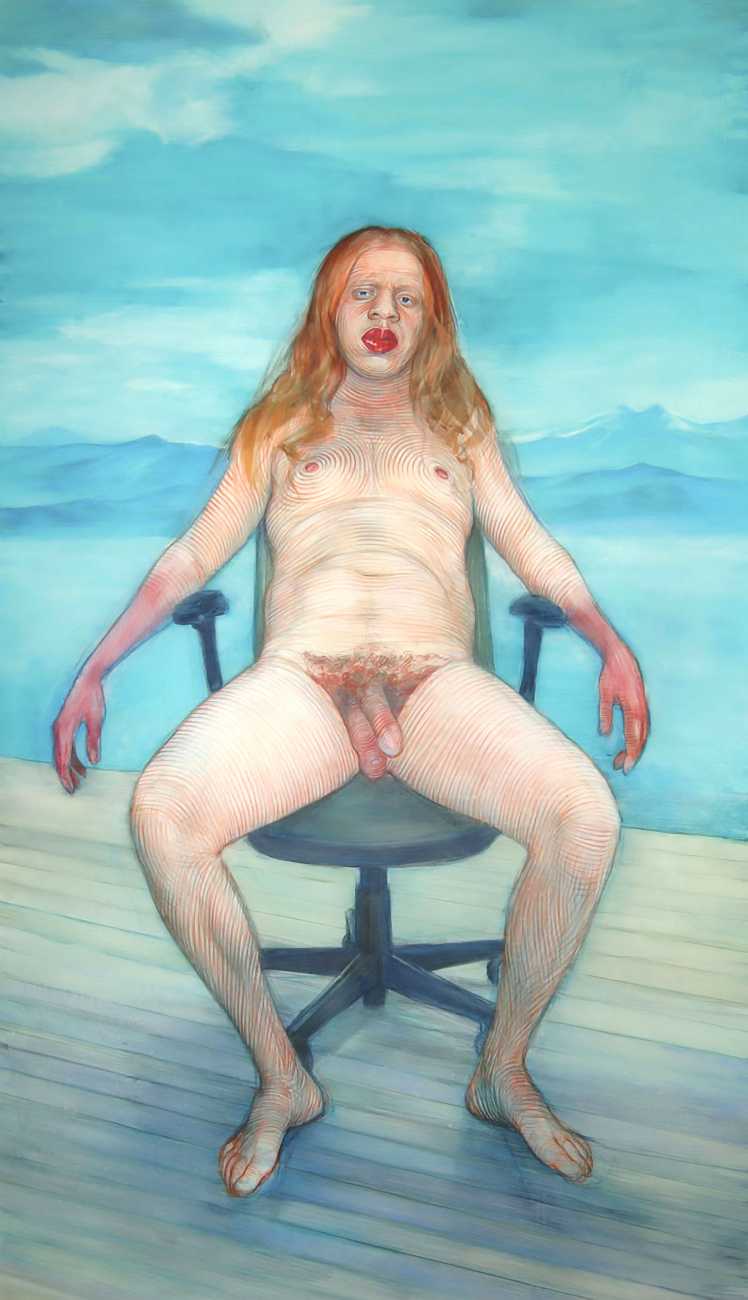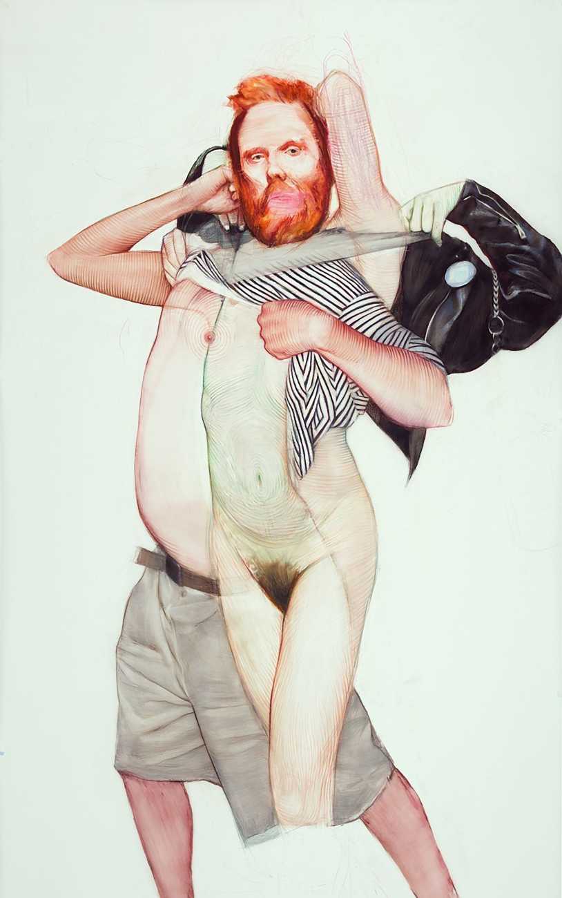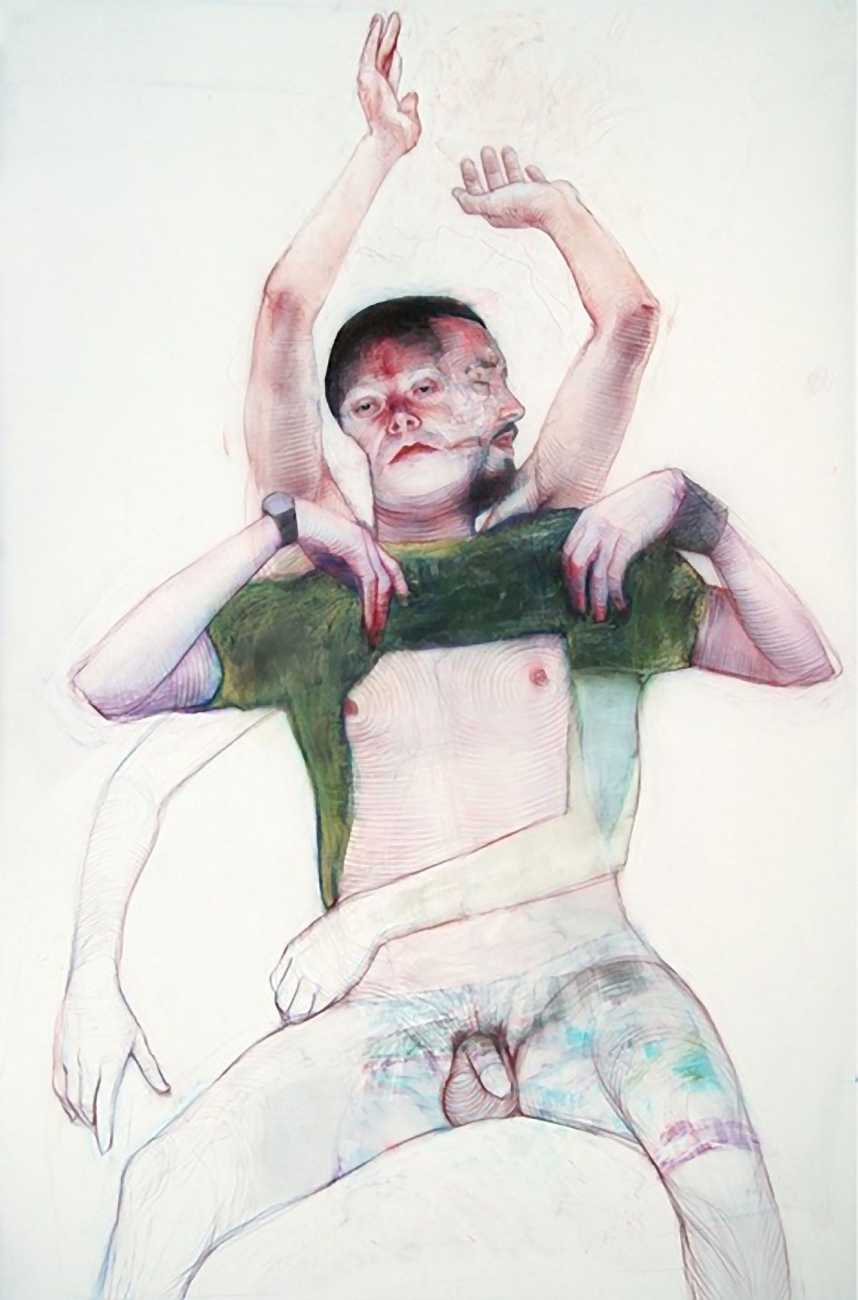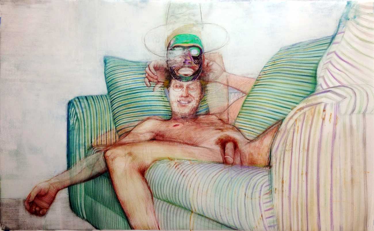 In his watercolour pencil drawings, Geoffrey Chadsey depicts characters that embody an uncanny, unbalanced mishmash of malleable flesh and warped psyche. Made using a rendering technique that echoes the dense curving and parallel lines used in engraved likenesses of presidents on paper money – or, more broadly, a plastic surgeon’s felt-tipped notations on bare pre-op skin – the nearly life-size figures often seem graphically gestural. They look practically charged with electric current, particularly around their nipples. Chadsey’s source images seem to be harvested from random Flickr pages or hook-up websites – the imperfect bodies, ordinary furniture, and flat lighting are all the stuff of private worlds made public online. It is with a deft hand and a peculiar vision that the artist manages to construct works imbued with such memorably freakish integrity.