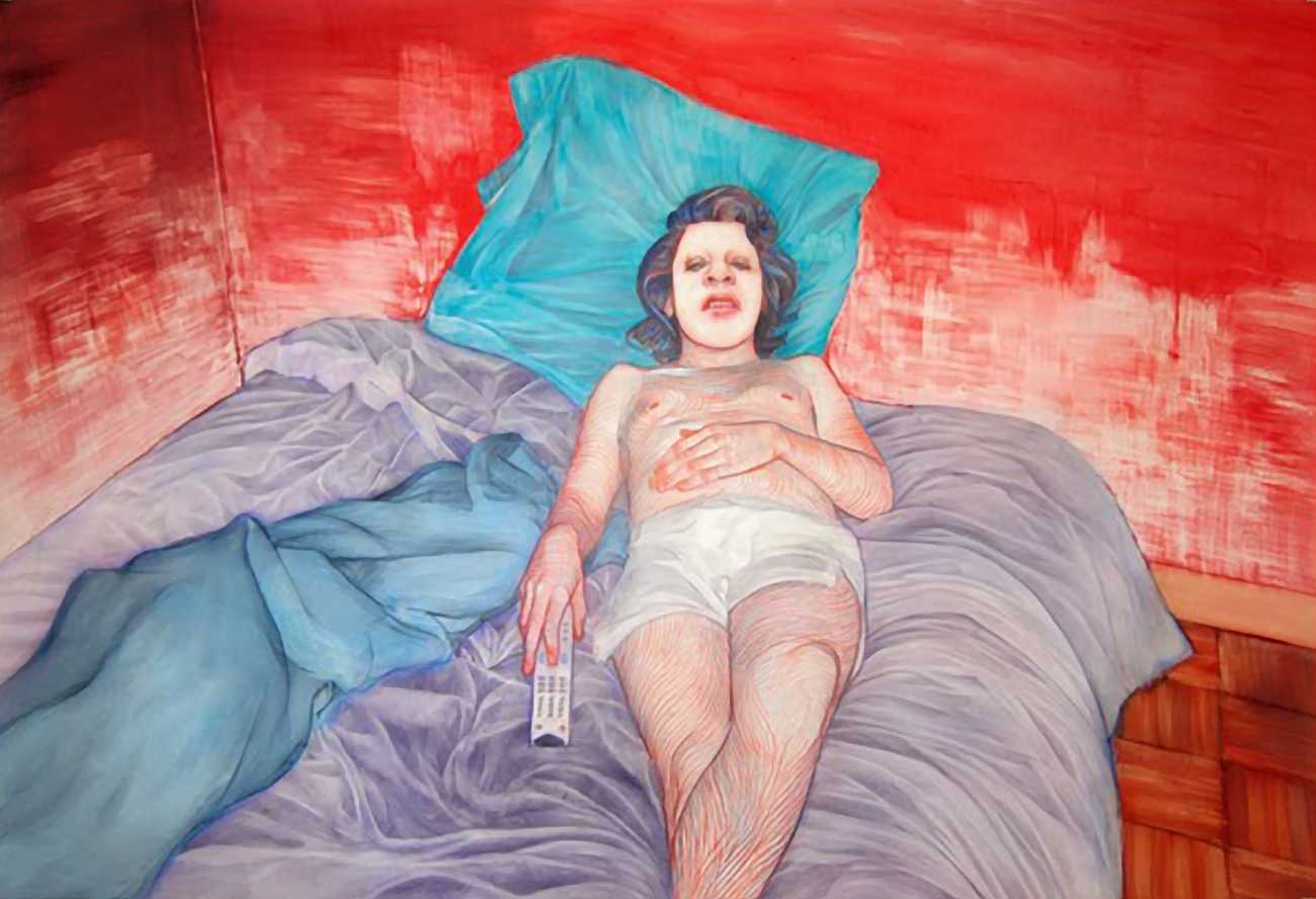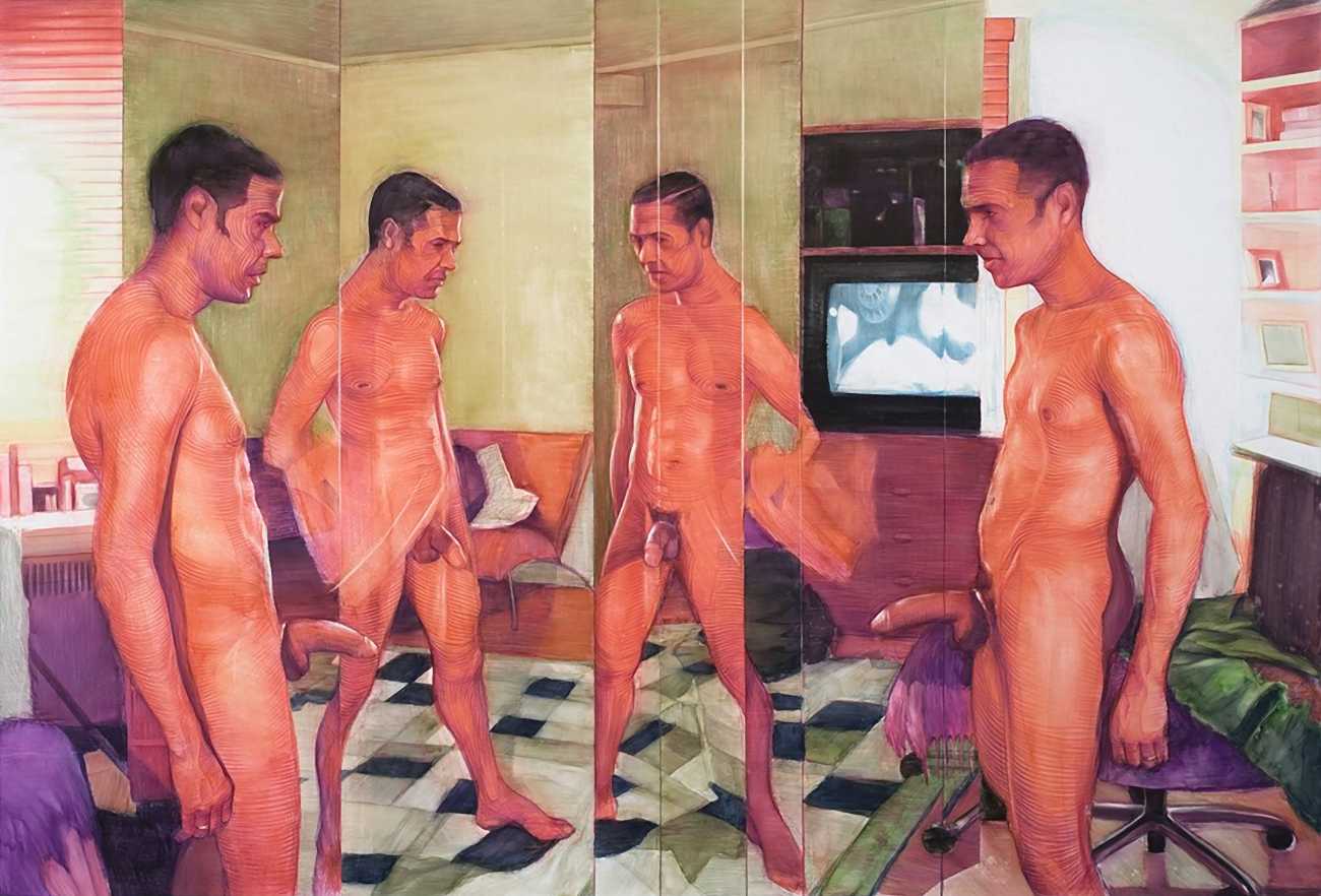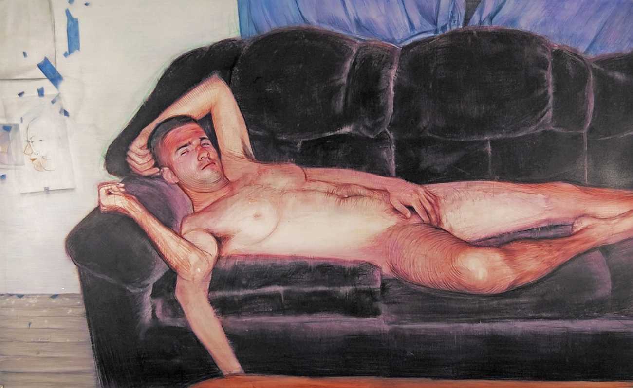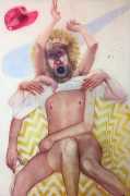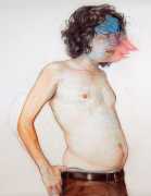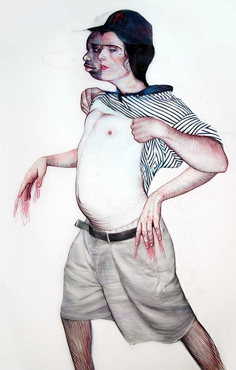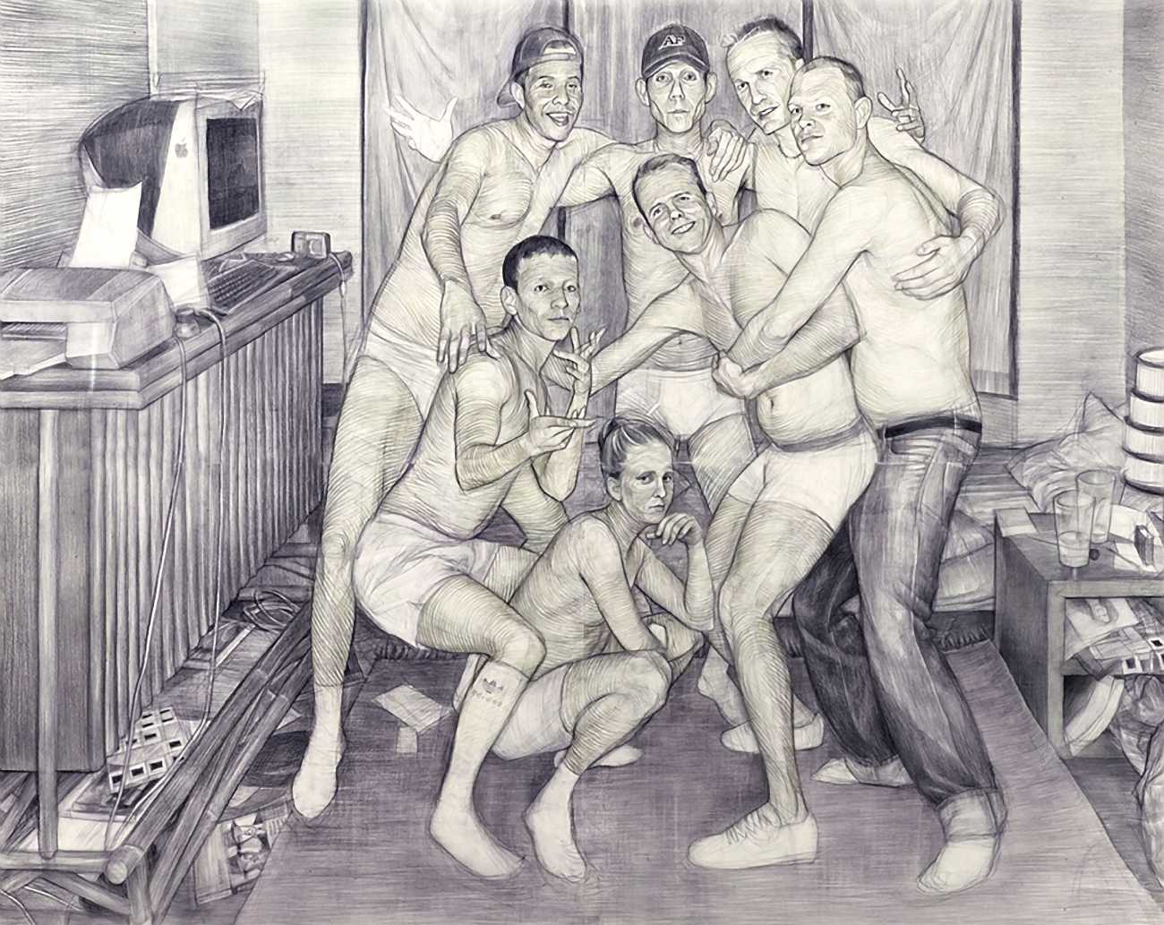 In his watercolour pencil drawings, Geoffrey Chadsey depicts characters that embody an uncanny, unbalanced mishmash of malleable flesh and warped psyche. Made using a rendering technique that echoes the dense curving and parallel lines used in engraved likenesses of presidents on paper money – or, more broadly, a plastic surgeon’s felt-tipped notations on bare pre-op skin – the nearly life-size figures often seem graphically gestural. They look practically charged with electric current, particularly around their nipples. Chadsey’s source images seem to be harvested from random Flickr pages or hook-up websites – the imperfect bodies, ordinary furniture, and flat lighting are all the stuff of private worlds made public online. It is with a deft hand and a peculiar vision that the artist manages to construct works imbued with such memorably freakish integrity.
