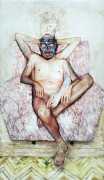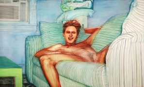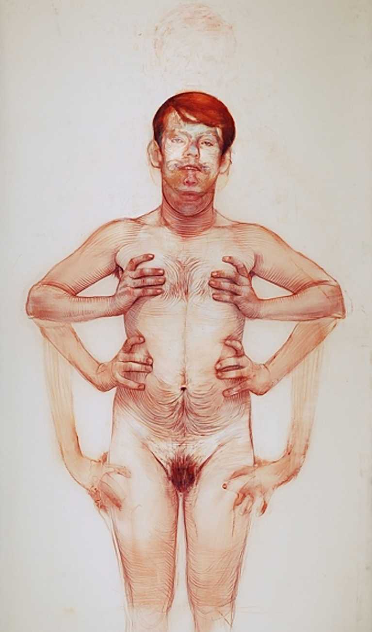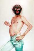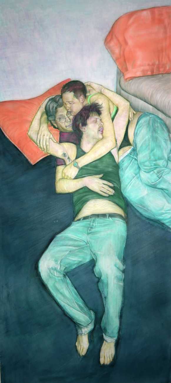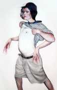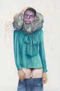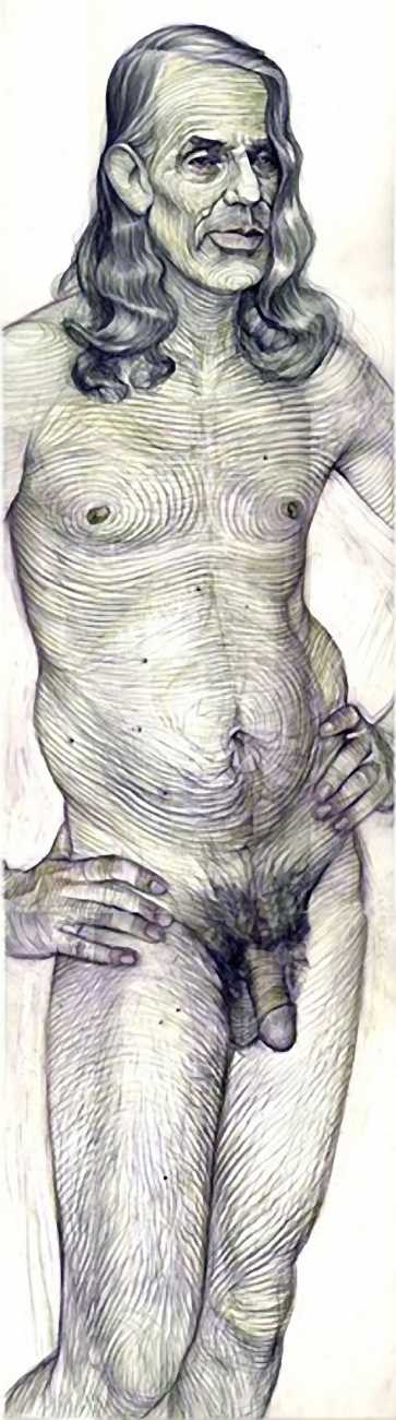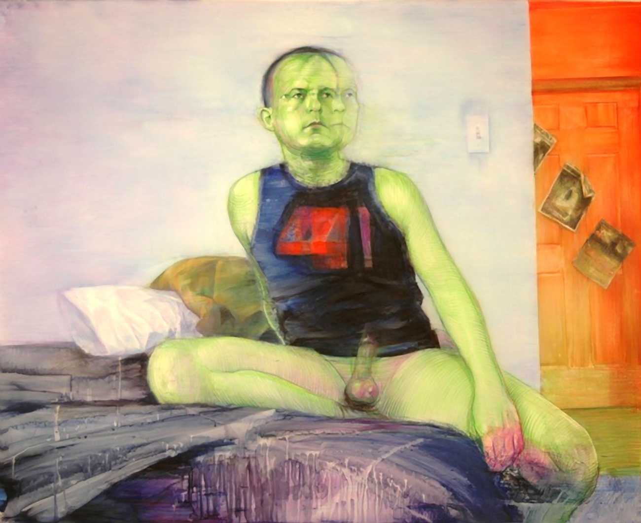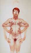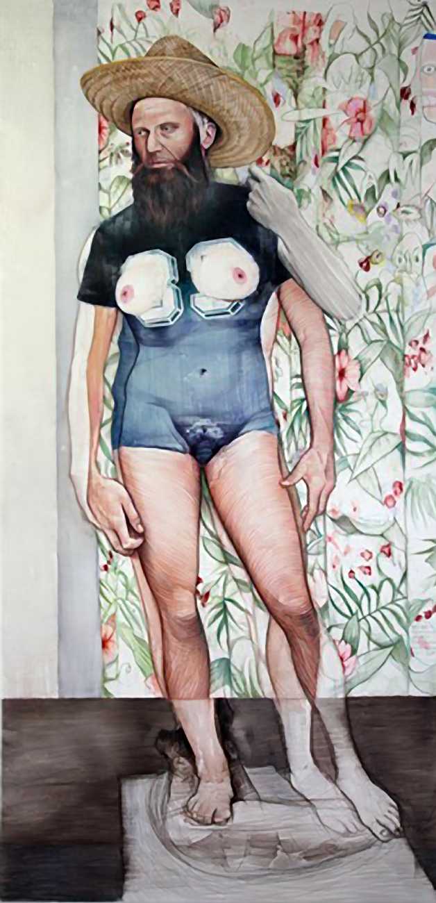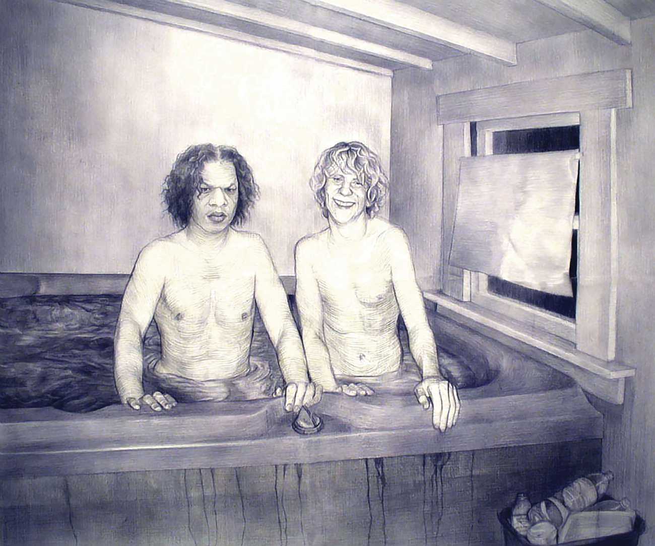 In his watercolour pencil drawings, Geoffrey Chadsey depicts characters that embody an uncanny, unbalanced mishmash of malleable flesh and warped psyche. Made using a rendering technique that echoes the dense curving and parallel lines used in engraved likenesses of presidents on paper money – or, more broadly, a plastic surgeon’s felt-tipped notations on bare pre-op skin – the nearly life-size figures often seem graphically gestural. They look practically charged with electric current, particularly around their nipples. Chadsey’s source images seem to be harvested from random Flickr pages or hook-up websites – the imperfect bodies, ordinary furniture, and flat lighting are all the stuff of private worlds made public online. It is with a deft hand and a peculiar vision that the artist manages to construct works imbued with such memorably freakish integrity.