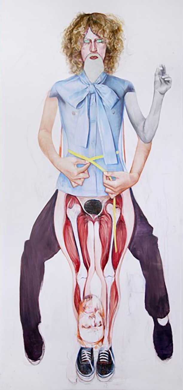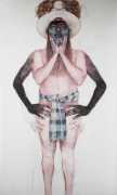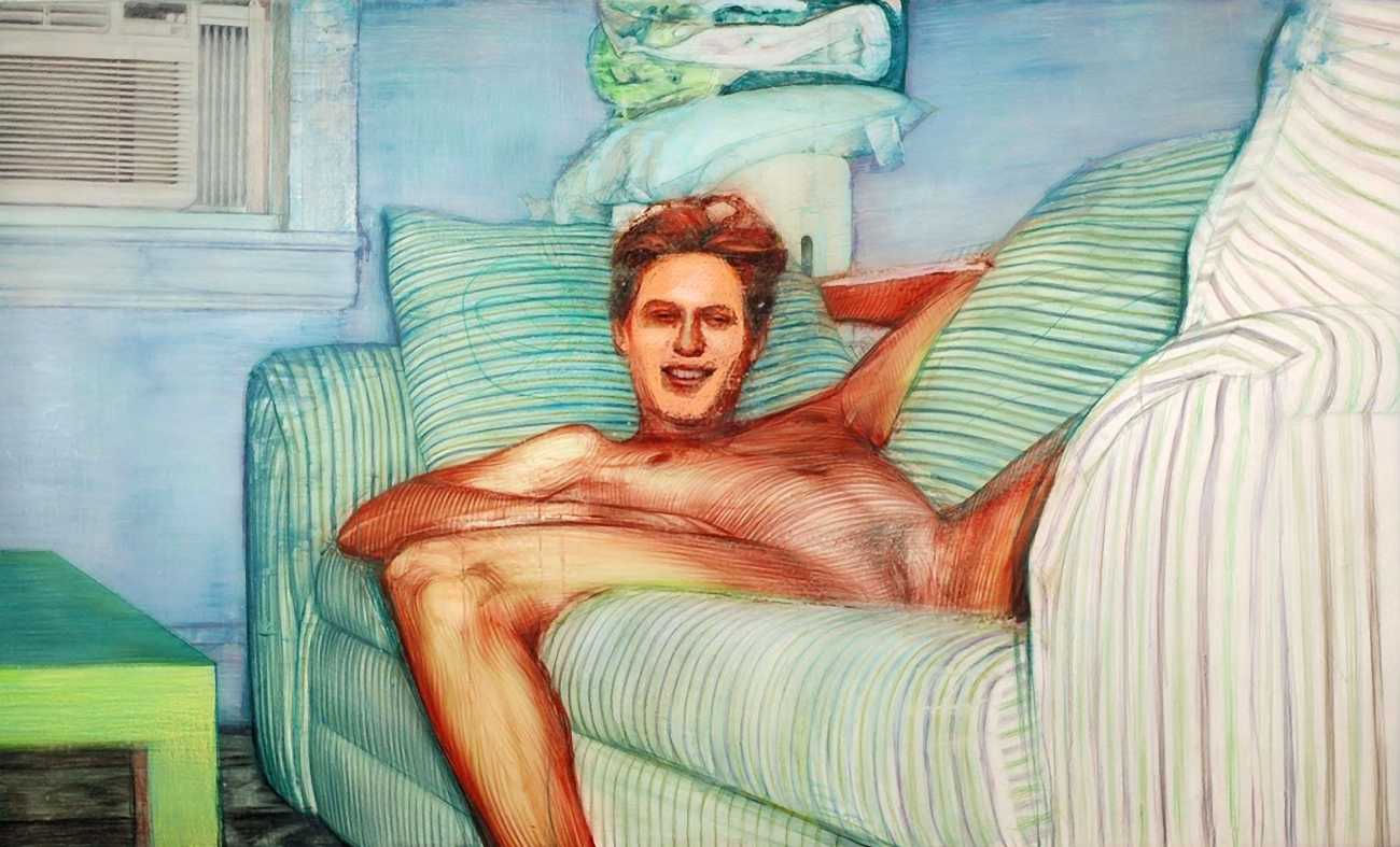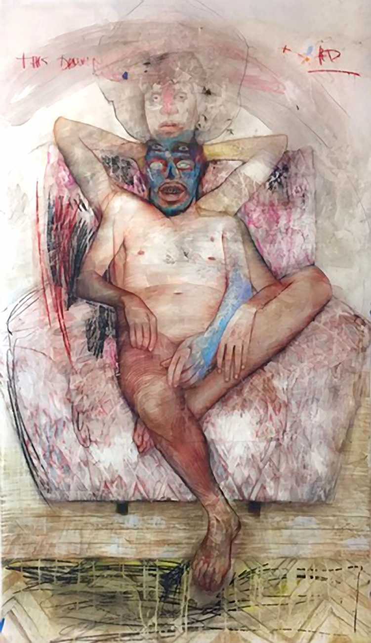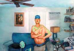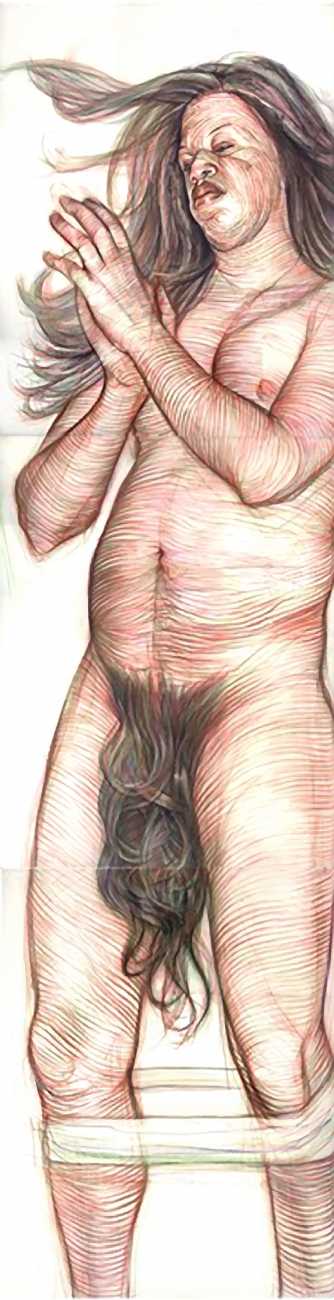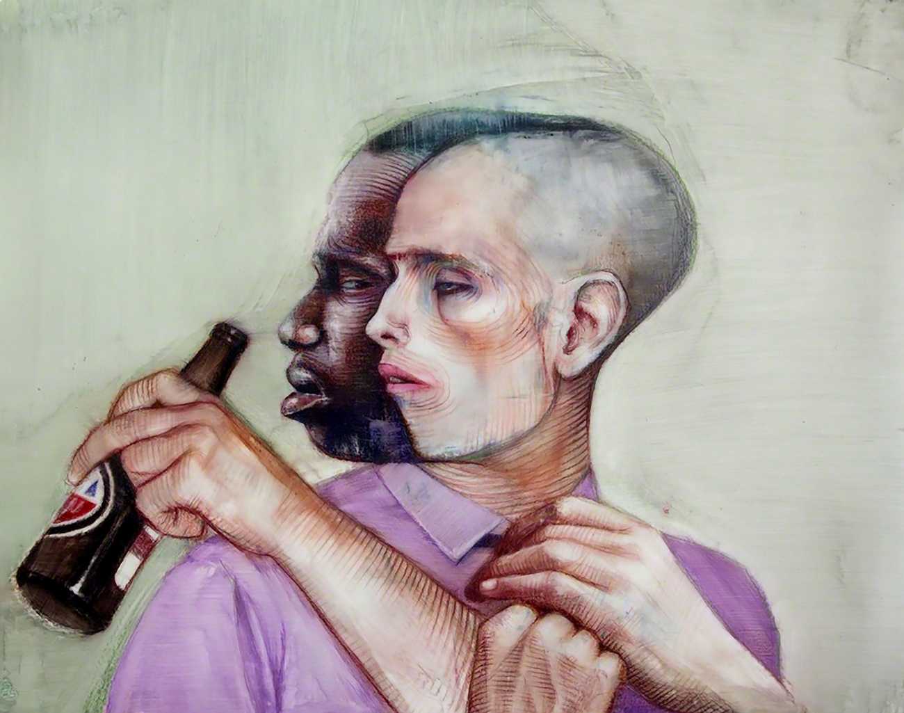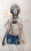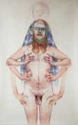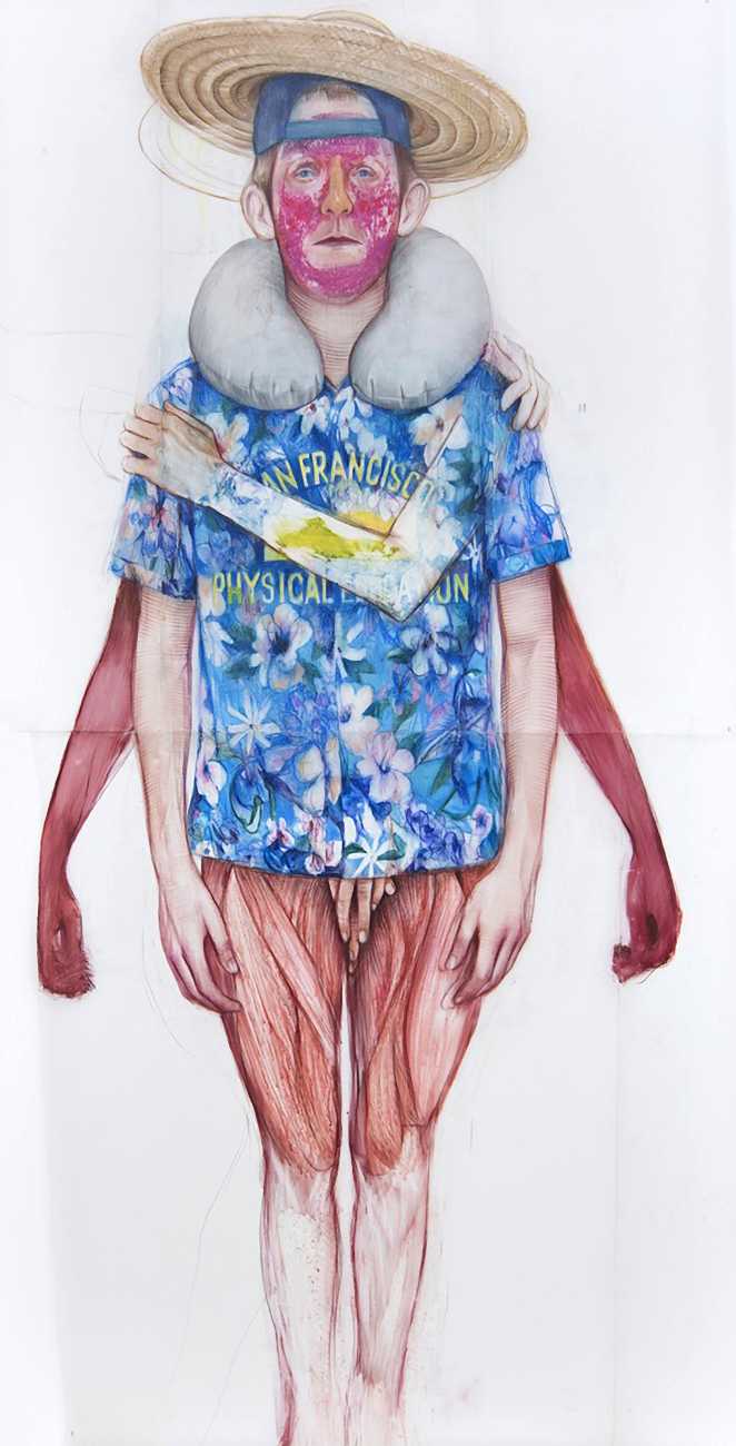 In his watercolour pencil drawings, Geoffrey Chadsey depicts characters that embody an uncanny, unbalanced mishmash of malleable flesh and warped psyche. Made using a rendering technique that echoes the dense curving and parallel lines used in engraved likenesses of presidents on paper money – or, more broadly, a plastic surgeon’s felt-tipped notations on bare pre-op skin – the nearly life-size figures often seem graphically gestural. They look practically charged with electric current, particularly around their nipples. Chadsey’s source images seem to be harvested from random Flickr pages or hook-up websites – the imperfect bodies, ordinary furniture, and flat lighting are all the stuff of private worlds made public online. It is with a deft hand and a peculiar vision that the artist manages to construct works imbued with such memorably freakish integrity.