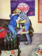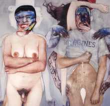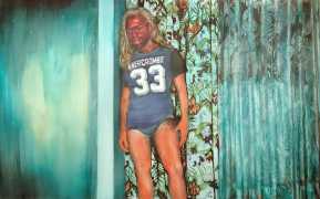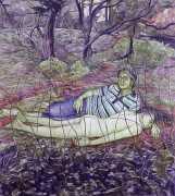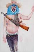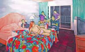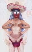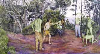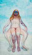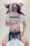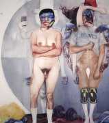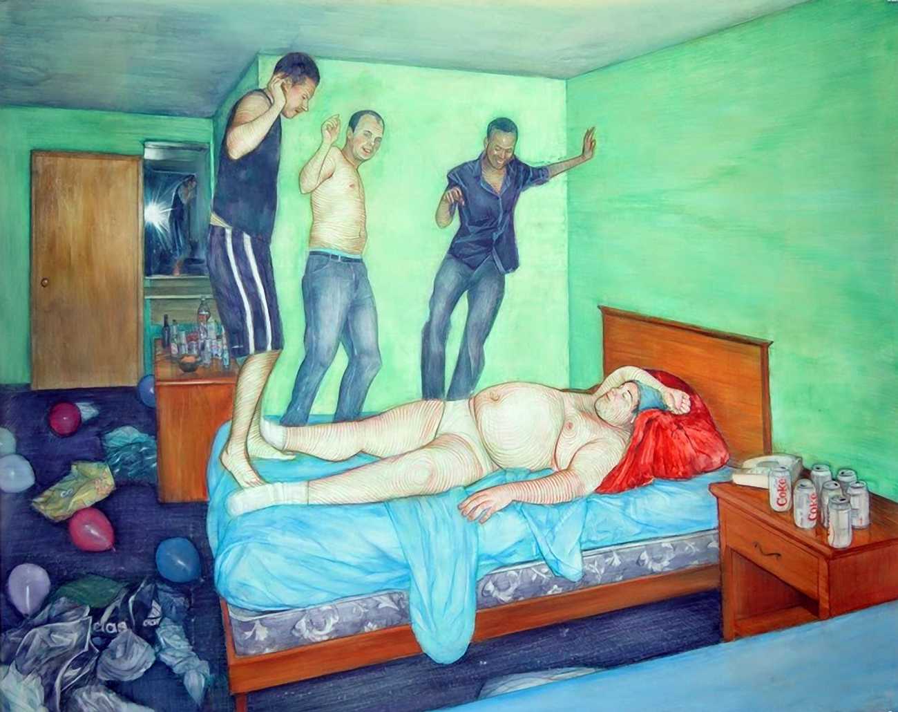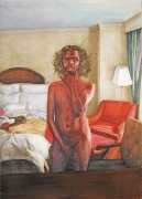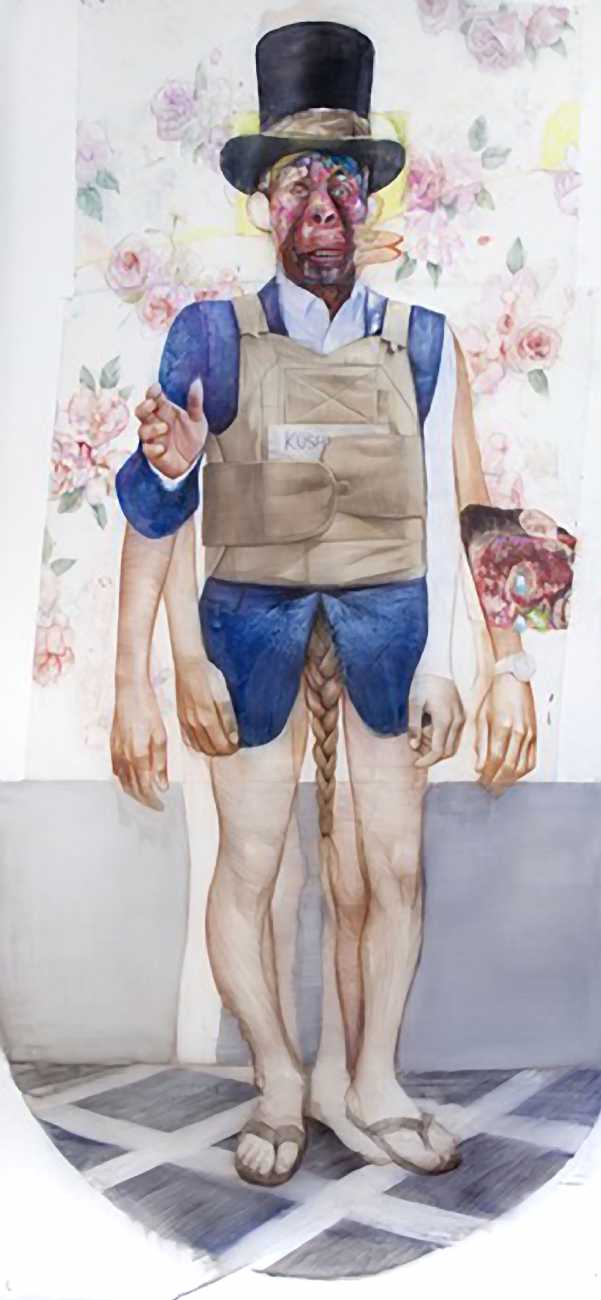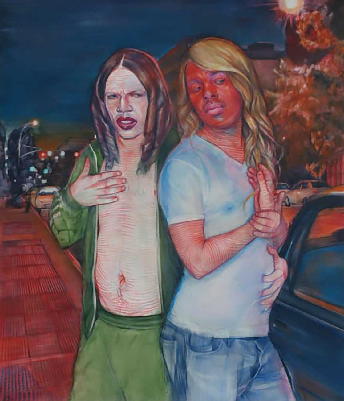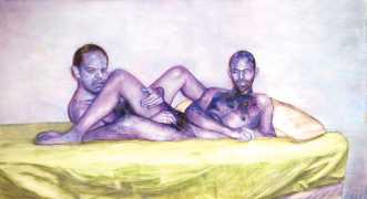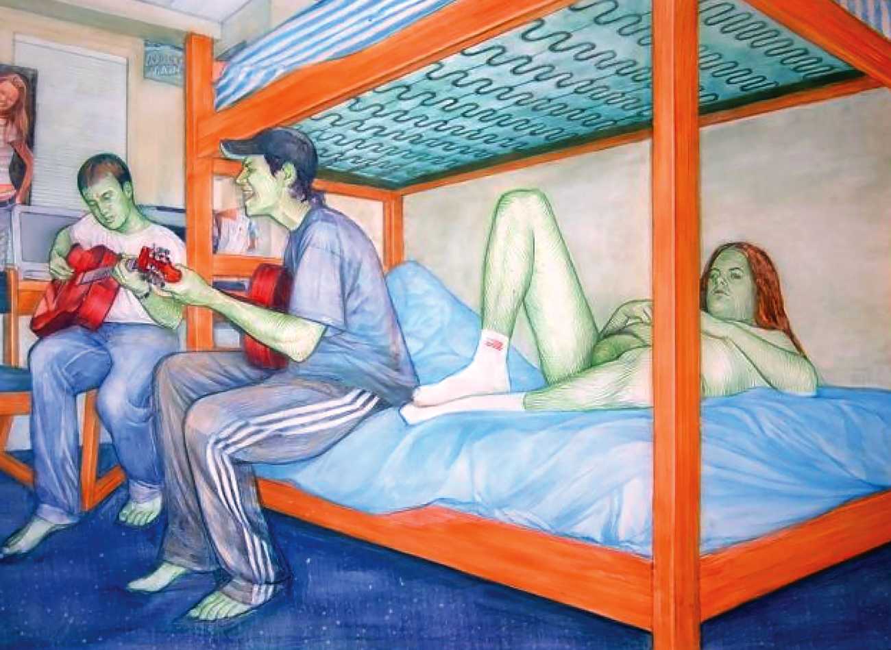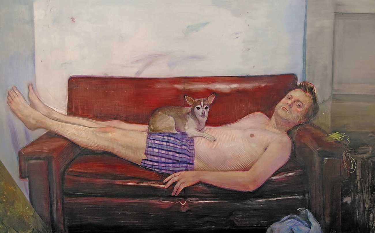 In his watercolour pencil drawings, Geoffrey Chadsey depicts characters that embody an uncanny, unbalanced mishmash of malleable flesh and warped psyche. Made using a rendering technique that echoes the dense curving and parallel lines used in engraved likenesses of presidents on paper money – or, more broadly, a plastic surgeon’s felt-tipped notations on bare pre-op skin – the nearly life-size figures often seem graphically gestural. They look practically charged with electric current, particularly around their nipples. Chadsey’s source images seem to be harvested from random Flickr pages or hook-up websites – the imperfect bodies, ordinary furniture, and flat lighting are all the stuff of private worlds made public online. It is with a deft hand and a peculiar vision that the artist manages to construct works imbued with such memorably freakish integrity.