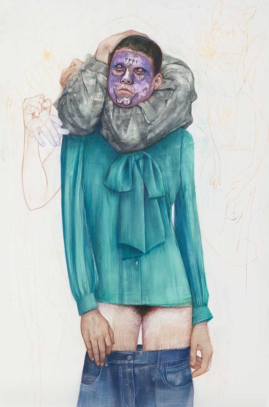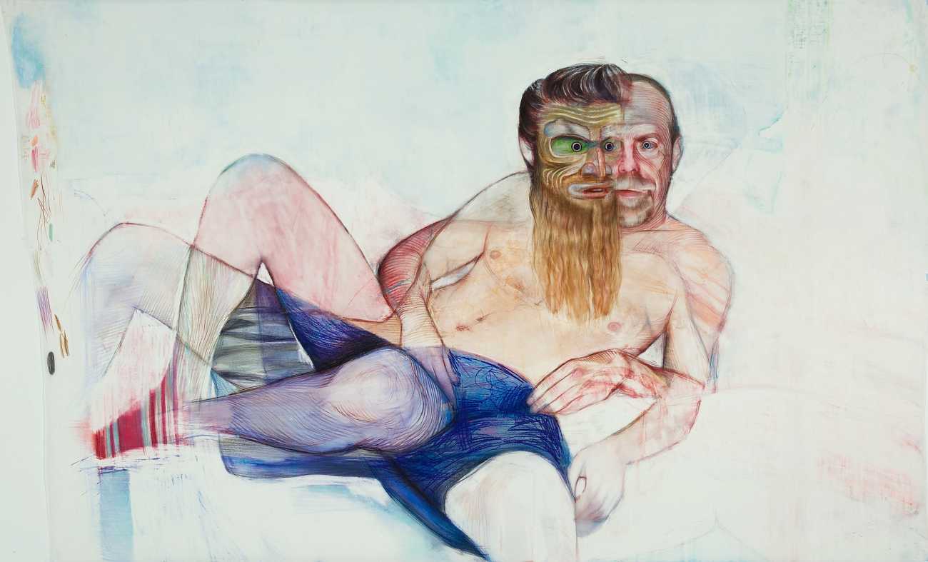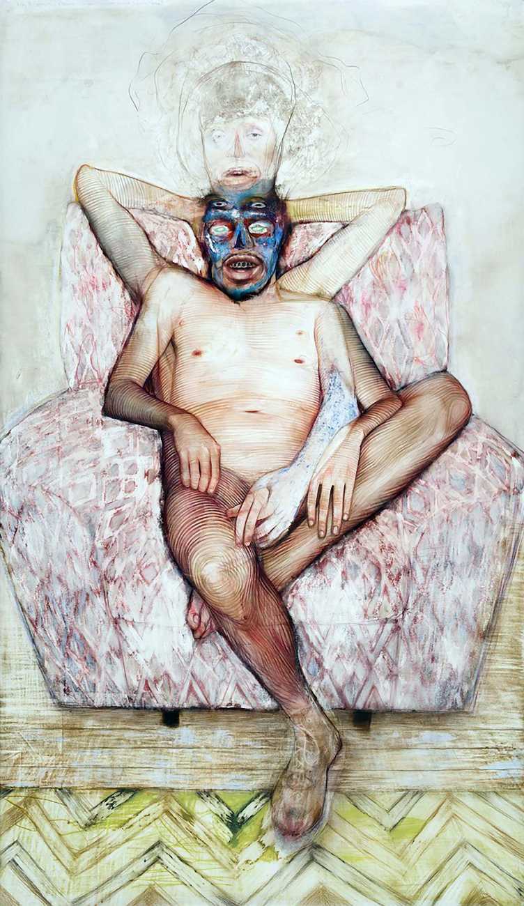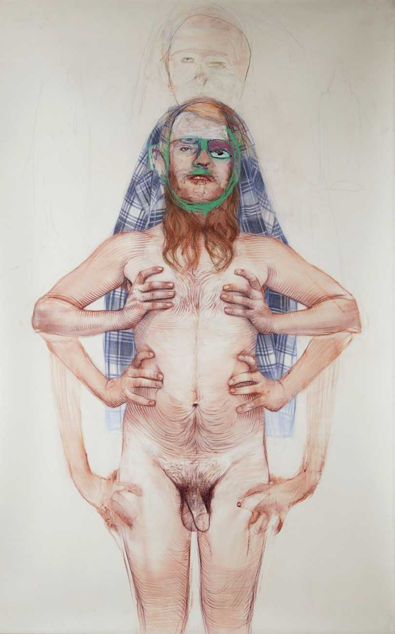 The Brooklyn-based artist Geoffrey Chadsey is known for his meticulous water-soluble-pencil-and-crayon drawings on mylar of unnerving figures in various states of undress. They bare themselves ‘while kind of glaring at you’, Chadsey says of his invented subjects, who he frequently bestows with ambiguous forms and states of mind — a portrait might feature a hairy chest and curvy hips, a ghostly set of extra limbs, or a fanny pack and antlers.