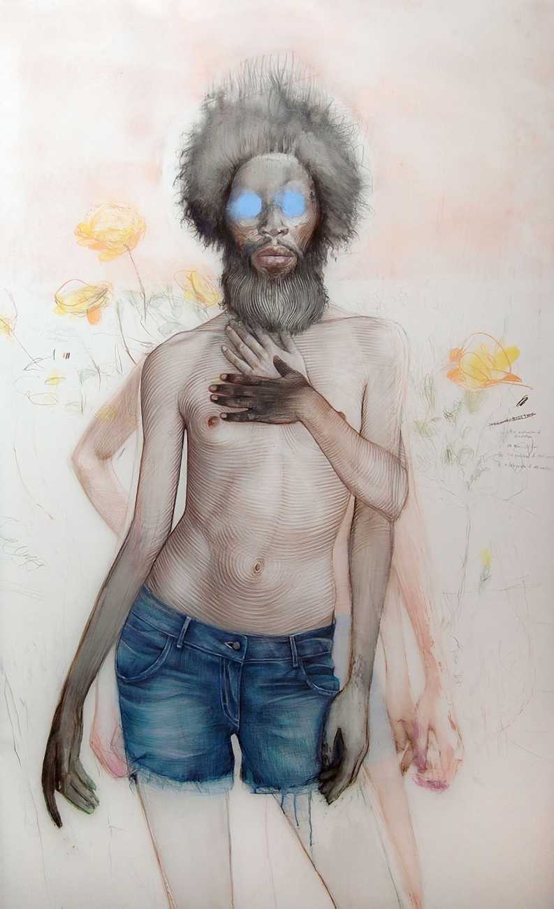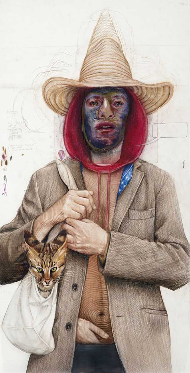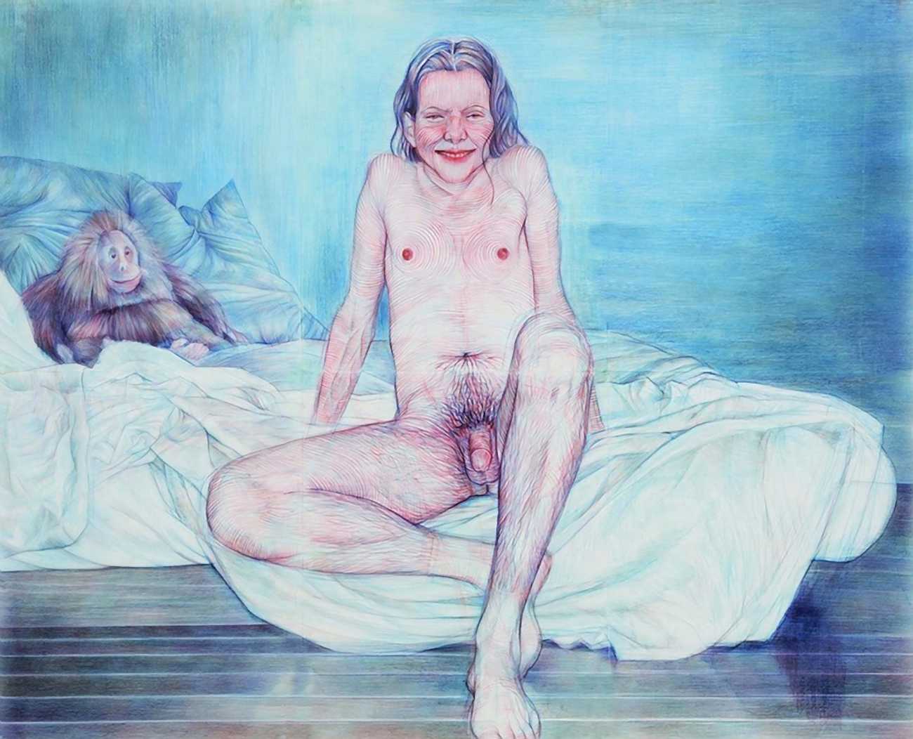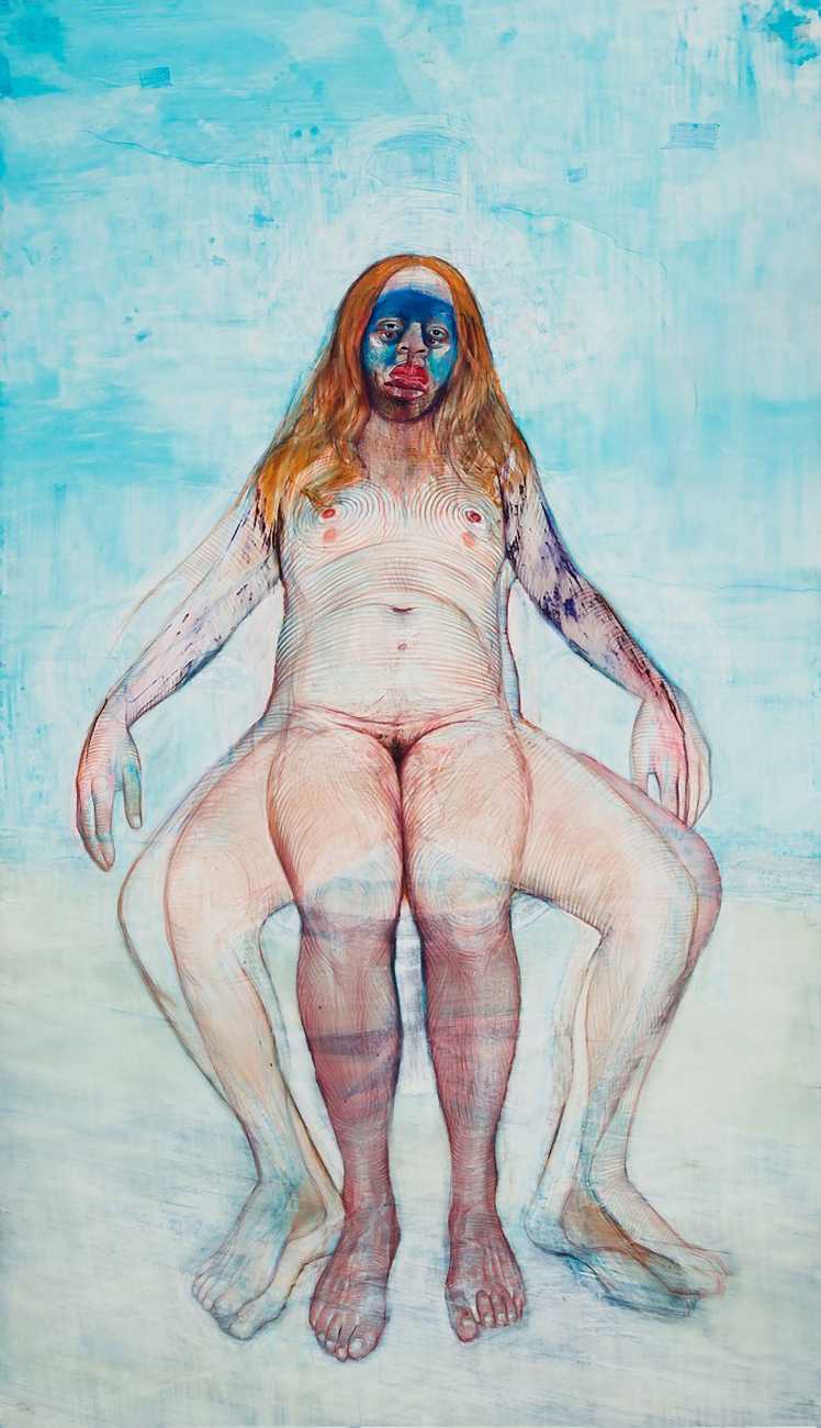 The Brooklyn-based artist Geoffrey Chadsey is known for his meticulous water-soluble-pencil-and-crayon drawings on mylar of unnerving figures in various states of undress. They bare themselves ‘while kind of glaring at you’, Chadsey says of his invented subjects, who he frequently bestows with ambiguous forms and states of mind — a portrait might feature a hairy chest and curvy hips, a ghostly set of extra limbs, or a fanny pack and antlers.