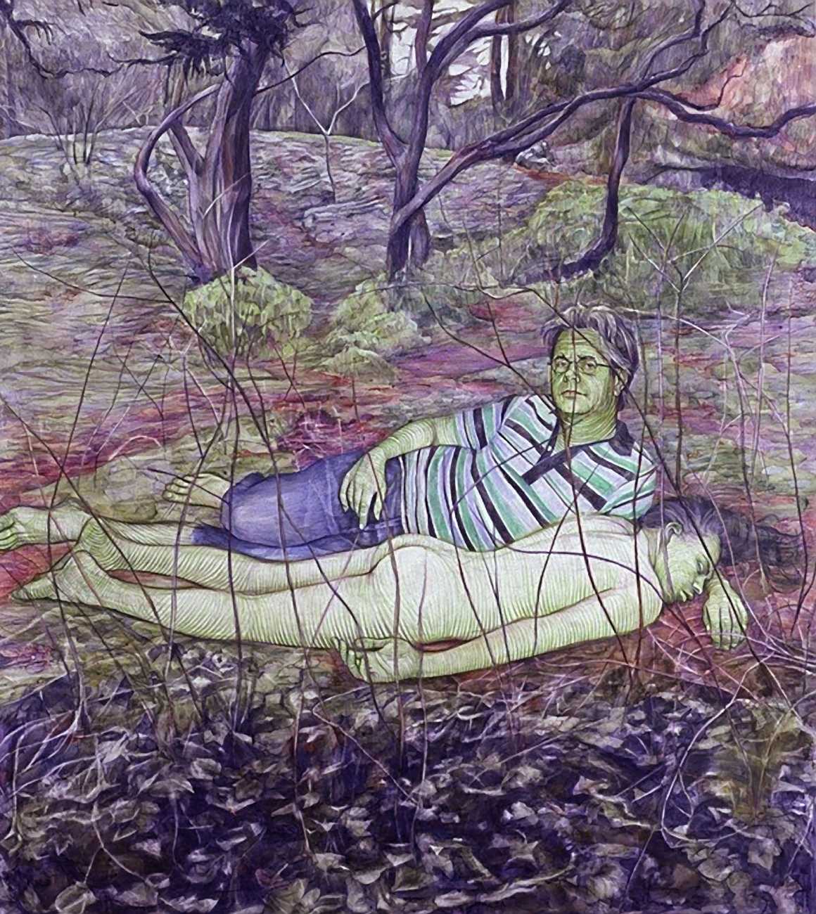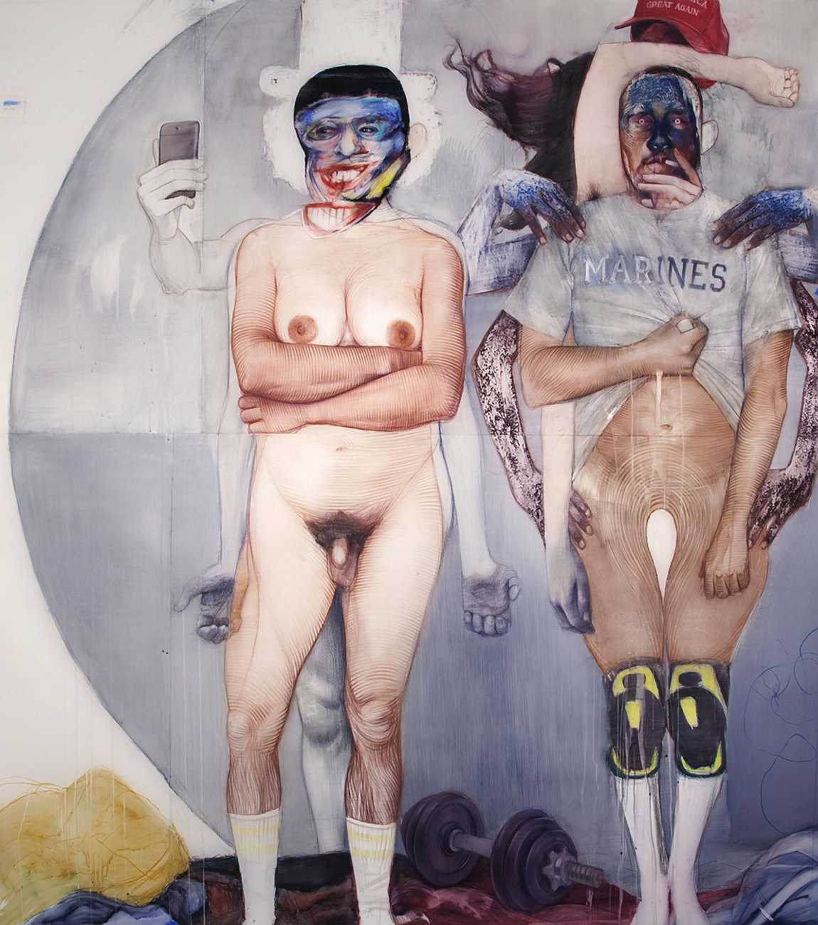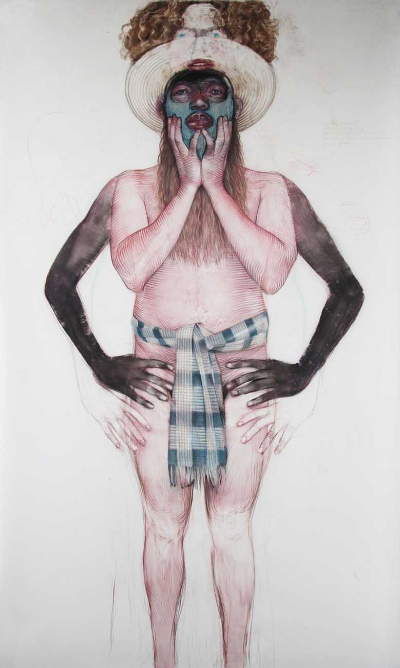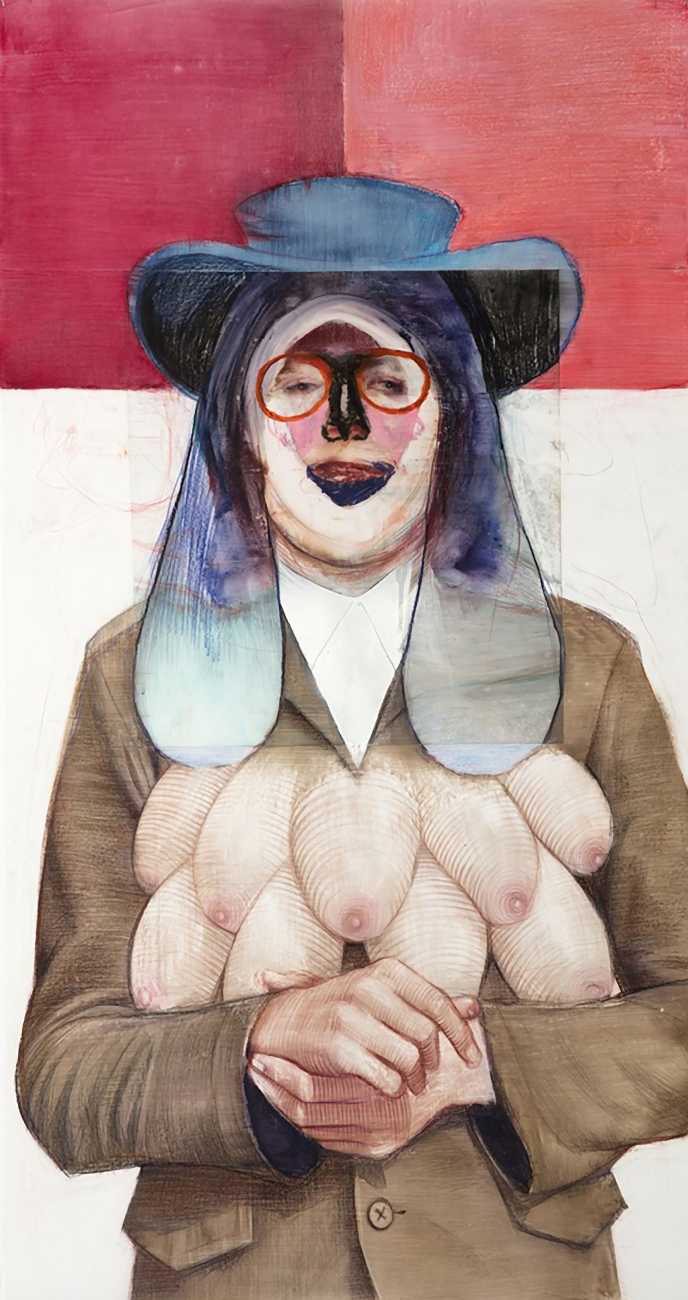 The Brooklyn-based artist Geoffrey Chadsey is known for his meticulous water-soluble-pencil-and-crayon drawings on mylar of unnerving figures in various states of undress. They bare themselves ‘while kind of glaring at you’, Chadsey says of his invented subjects, who he frequently bestows with ambiguous forms and states of mind — a portrait might feature a hairy chest and curvy hips, a ghostly set of extra limbs, or a fanny pack and antlers.