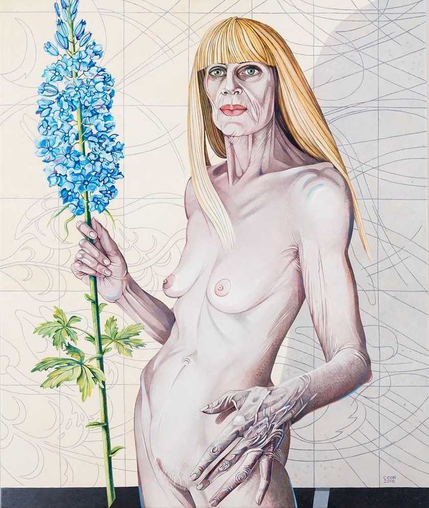 Here is a wide-ranging selection of Caroline Coon’s work over the years, from an early college study and her banned ‘Mr Olympia’ to her defiant and honest ‘Self with Delphinium age 70’. Worthy of note are political statements like ‘Oz Trio’, featuring the prosecuted editors Richard Neville, Felix Dennis and Jim Anderson from the celebrated obscenity trial of 1971, and ‘Valerie Solanas’ with her 1967 SCUM (Society for Cutting Up Men) Manifesto, appropriately accompanied by a severed member. We have also included several of the ‘Ladbroke Grove’ series, together with the much-discussed ‘Rush Hour: She Strips them Naked with her Eyes’, in which the men ogling naked bodies in the tabloids on their way to work are shown stripped naked themselves, any offence caused by her work exposing our own hypocrisy.