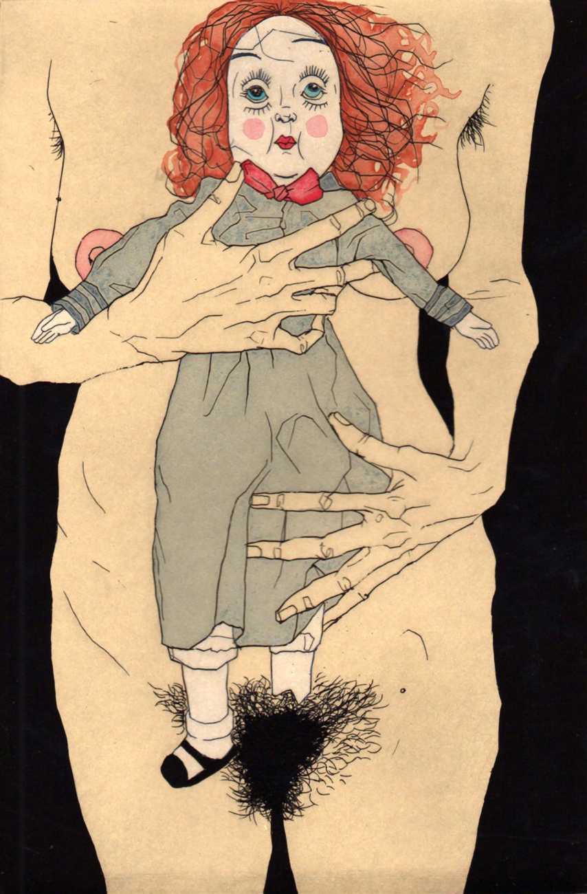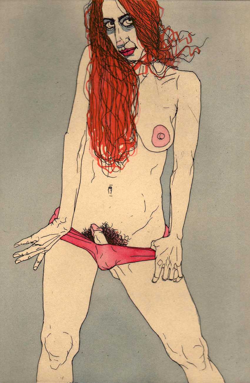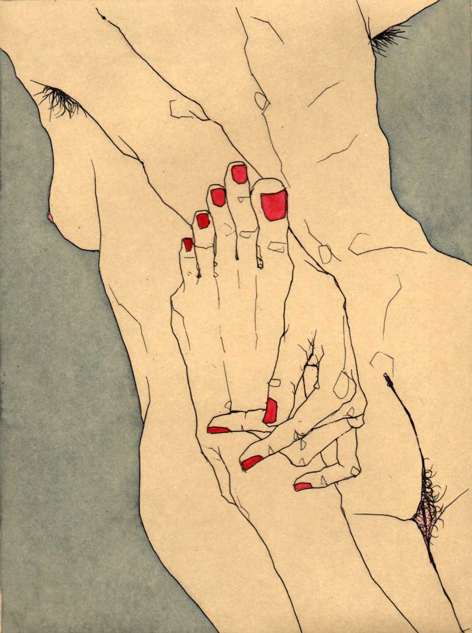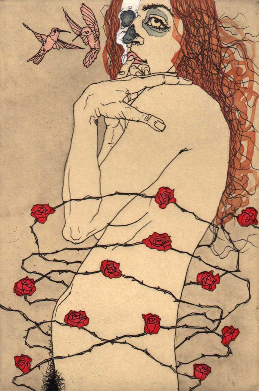 Between 2003 and 2010 one of Phillip Dvorak’s main projects was a series of line etchings, hand-coloured with gouache and watercolour, each produced in a limited edition of between 25 and 50. Printed on a sand-coloured paper, they explore the gaunt landscape of the naked human body, often accompanied by Dvorak’s trademark hummingbirds and red roses. Dolls and skulls also make an appearance.