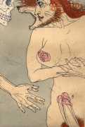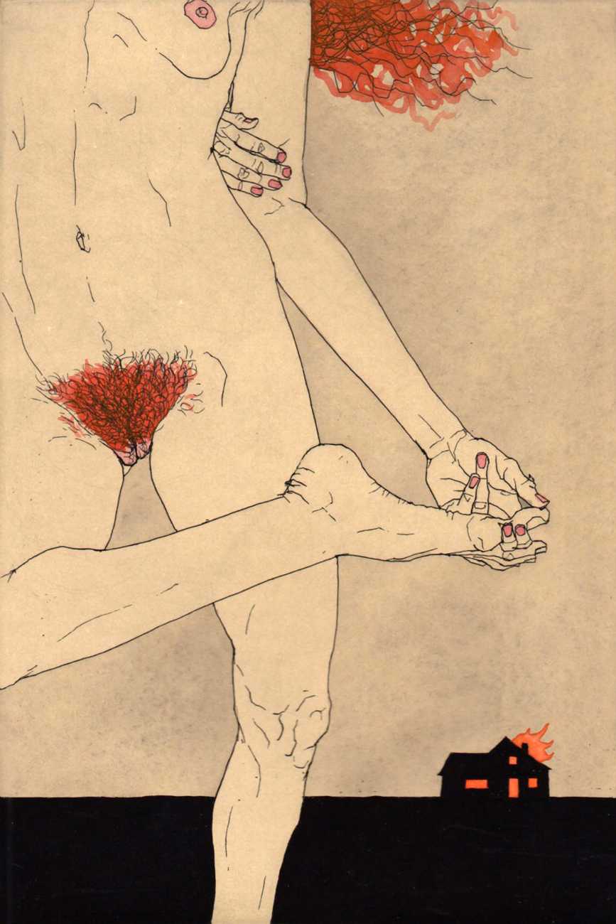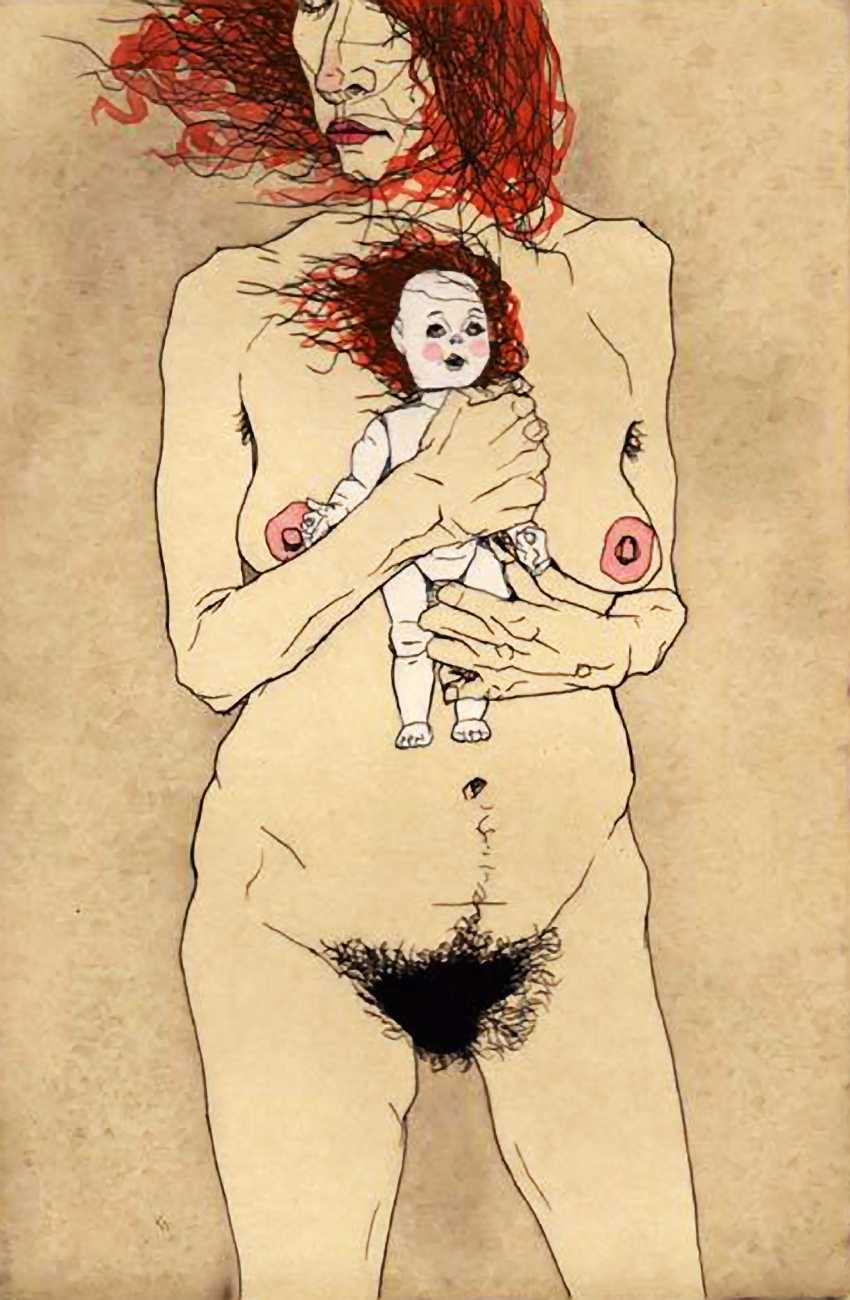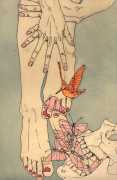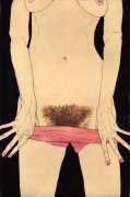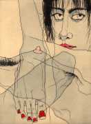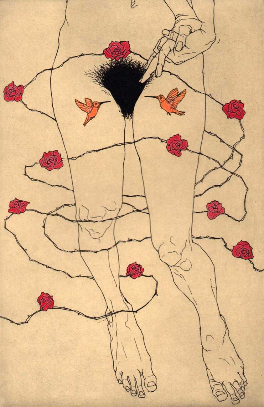 Between 2003 and 2010 one of Phillip Dvorak’s main projects was a series of line etchings, hand-coloured with gouache and watercolour, each produced in a limited edition of between 25 and 50. Printed on a sand-coloured paper, they explore the gaunt landscape of the naked human body, often accompanied by Dvorak’s trademark hummingbirds and red roses. Dolls and skulls also make an appearance.
