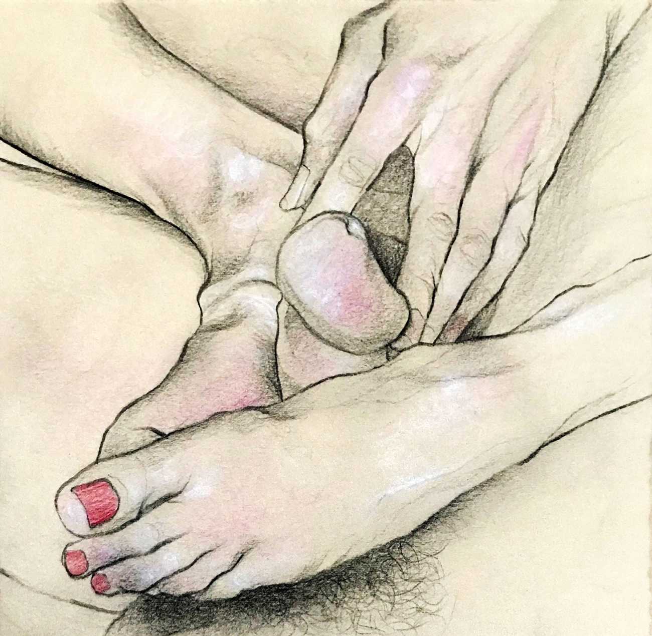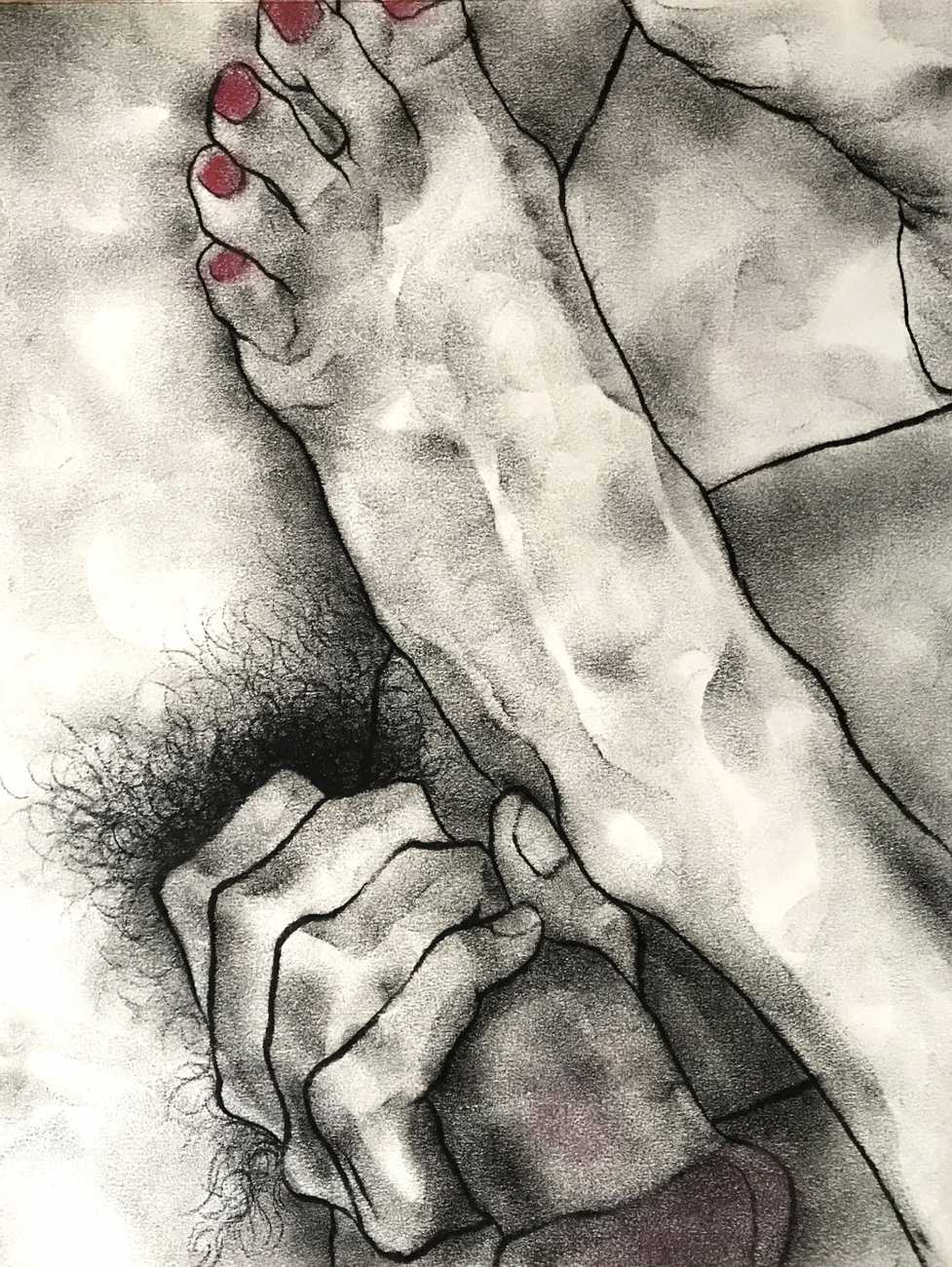 His website gallery of drawings, which you will find here, includes many close-up studies of cocks, vulvas, and tender sexual sharings, nearly all done in monochrome charcoal or pencil. It is very clear from his work that he is a strong advocate of natural pubic and underarrm hair, which he draws in profuse and loving detail.