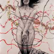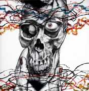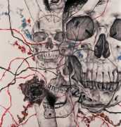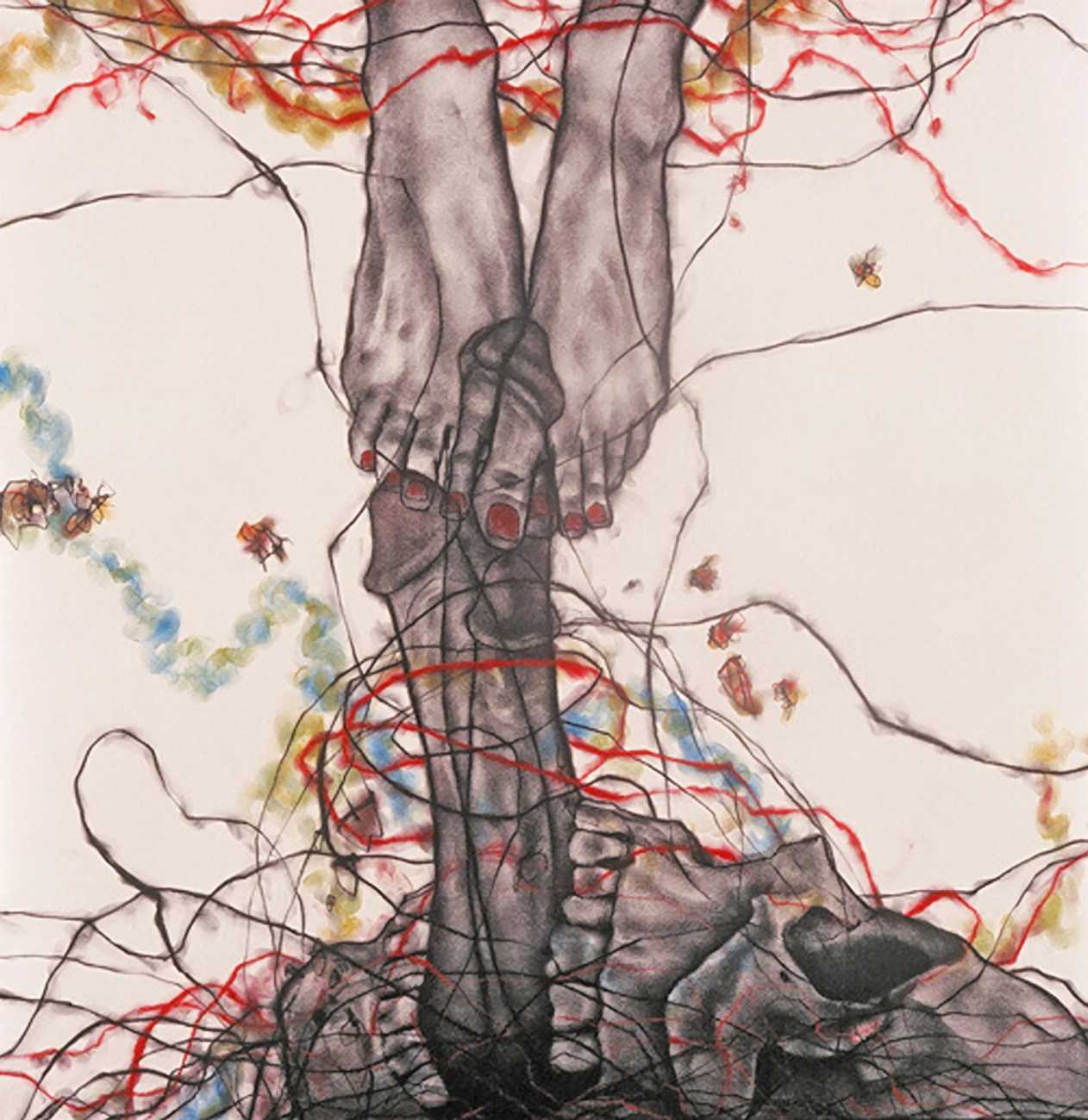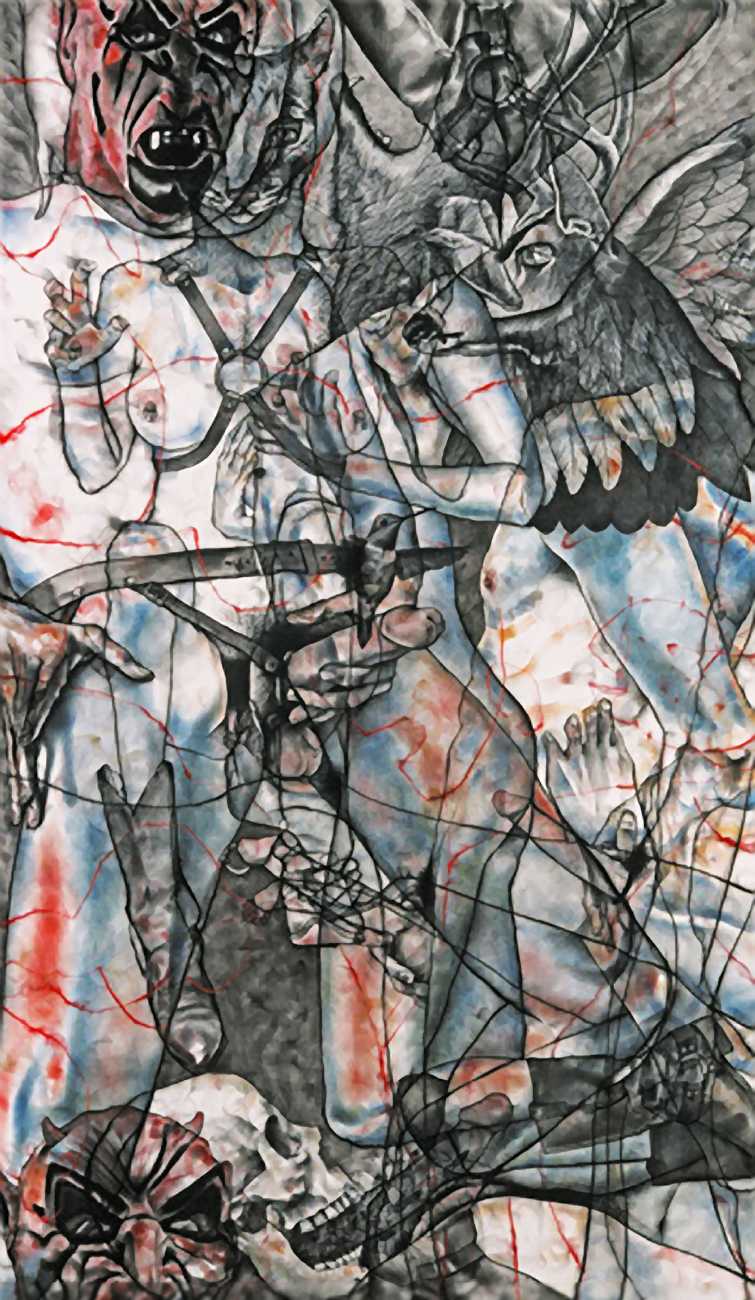In 2007 Phillip Dvorak produced one of his few specifically themed series of drawings, having visited the Mexican town of Mexicali on the US–Mexican border. His ‘Mexicali Compositions’ combine the elements associated with much of his art – the naked human body and its sexual components – with the symbolism of a border associated with pain and death, hence the barbed wire and skulls.