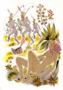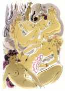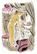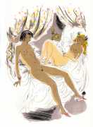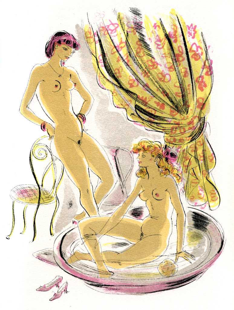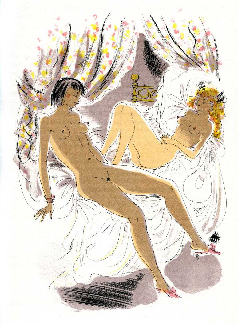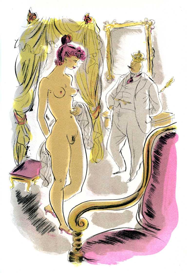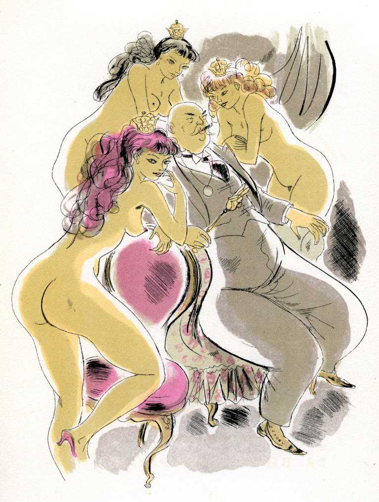 Schem’s illustrations for Pierre Louÿs’ Les aventures du Roi Pausole place this idyllic naturist realm firmly in the 1950s, where overall tans, pointy breasts and new-fangled Brazilians are the order of the day. The king appears to be a city banker when he’s not busy reigning. As Pausole illustrations go, they are about the least convincing of all the illustrators’ work on this website.