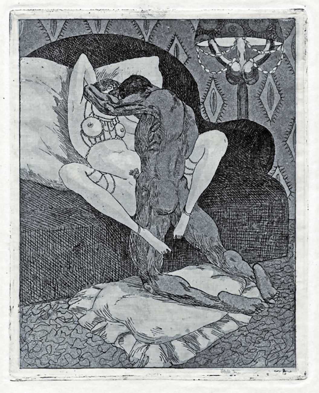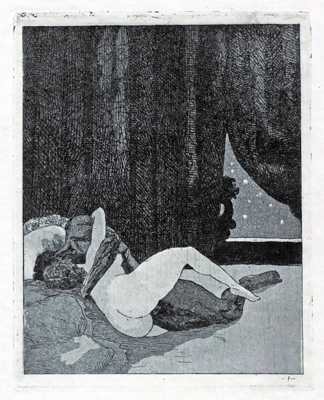 Liebesstufenleiter (Love’s Stepladder) is a suite of ten etchings that Lamm made to accompany writer Frank Wedekind’s play Schloss Wetterstein (Weatherstone Castle). ‘At the beginning of everything stands Wedekind’, wrote German literary critic Rudolf Kayser in 1917 of the new forms of expressionist theatre that were then becoming central to German culture. In Schloss Wetterstein, one of his most important plays, Wedekind (1864–1918) offers a satirical take on marriage and the bourgeois nuclear family; at the play’s centre is a rebellious teenage girl who turns to prostitution after her upbringing in an unstable household. The play was published in 1912, but a performance ban was put into effect immediately, and continued until after Wedekind’s death.