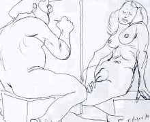 His stay in London and Ireland included visits to the island of Tresco in the Scilly Isles, resulting in a quartet of drawings from 1984 showing love among the humanoid rocks in the company of Neptune and his aquatic paramour. And as in his paintings, the relationship between nude model and equally nude artist is a common theme.