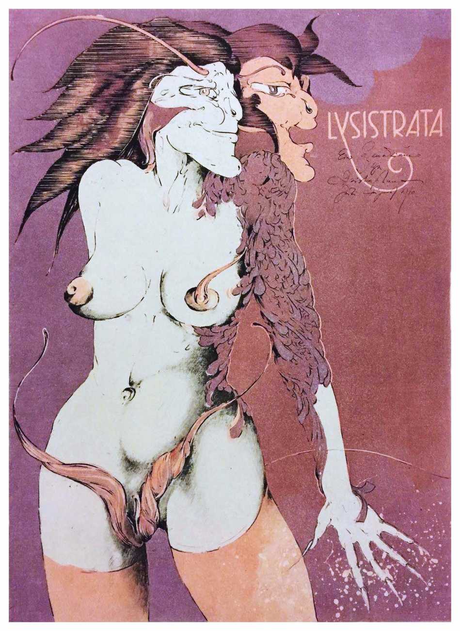 By far the best known illustrator of Lysistrata is Aubrey Beardsley, whose contribution you can see here; it is rather surprising that so few other artists have been inspired to create works based on the powerful drama featuring strong women and their strategies for reining in their menfolk.