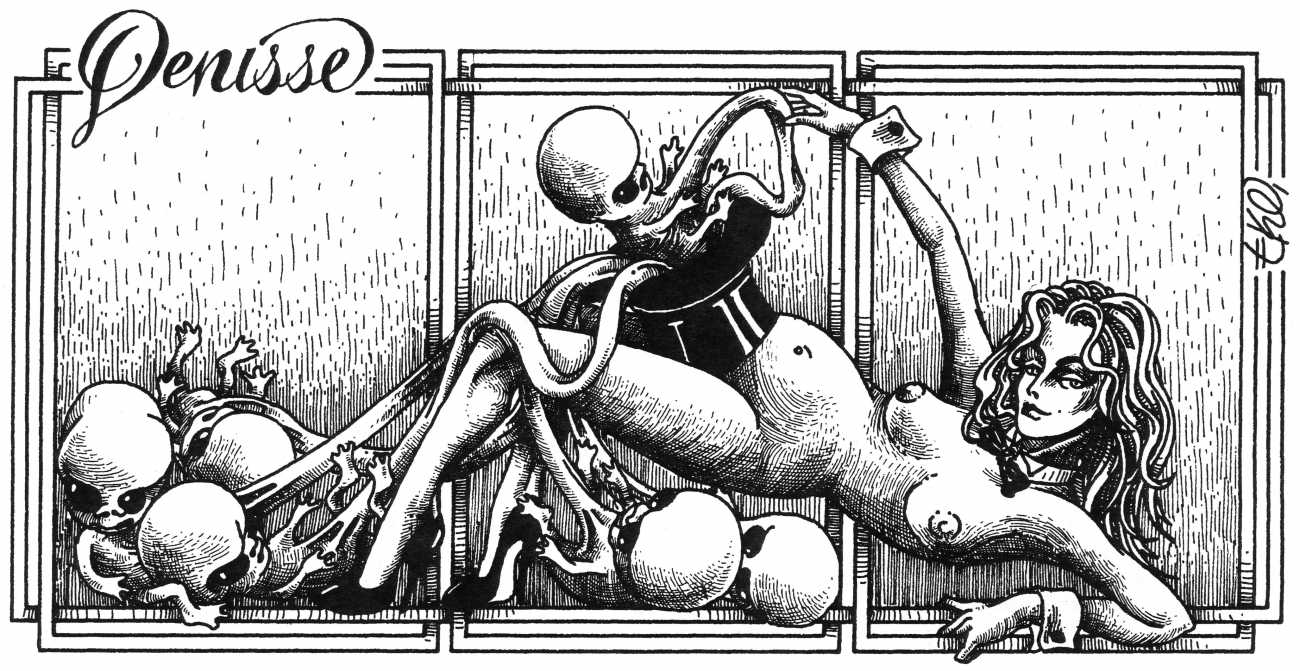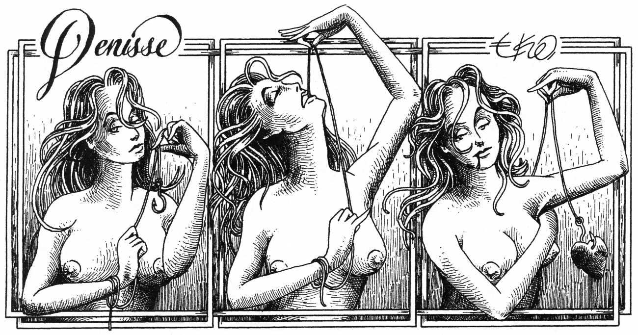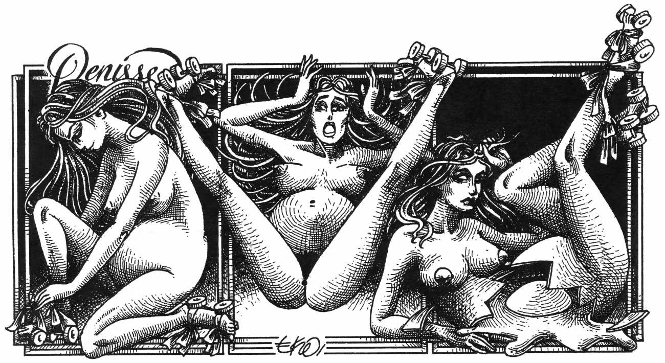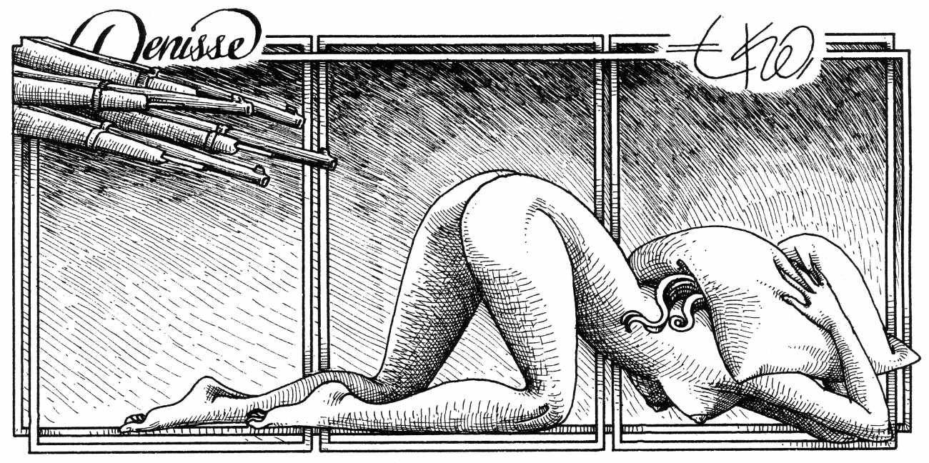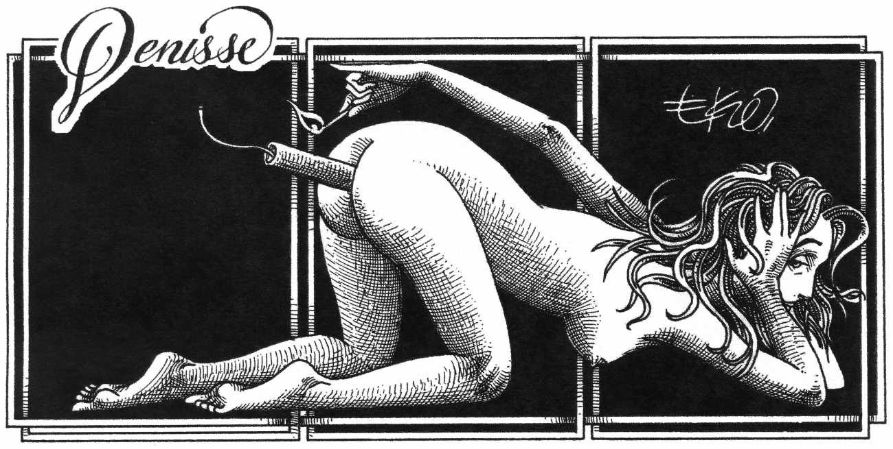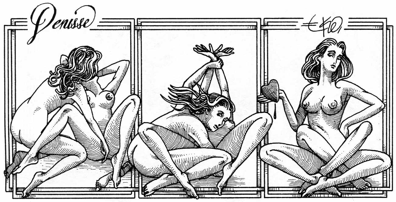 In his introduction to this, the most complete collection of Denisse, the fellow Mexican artist José Luis Cuevas (1934–2017) writes, ‘Denisse fascinates and obsesses me. Denisse’s creator is an exceptional cartoonist, a cultured man who has read the authors of erotic literature, especially the Marquis de Sade, and has studied the works of great artists. Denisse, as Eko himself explained it to me, is the result of his own sexual fantasies. She is not a prostitute; she is a lonely woman of enormous beauty, anguished by her erotic dreams. Her nymphomania leads her to populate her fantasies with skulls and corpses, pain and anguish.’