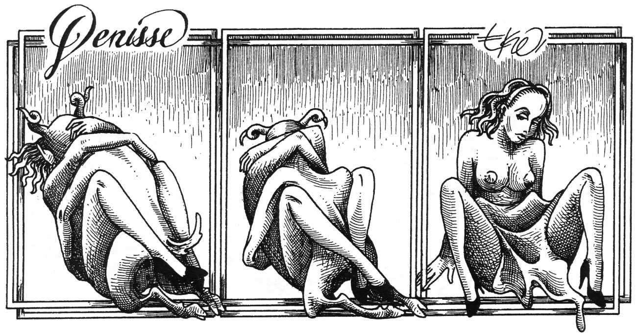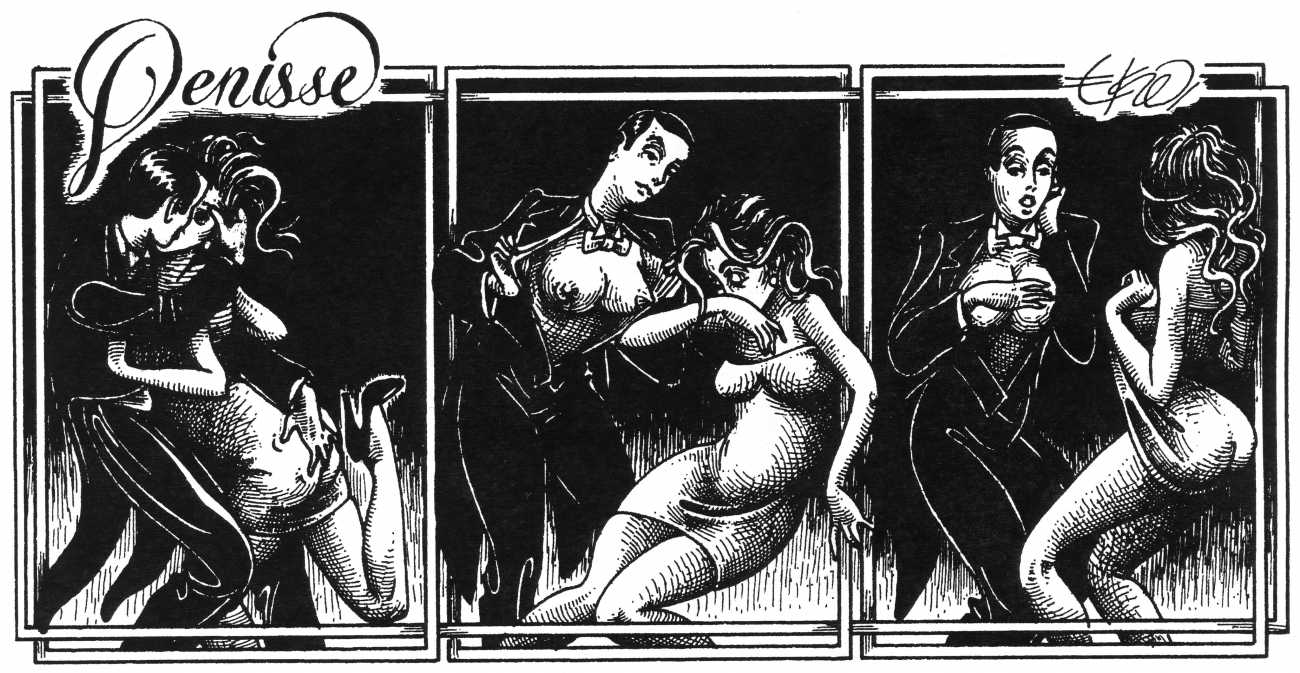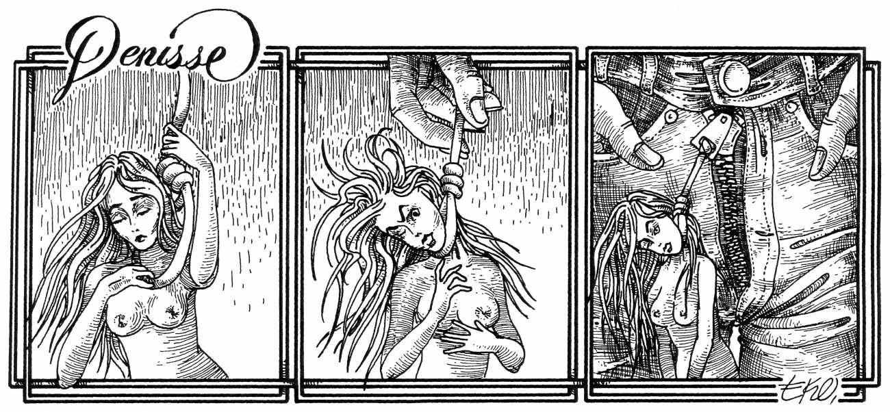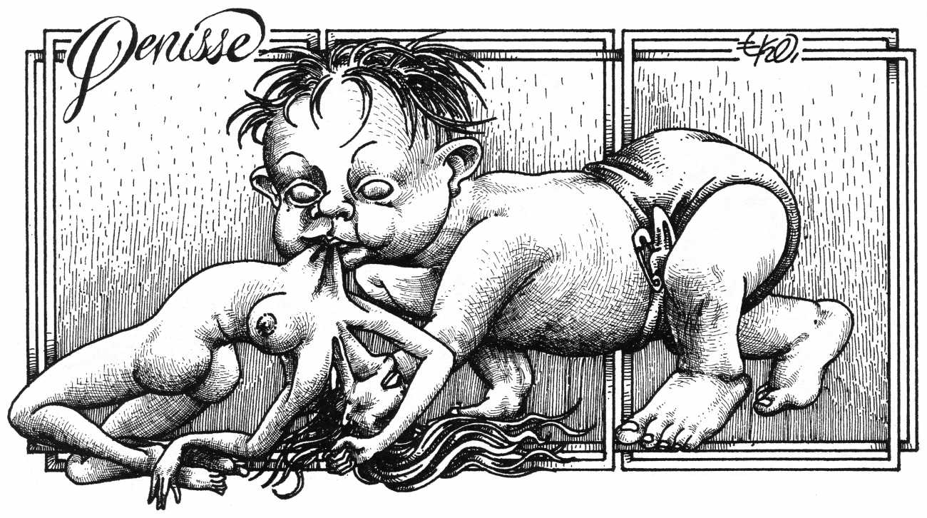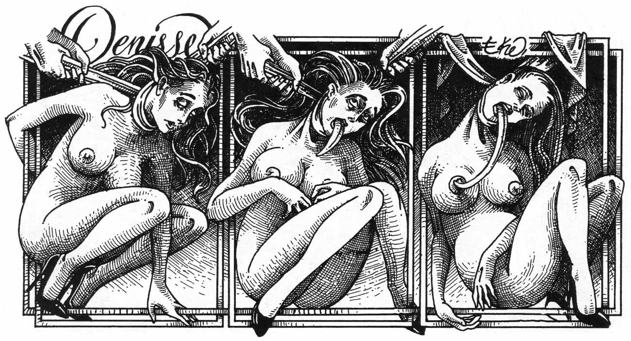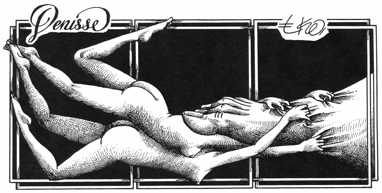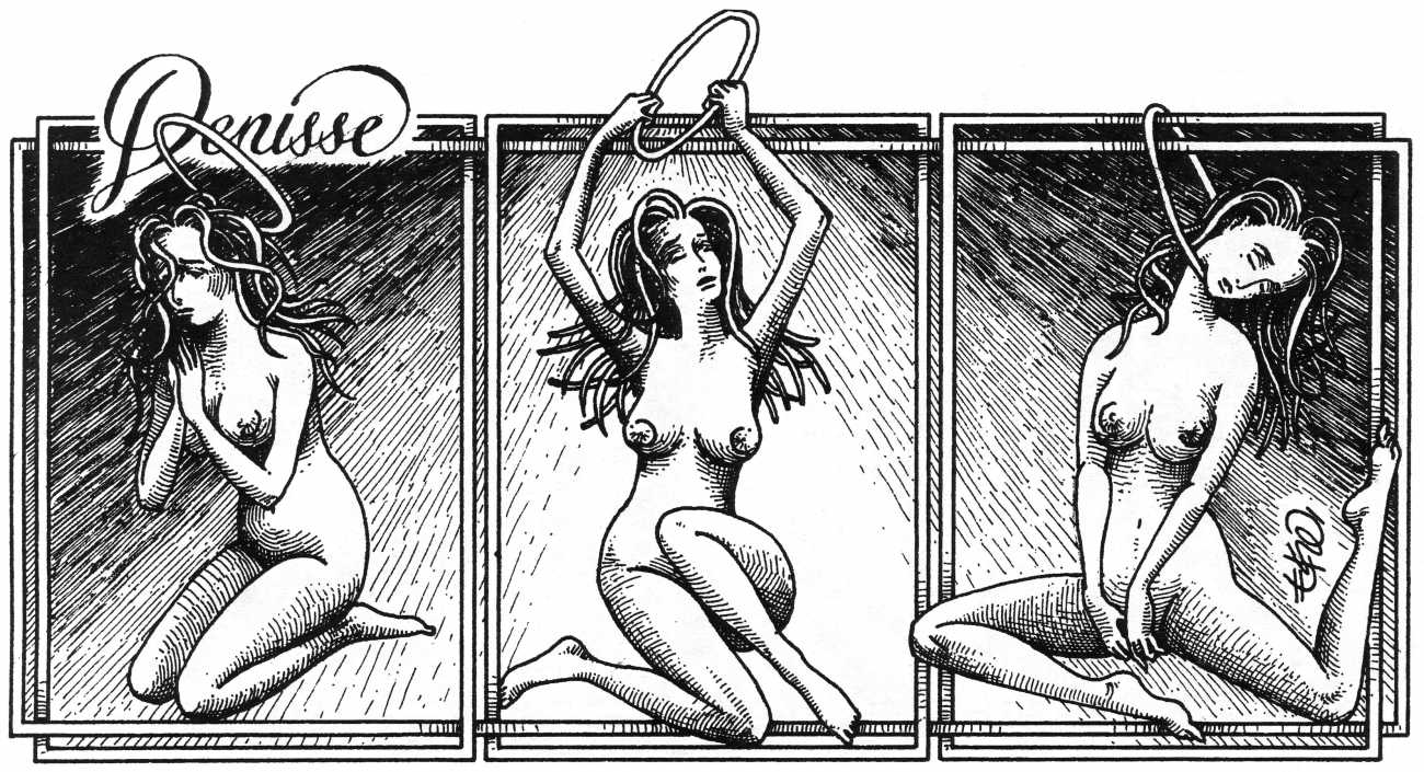 In his introduction to this, the most complete collection of Denisse, the fellow Mexican artist José Luis Cuevas (1934–2017) writes, ‘Denisse fascinates and obsesses me. Denisse’s creator is an exceptional cartoonist, a cultured man who has read the authors of erotic literature, especially the Marquis de Sade, and has studied the works of great artists. Denisse, as Eko himself explained it to me, is the result of his own sexual fantasies. She is not a prostitute; she is a lonely woman of enormous beauty, anguished by her erotic dreams. Her nymphomania leads her to populate her fantasies with skulls and corpses, pain and anguish.’