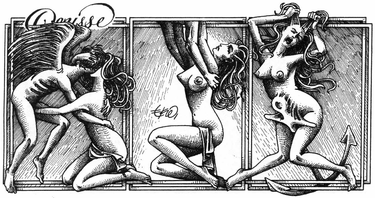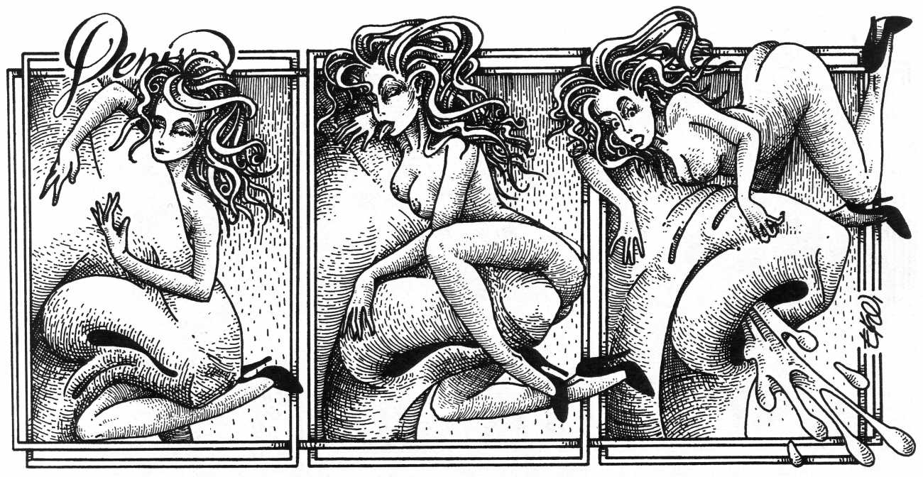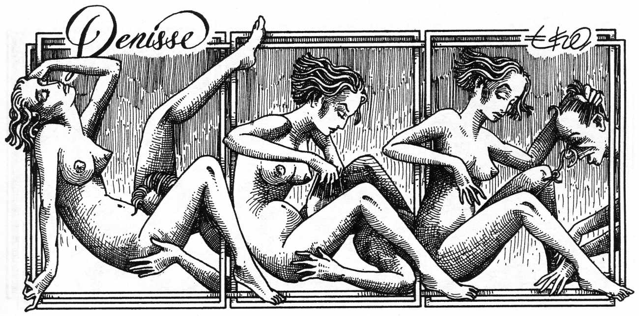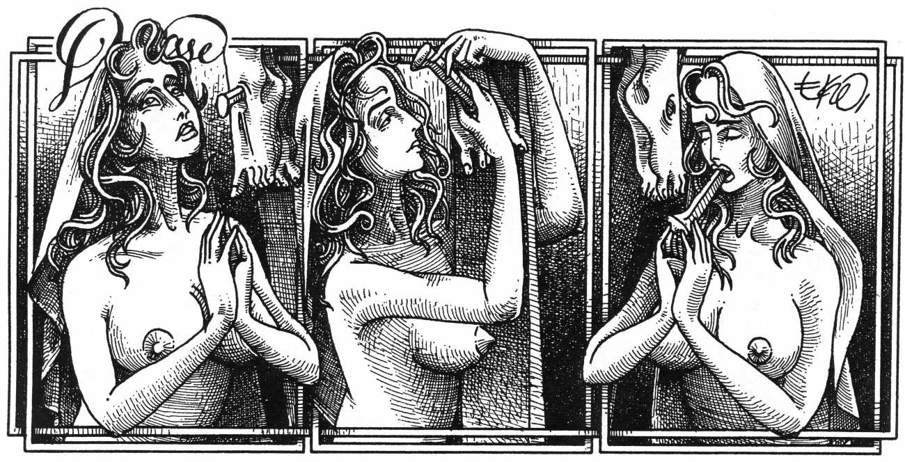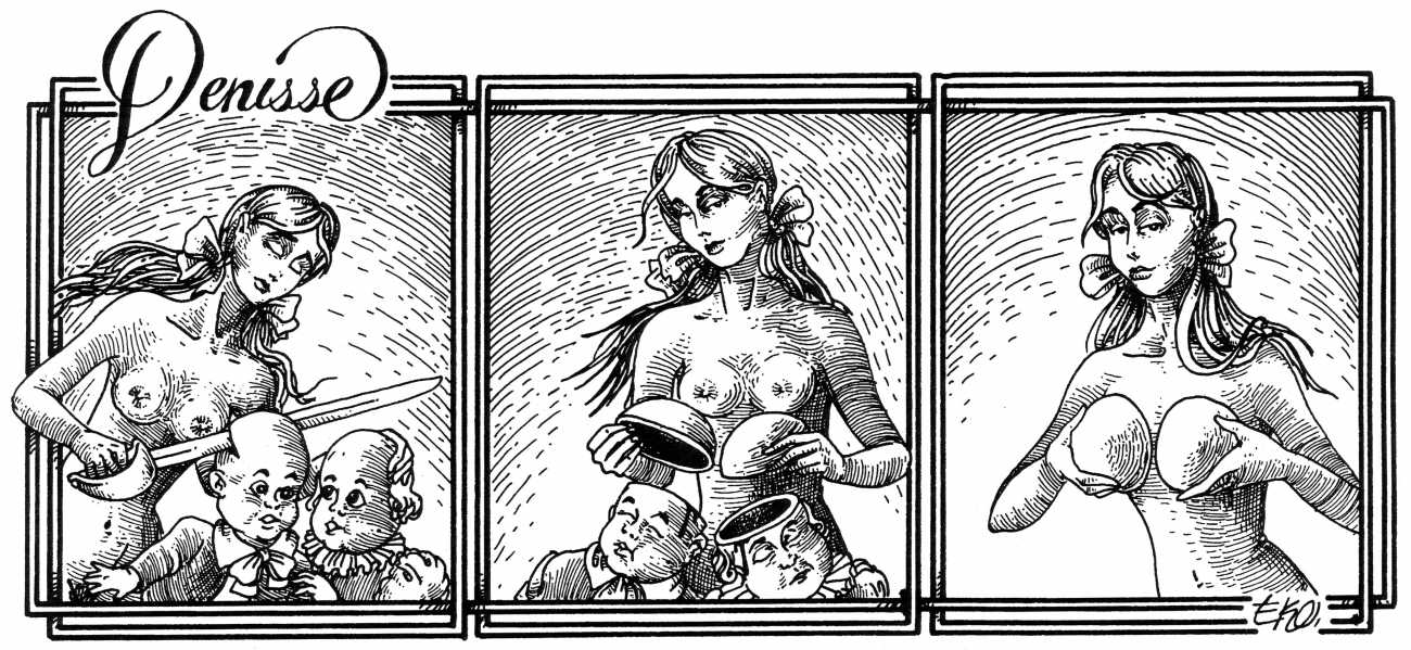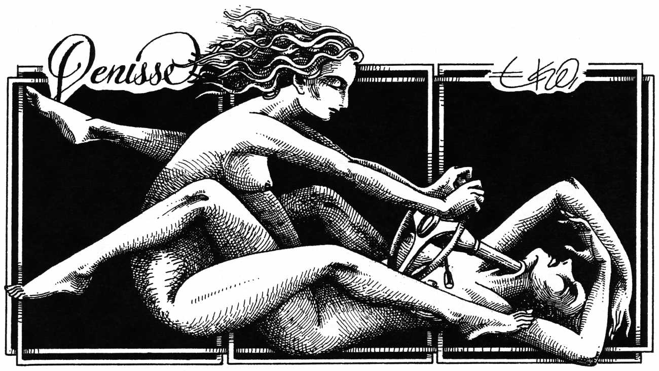 In his introduction to this, the most complete collection of Denisse, the fellow Mexican artist José Luis Cuevas (1934–2017) writes, ‘Denisse fascinates and obsesses me. Denisse’s creator is an exceptional cartoonist, a cultured man who has read the authors of erotic literature, especially the Marquis de Sade, and has studied the works of great artists. Denisse, as Eko himself explained it to me, is the result of his own sexual fantasies. She is not a prostitute; she is a lonely woman of enormous beauty, anguished by her erotic dreams. Her nymphomania leads her to populate her fantasies with skulls and corpses, pain and anguish.’