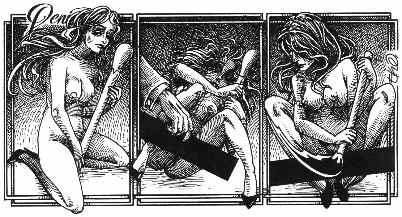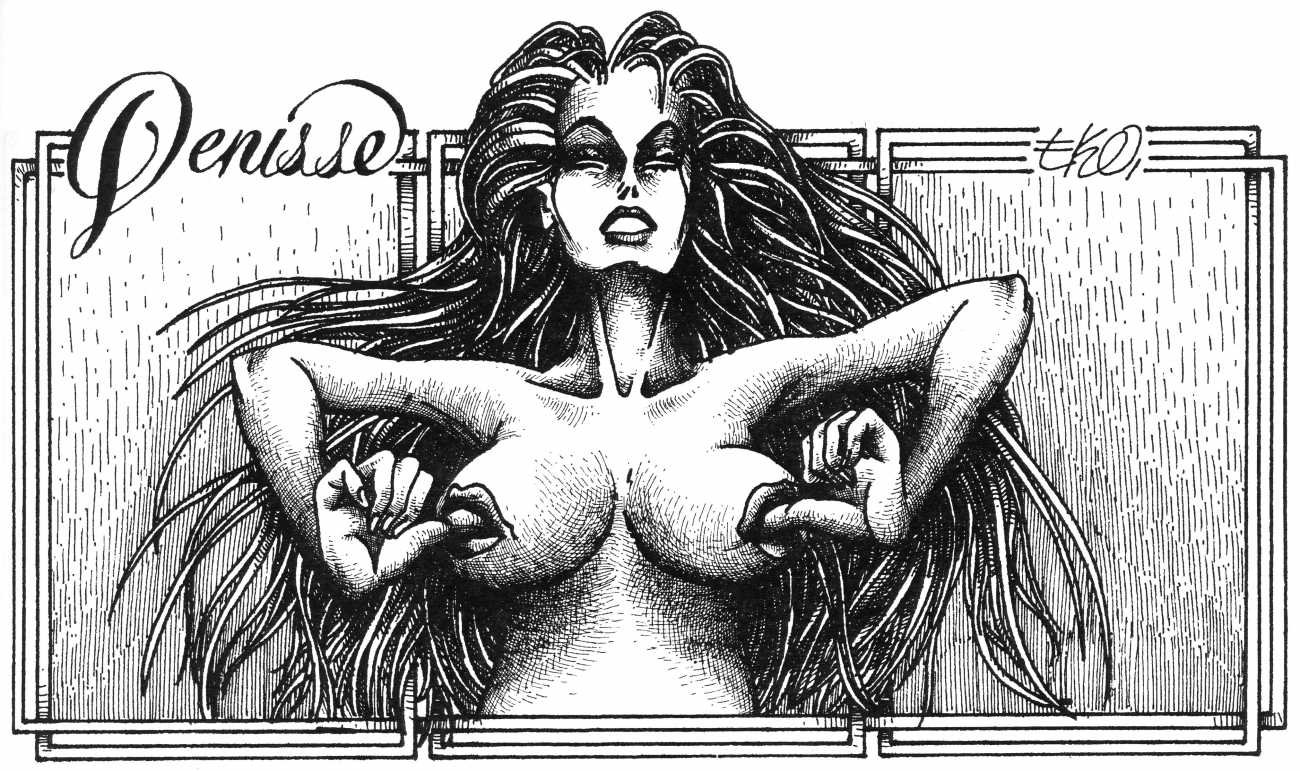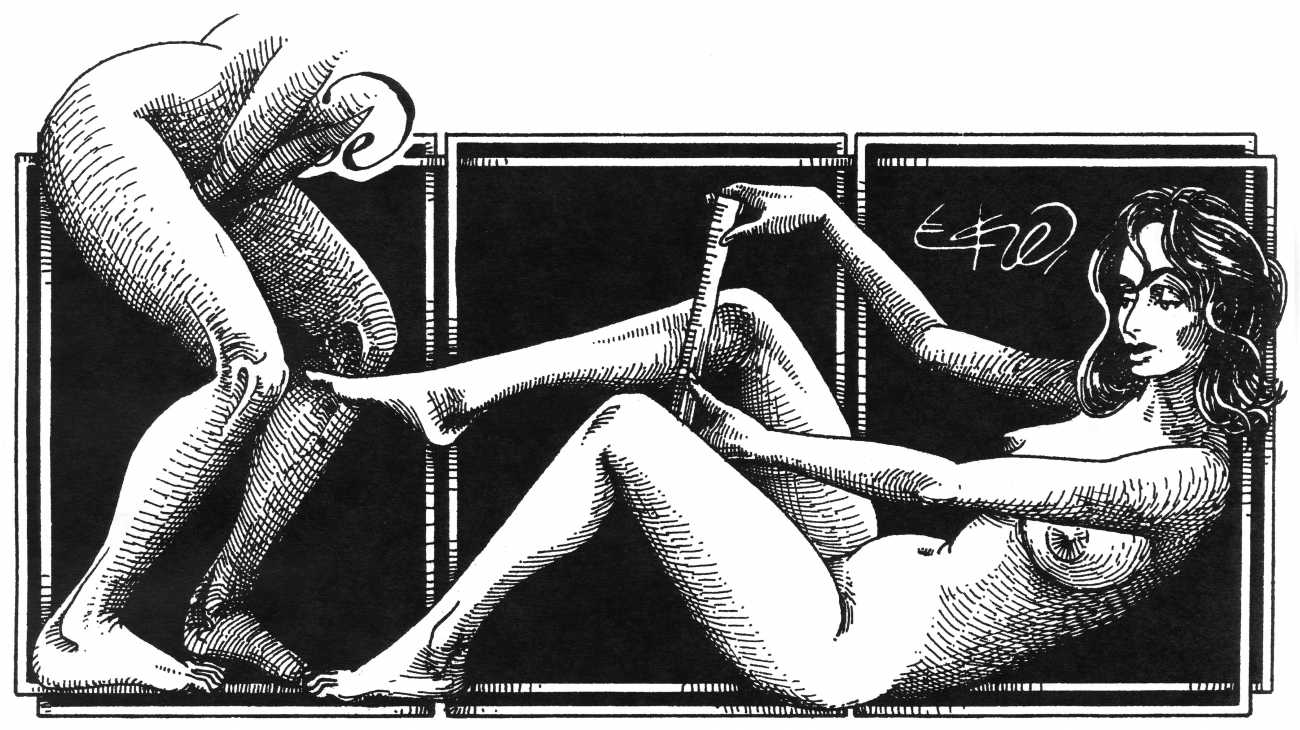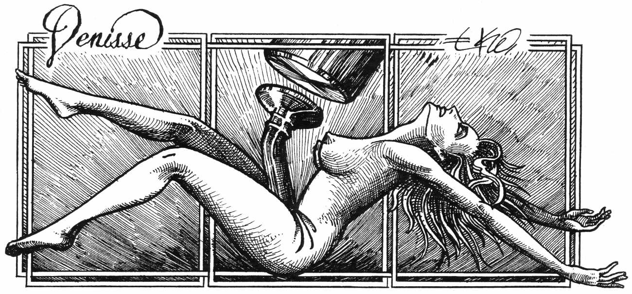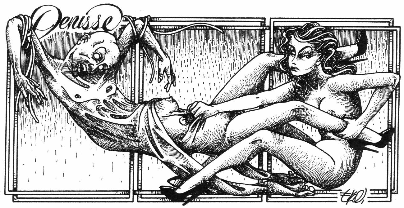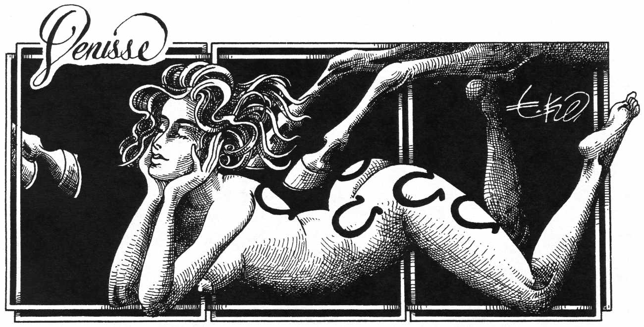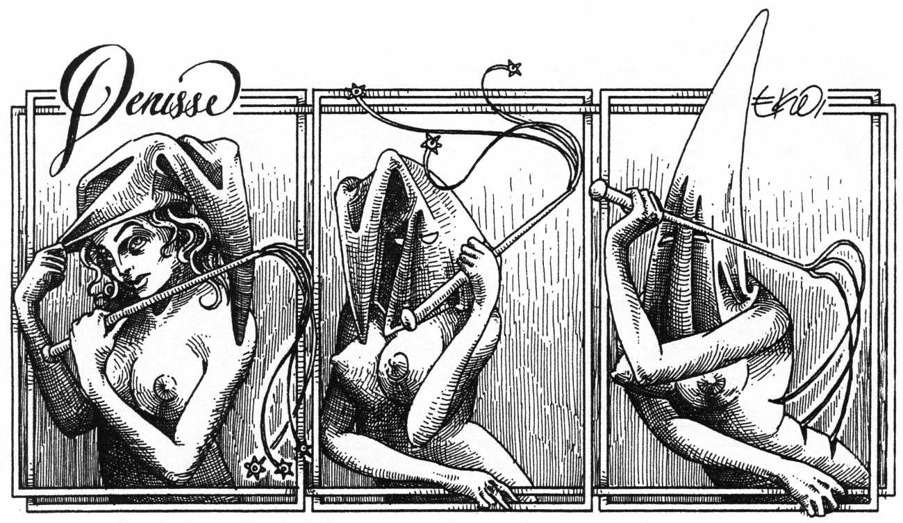 In his introduction to this, the most complete collection of Denisse, the fellow Mexican artist José Luis Cuevas (1934–2017) writes, ‘Denisse fascinates and obsesses me. Denisse’s creator is an exceptional cartoonist, a cultured man who has read the authors of erotic literature, especially the Marquis de Sade, and has studied the works of great artists. Denisse, as Eko himself explained it to me, is the result of his own sexual fantasies. She is not a prostitute; she is a lonely woman of enormous beauty, anguished by her erotic dreams. Her nymphomania leads her to populate her fantasies with skulls and corpses, pain and anguish.’