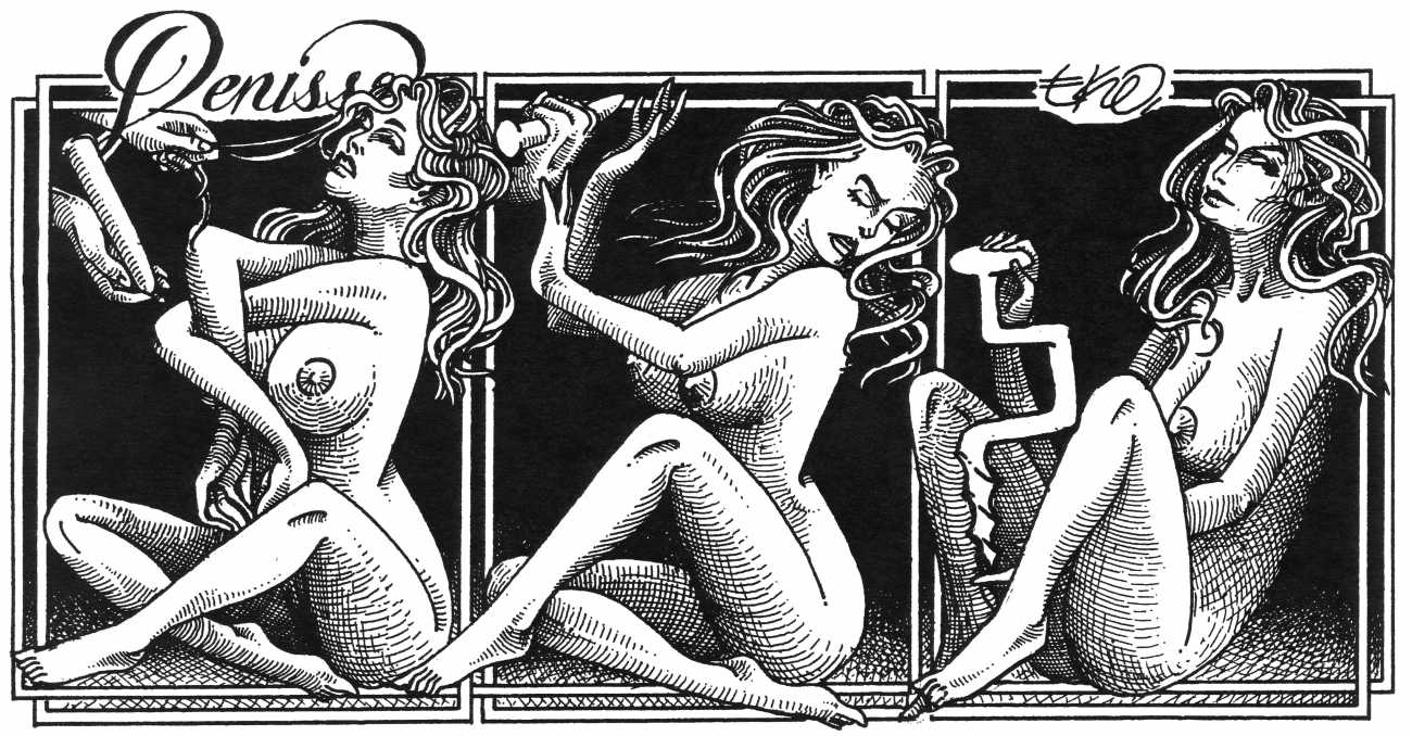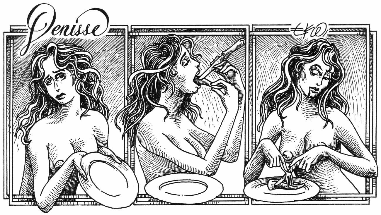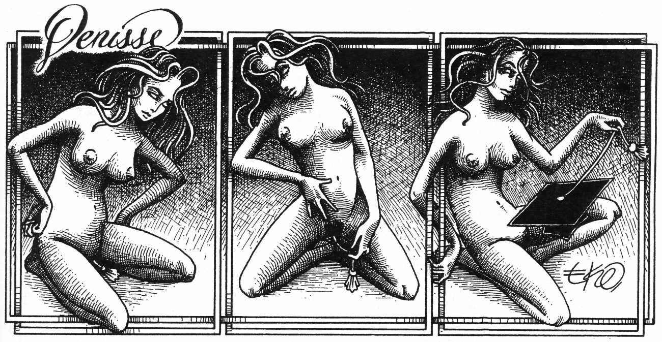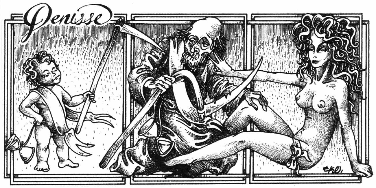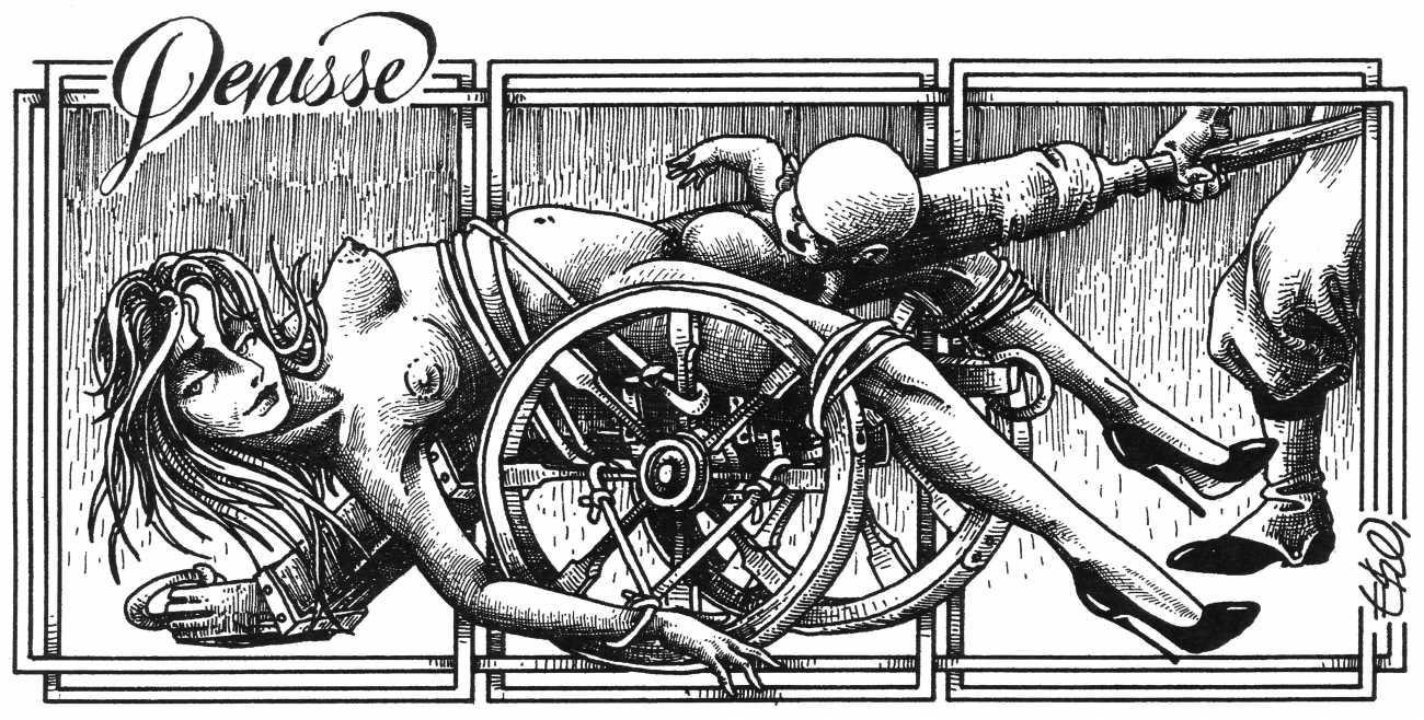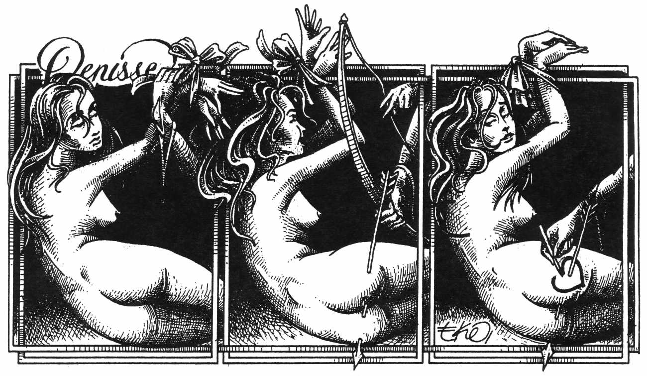 In his introduction to this, the most complete collection of Denisse, the fellow Mexican artist José Luis Cuevas (1934–2017) writes, ‘Denisse fascinates and obsesses me. Denisse’s creator is an exceptional cartoonist, a cultured man who has read the authors of erotic literature, especially the Marquis de Sade, and has studied the works of great artists. Denisse, as Eko himself explained it to me, is the result of his own sexual fantasies. She is not a prostitute; she is a lonely woman of enormous beauty, anguished by her erotic dreams. Her nymphomania leads her to populate her fantasies with skulls and corpses, pain and anguish.’