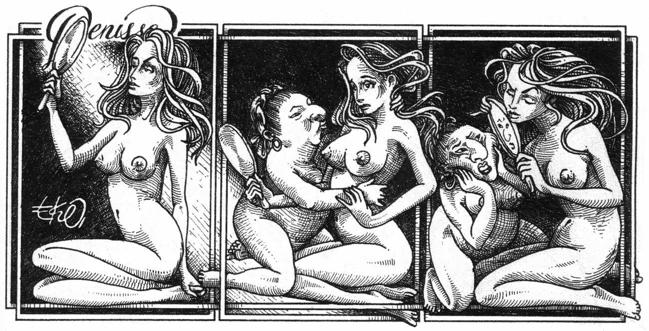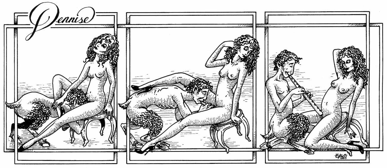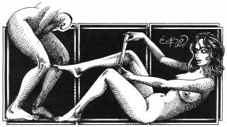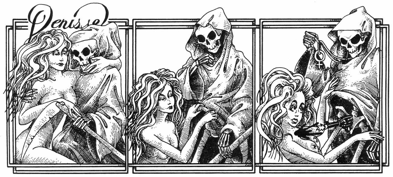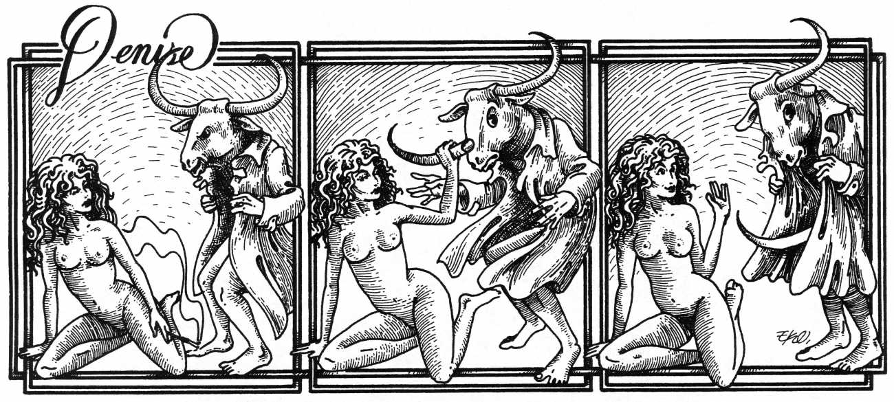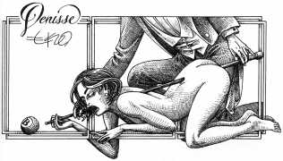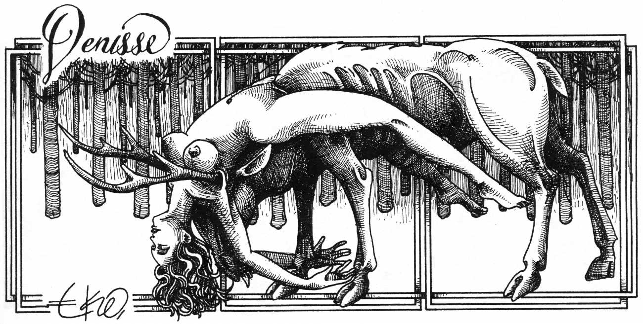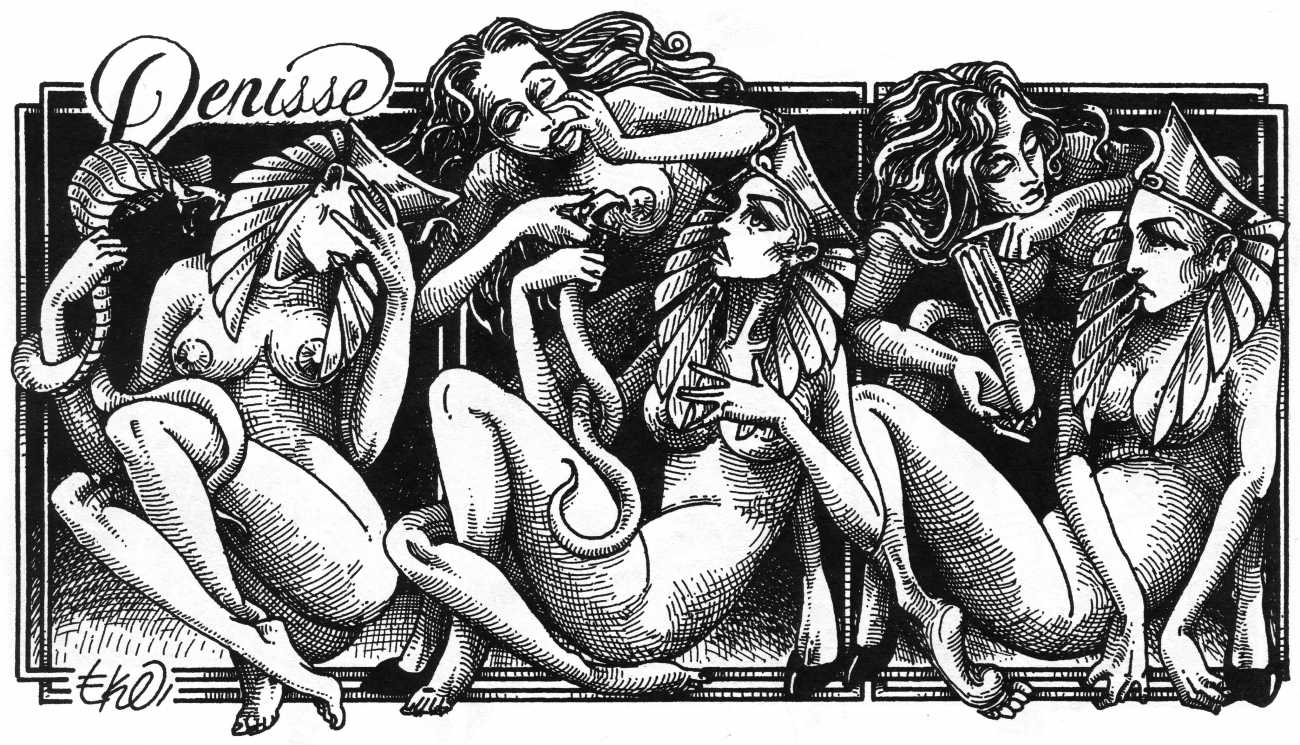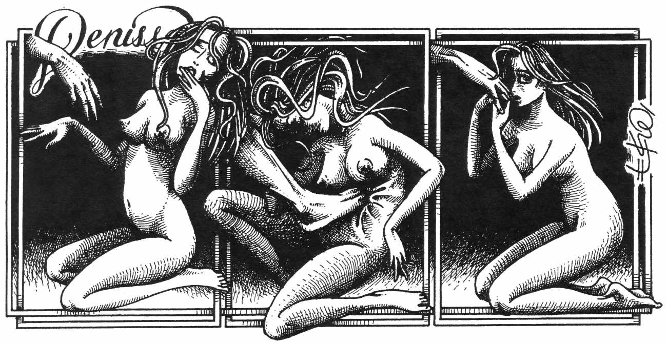 In his introduction to this, the most complete collection of Denisse, the fellow Mexican artist José Luis Cuevas (1934–2017) writes, ‘Denisse fascinates and obsesses me. Denisse’s creator is an exceptional cartoonist, a cultured man who has read the authors of erotic literature, especially the Marquis de Sade, and has studied the works of great artists. Denisse, as Eko himself explained it to me, is the result of his own sexual fantasies. She is not a prostitute; she is a lonely woman of enormous beauty, anguished by her erotic dreams. Her nymphomania leads her to populate her fantasies with skulls and corpses, pain and anguish.’