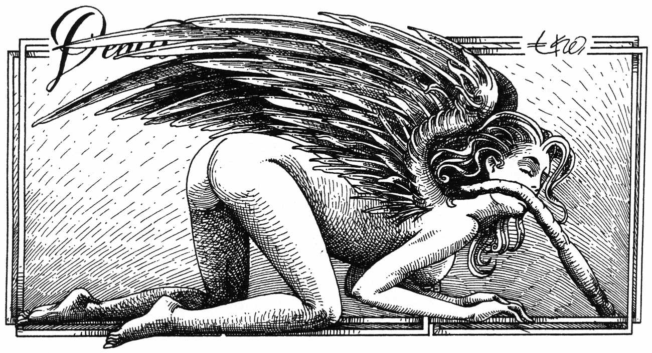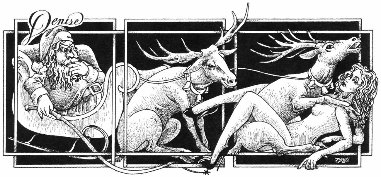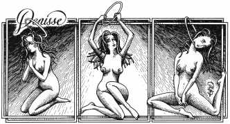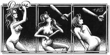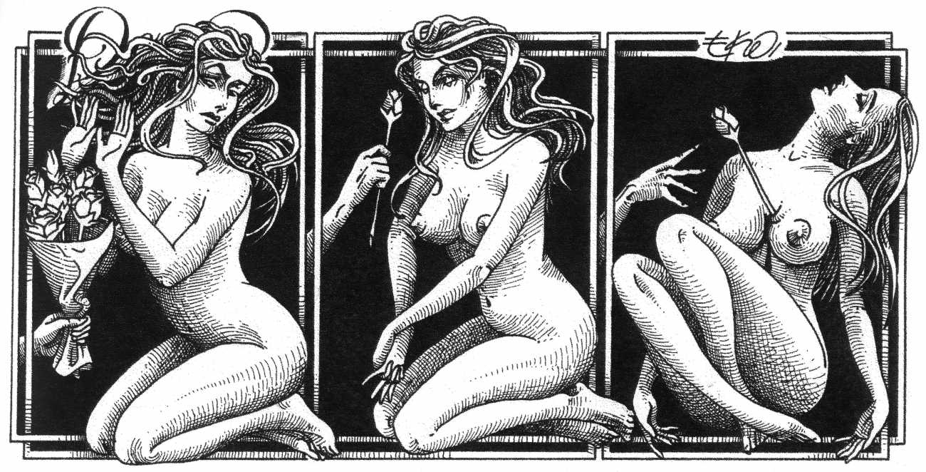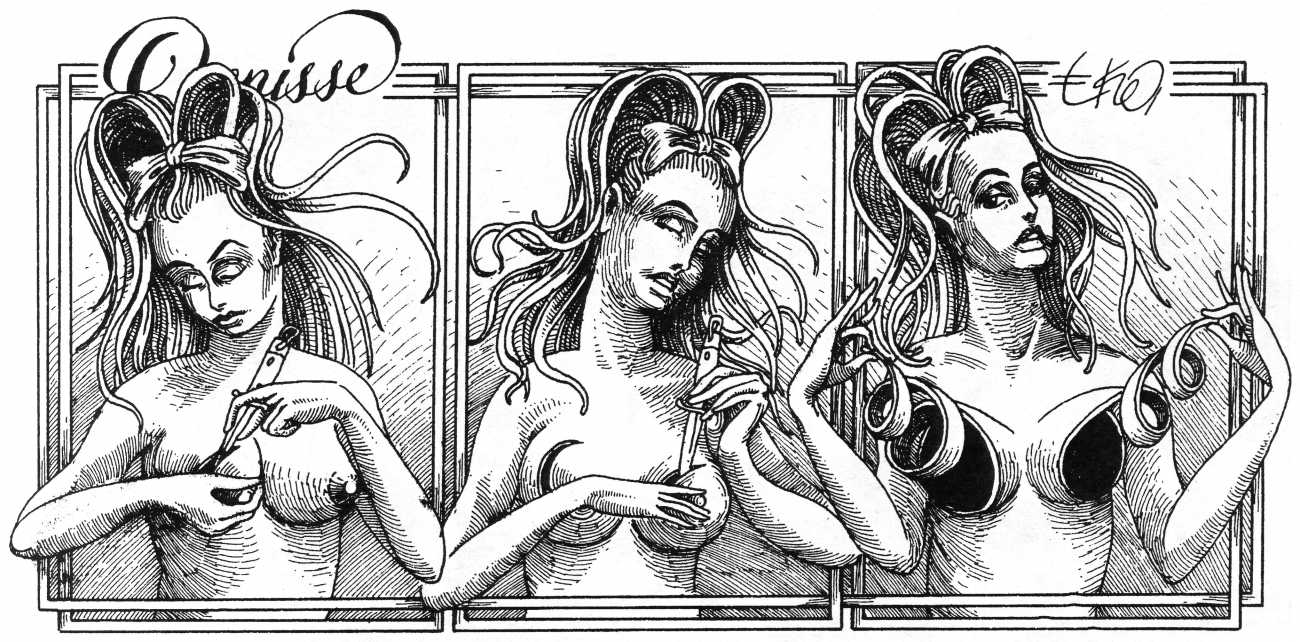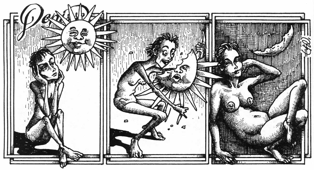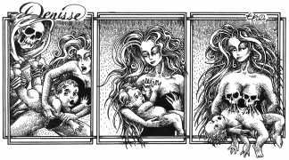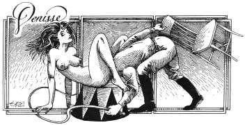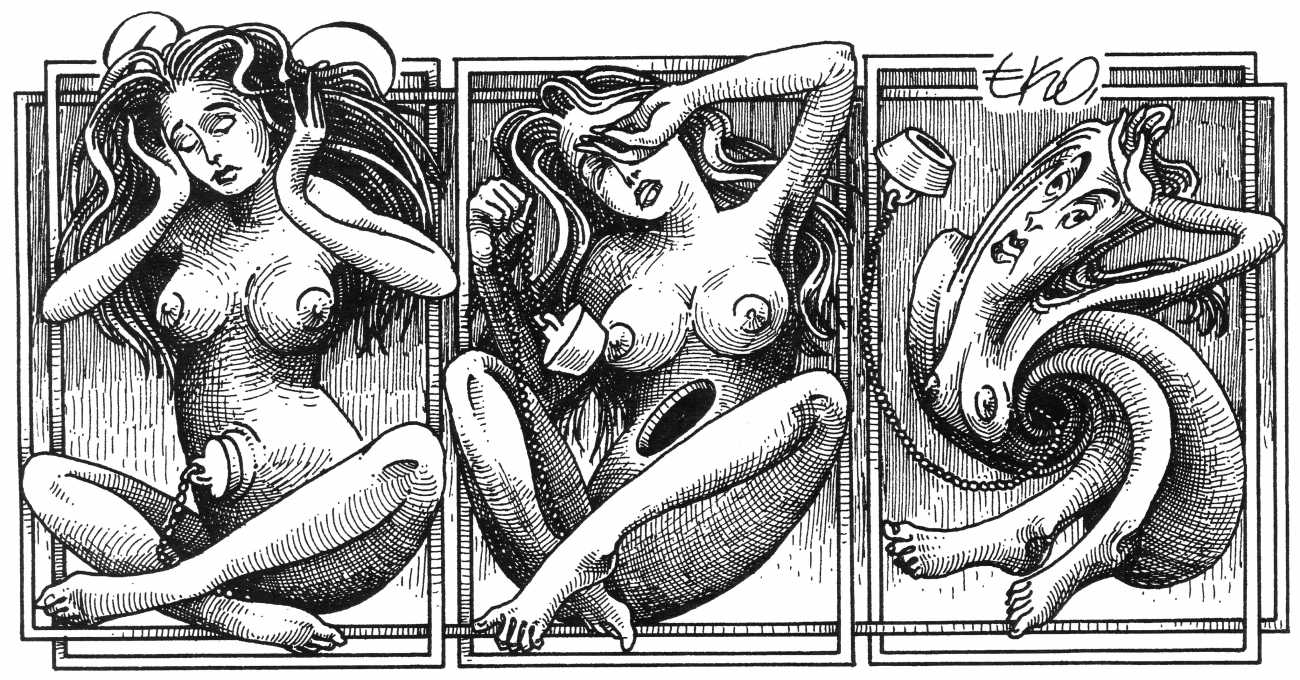 In his introduction to this, the most complete collection of Denisse, the fellow Mexican artist José Luis Cuevas (1934–2017) writes, ‘Denisse fascinates and obsesses me. Denisse’s creator is an exceptional cartoonist, a cultured man who has read the authors of erotic literature, especially the Marquis de Sade, and has studied the works of great artists. Denisse, as Eko himself explained it to me, is the result of his own sexual fantasies. She is not a prostitute; she is a lonely woman of enormous beauty, anguished by her erotic dreams. Her nymphomania leads her to populate her fantasies with skulls and corpses, pain and anguish.’