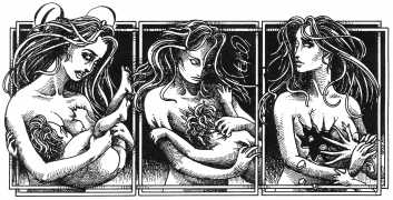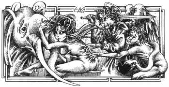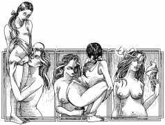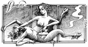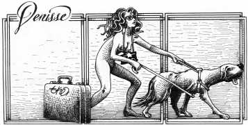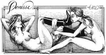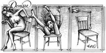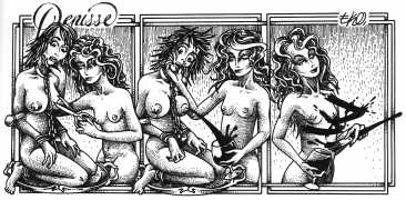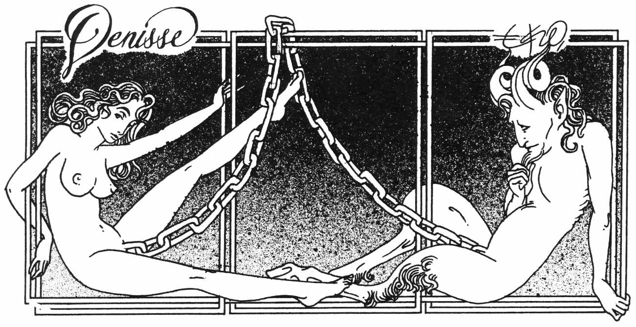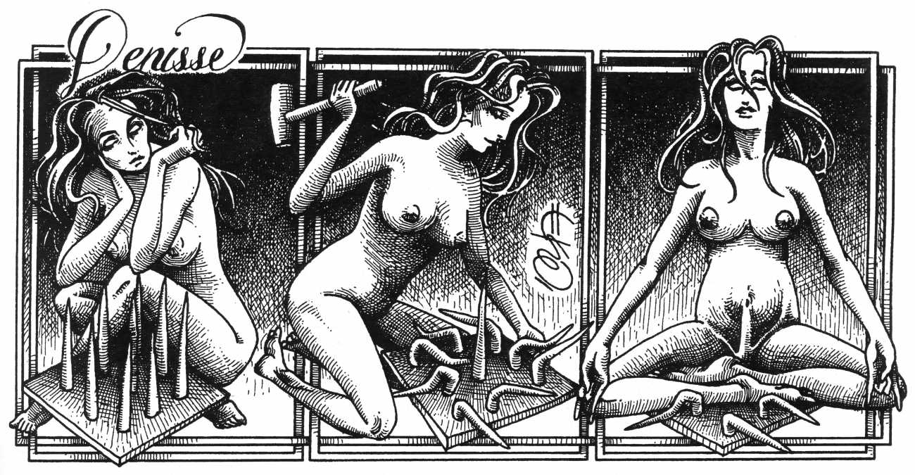 Here is Armando Pereira again: ‘Denisse’s naked body is not only surrounded by other bodies, bodies of men and women, satyrs and demons, with which she shares desperate intimacy. It is also accompanied by a whole instrumental universe invoked to increase pleasure – swords, bananas, scissors, toilets, nails, dog collars, whips and screws. These objects in themselves rarely carry a single meaning, often undergoing a metamorphosis in which the phallic object is devoured, where the pain of an incision in the flesh becomes a secret and longed for pleasure, where the material universe deviates from its original purpose and is put at the service of pleasure, where the imaginary initiates scenarios without limits.’