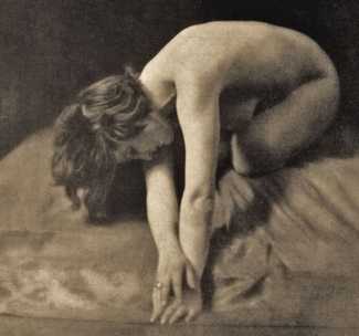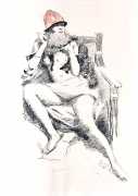 Berend sketched eight images of Berber, each capturing her in a new and more provocative pose. There was the terrified child in a short hoop-skirt which fell just below her naval, directing the viewer’s eye straight to the startled figure’s exposed vulva and lower torso; the smiling adolescent, bagging her nightgown from top to bottom to display her boyish breasts as well as her pubic hair and a single silk stocking; the confident fashion model sprawled across a chair; the inviting whore, sensationally naked except for an open black overcoat, rolled-up stockings and high-heeled pumps; the saucy revue-girl at her makeup table, tonguing a phallic-looking oyster; a hard-faced dancer in Parisian attire, expertly pleasuring herself with her right leg thrown over the arm of a chair; a beckoning bride, wearing only dark hosiery, in a curtained chamber room; and a naked open-mouthed showgirl, seated on her fur wraps.