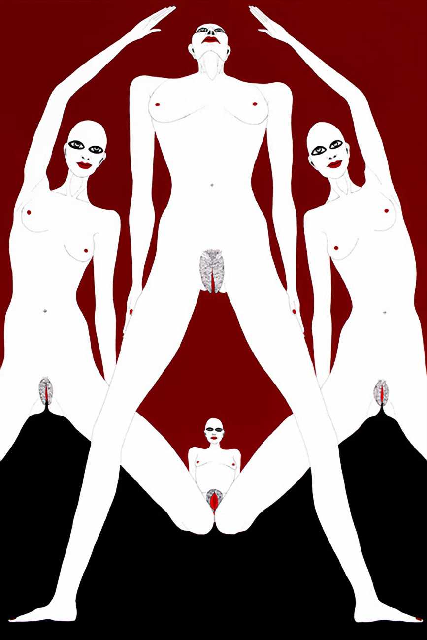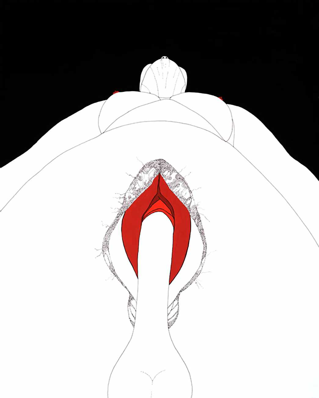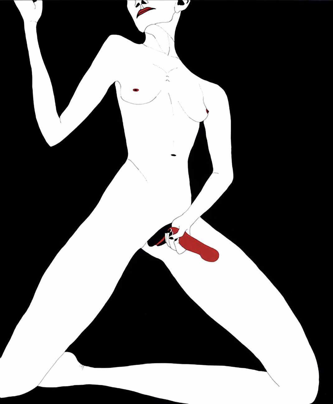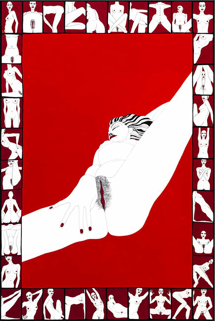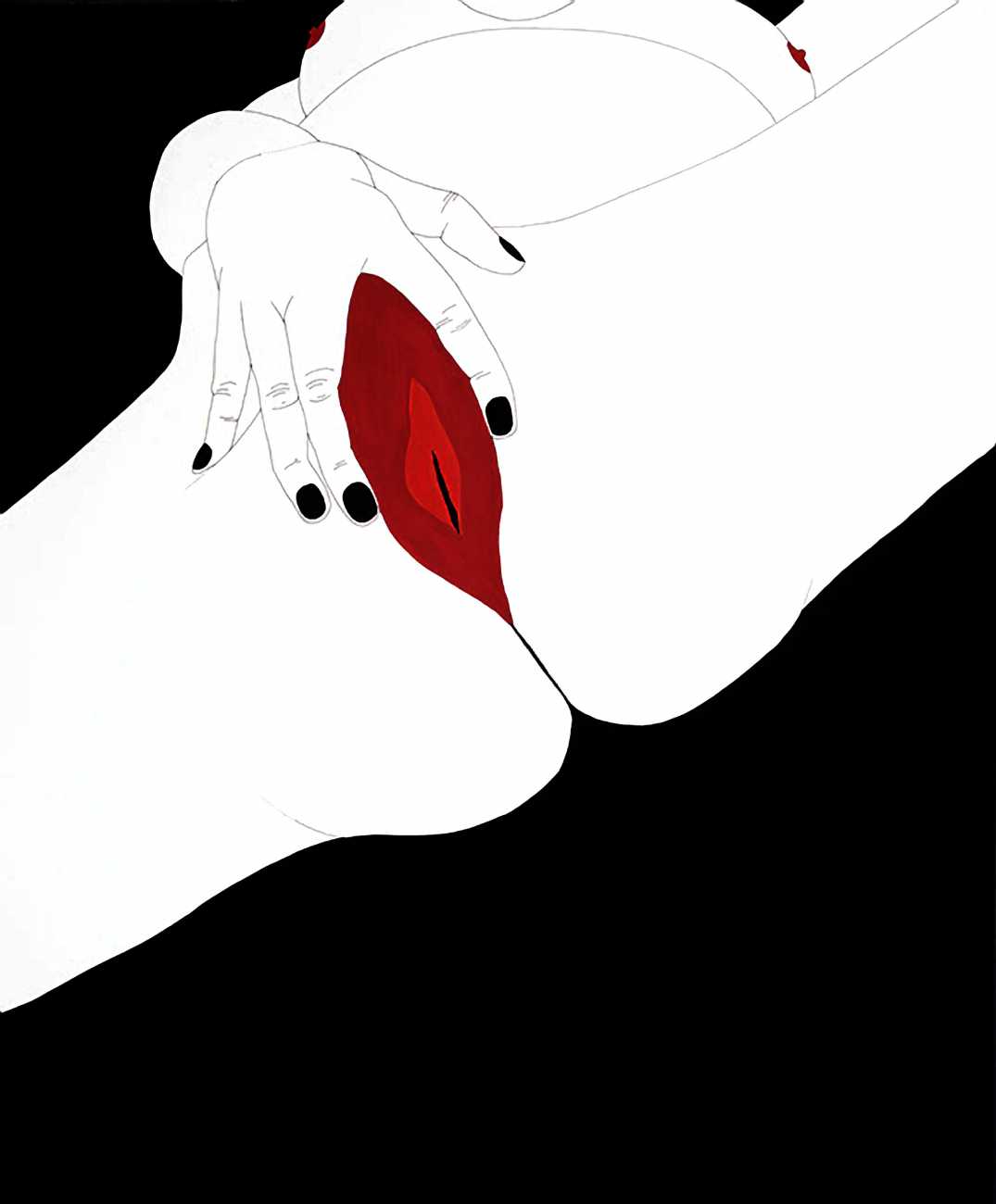 Up to the end of 2015 her drawings were in simple black ink, often clearly autobiographical with captions and poems. Then in 2016 the trademark red appeared, along with stylised celebratory depictions of vulvas and cocks. Since then she has devoted herself to graphics which explore sexual themes in her own terms, often using carefully-composed selfies as reference. She gives these bold, exquisitely delineated compositions that frequently isolate and emphasise the sex organs explanatory titles which match the directness of the artwork – ‘Out and Proud’, ‘Choose Me’, ‘Just Because I’m On My Back Doesn’t Mean I’m Not In Charge’. As she explains, the transition from a Catholic girl’s body shame, to abusive scrutiny as a model, to autonomous self-expression, has been liberating. ‘Screw that,’ she says, ‘I’m showing everything and I own it.’