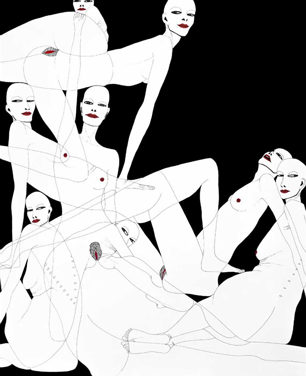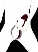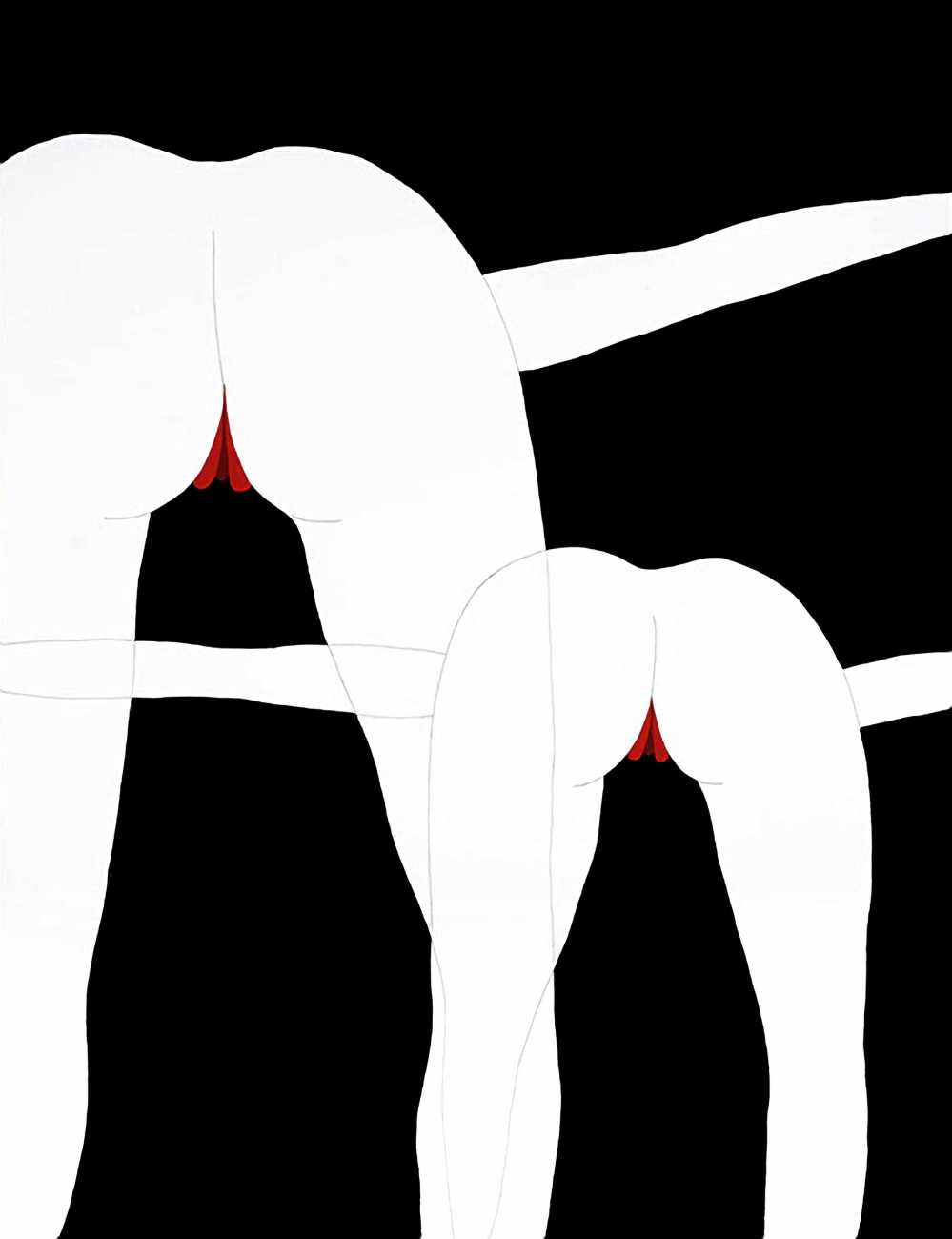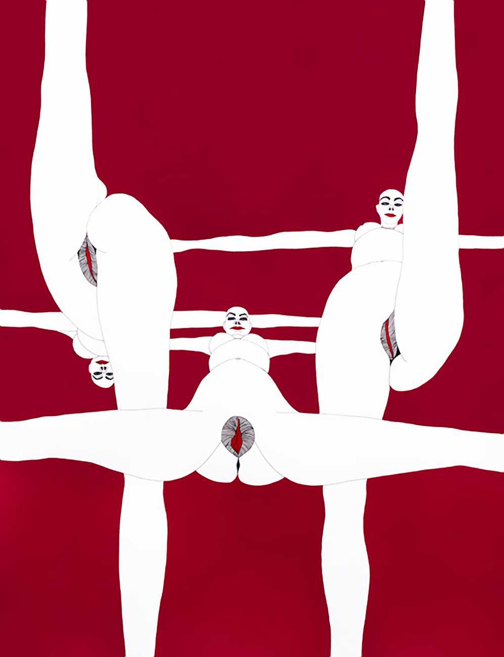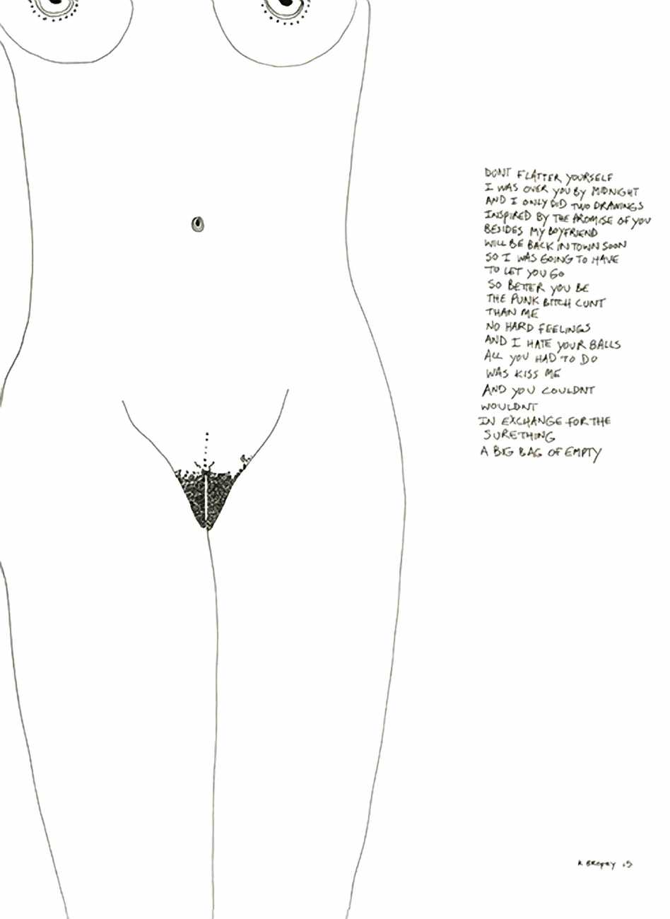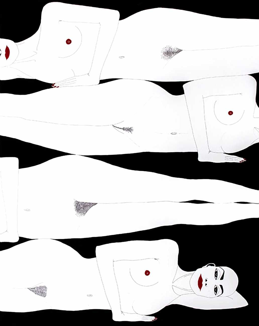 Up to the end of 2015 her drawings were in simple black ink, often clearly autobiographical with captions and poems. Then in 2016 the trademark red appeared, along with stylised celebratory depictions of vulvas and cocks. Since then she has devoted herself to graphics which explore sexual themes in her own terms, often using carefully-composed selfies as reference. She gives these bold, exquisitely delineated compositions that frequently isolate and emphasise the sex organs explanatory titles which match the directness of the artwork – ‘Out and Proud’, ‘Choose Me’, ‘Just Because I’m On My Back Doesn’t Mean I’m Not In Charge’. As she explains, the transition from a Catholic girl’s body shame, to abusive scrutiny as a model, to autonomous self-expression, has been liberating. ‘Screw that,’ she says, ‘I’m showing everything and I own it.’