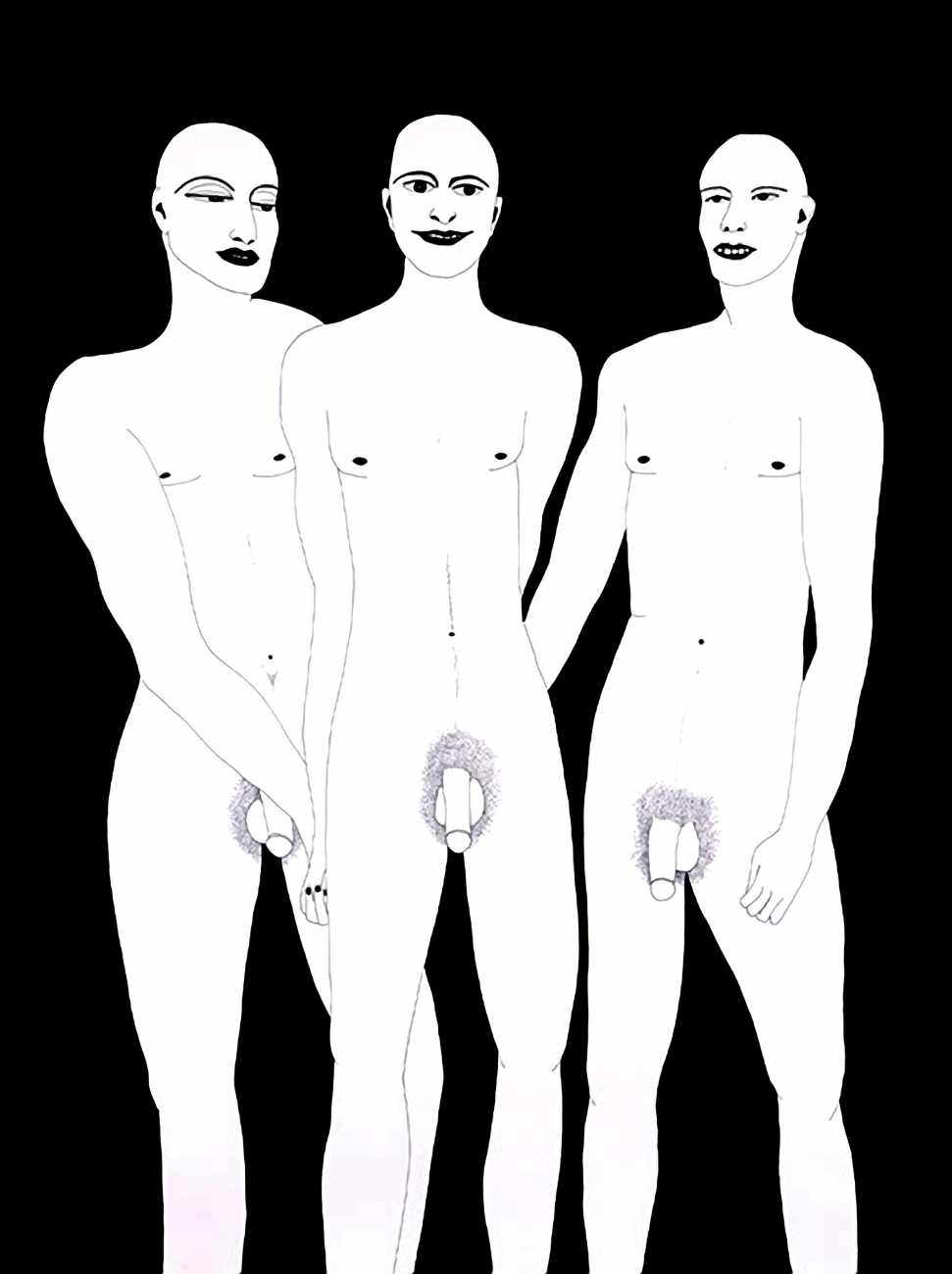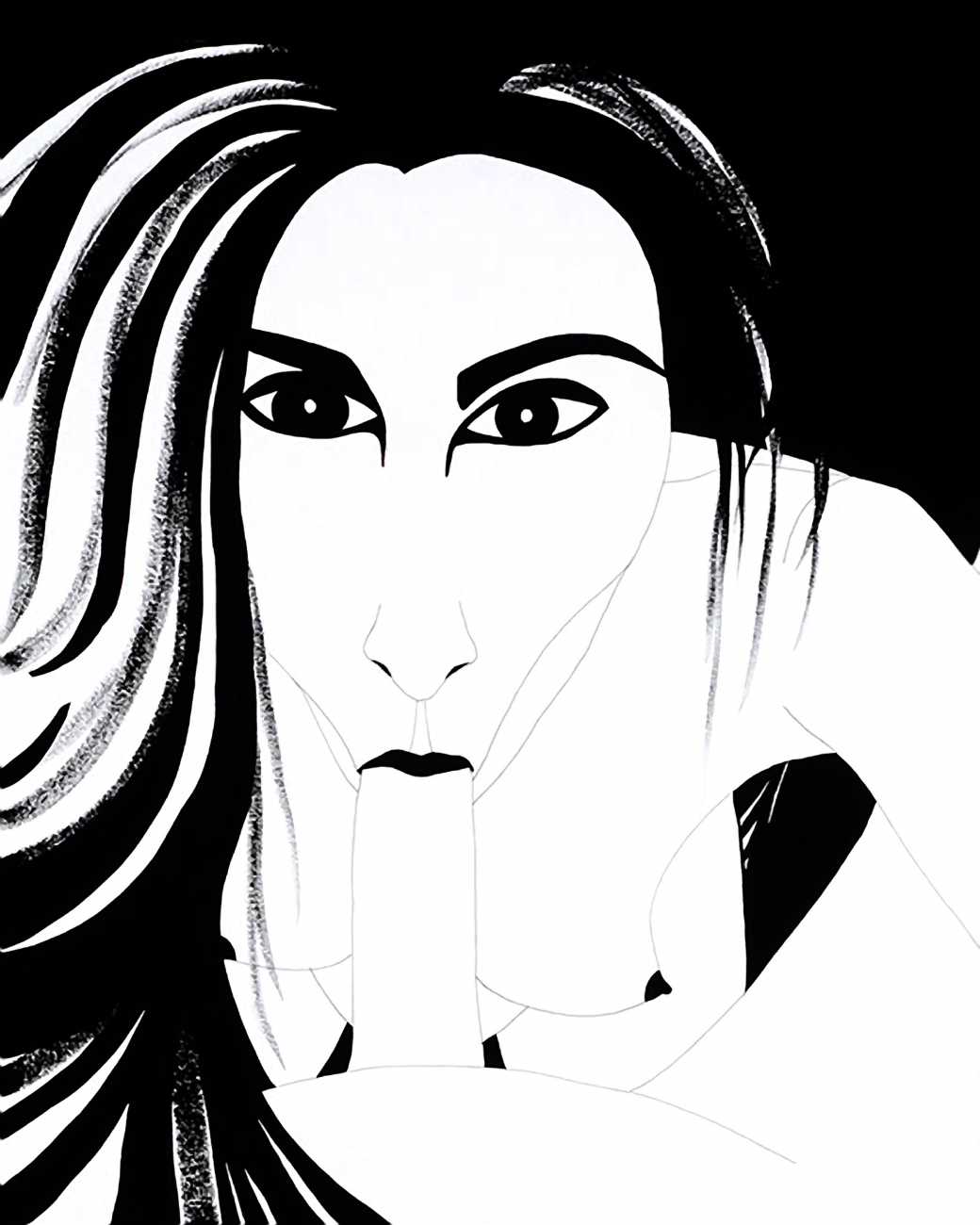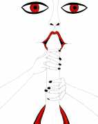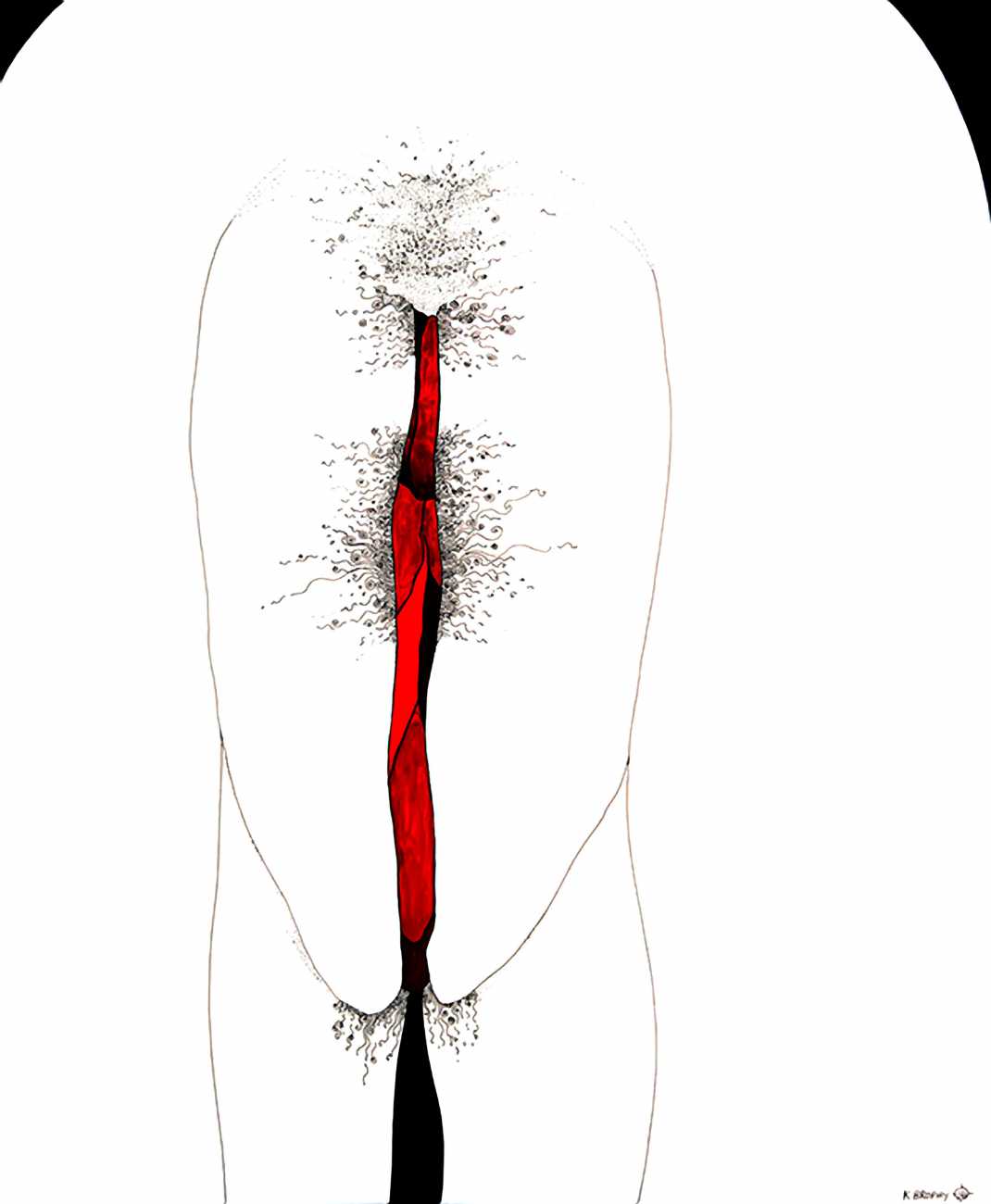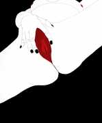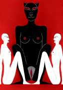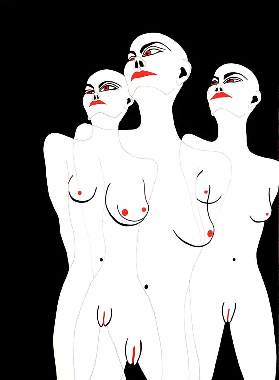 Up to the end of 2015 her drawings were in simple black ink, often clearly autobiographical with captions and poems. Then in 2016 the trademark red appeared, along with stylised celebratory depictions of vulvas and cocks. Since then she has devoted herself to graphics which explore sexual themes in her own terms, often using carefully-composed selfies as reference. She gives these bold, exquisitely delineated compositions that frequently isolate and emphasise the sex organs explanatory titles which match the directness of the artwork – ‘Out and Proud’, ‘Choose Me’, ‘Just Because I’m On My Back Doesn’t Mean I’m Not In Charge’. As she explains, the transition from a Catholic girl’s body shame, to abusive scrutiny as a model, to autonomous self-expression, has been liberating. ‘Screw that,’ she says, ‘I’m showing everything and I own it.’