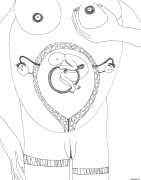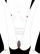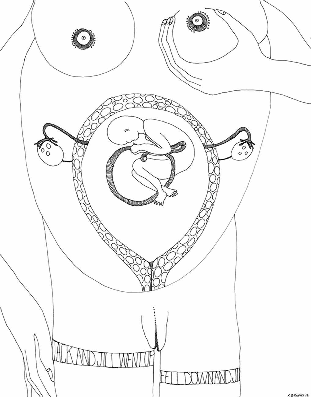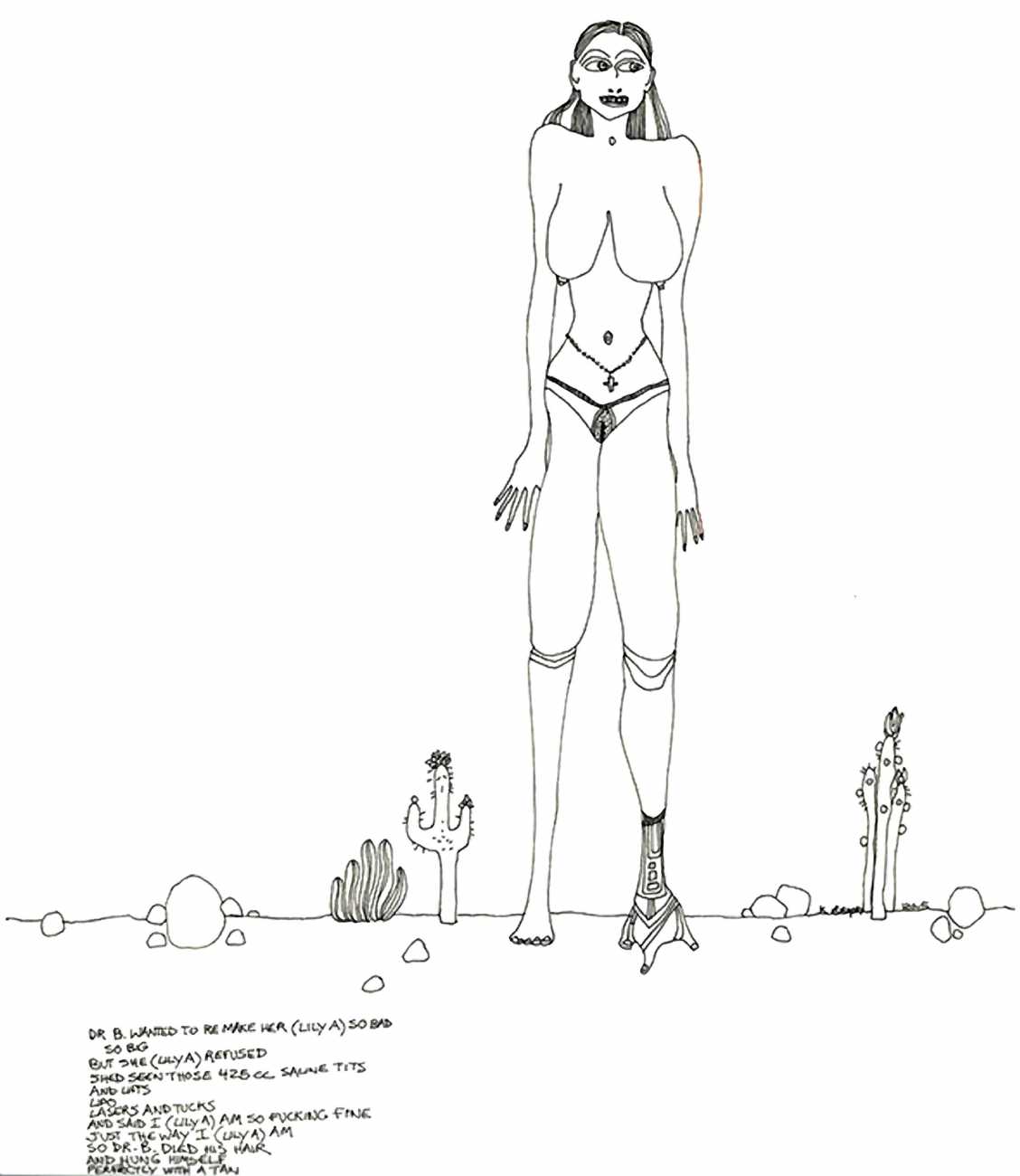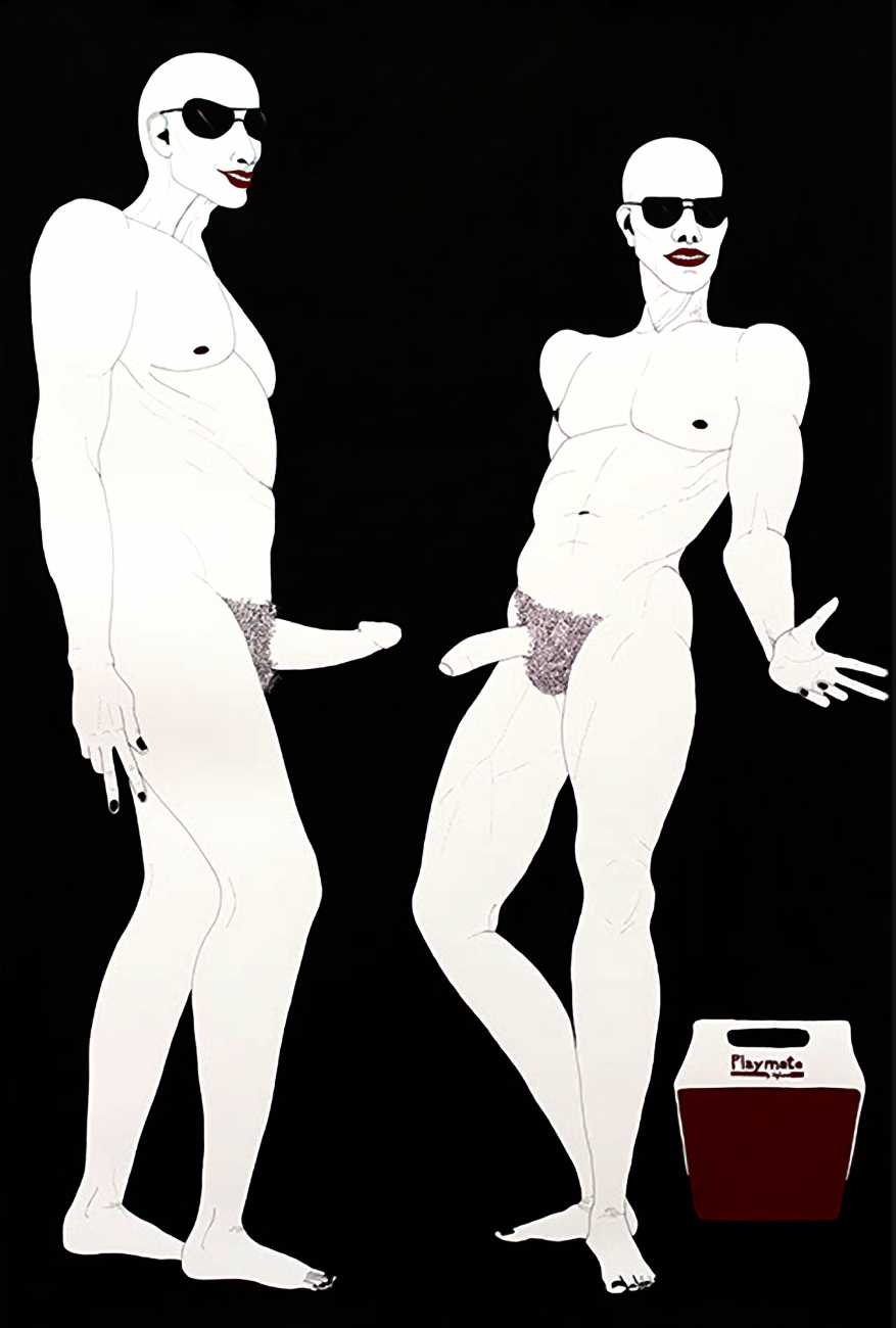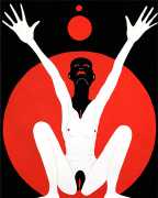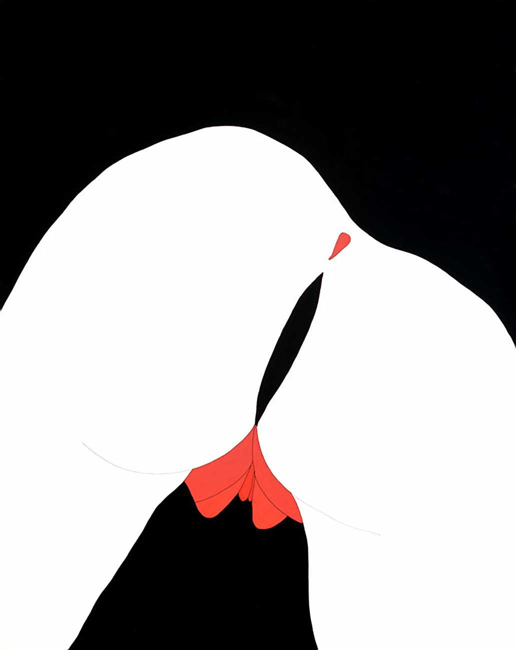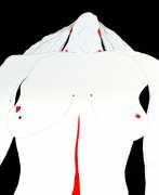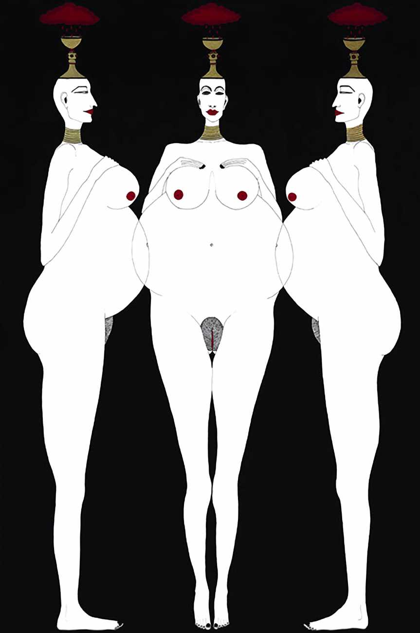 Up to the end of 2015 her drawings were in simple black ink, often clearly autobiographical with captions and poems. Then in 2016 the trademark red appeared, along with stylised celebratory depictions of vulvas and cocks. Since then she has devoted herself to graphics which explore sexual themes in her own terms, often using carefully-composed selfies as reference. She gives these bold, exquisitely delineated compositions that frequently isolate and emphasise the sex organs explanatory titles which match the directness of the artwork – ‘Out and Proud’, ‘Choose Me’, ‘Just Because I’m On My Back Doesn’t Mean I’m Not In Charge’. As she explains, the transition from a Catholic girl’s body shame, to abusive scrutiny as a model, to autonomous self-expression, has been liberating. ‘Screw that,’ she says, ‘I’m showing everything and I own it.’
